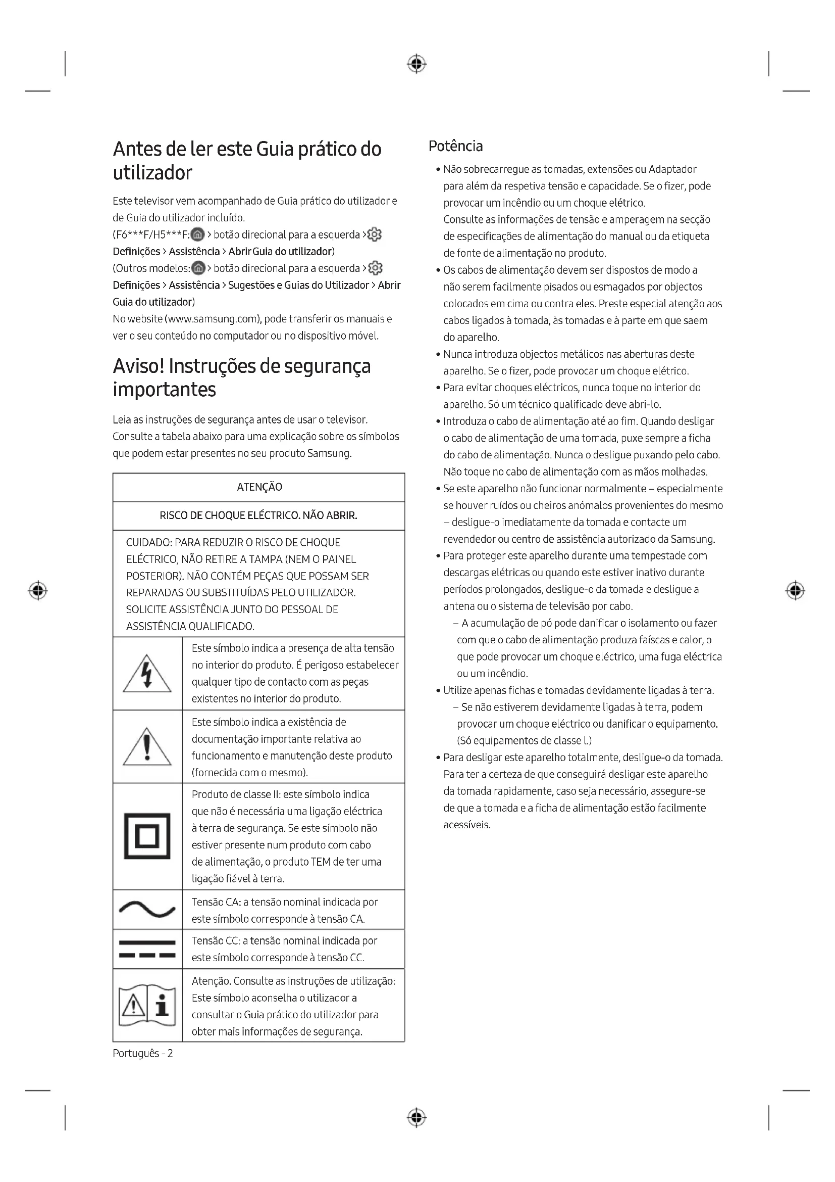 - Para desligar este aparelho totalmente, desligue-o da tomada. Para ter a certeza de que conseguirá desligar este aparelho da tomada rapidamente, caso seja necessário, assegure-se de que a tomada e a ficha de alimentação estão facilmente acessíveis. Antes de ler este Guia prático do utilizador Este televisor vem acompanhado de Guia prático do utilizador e de Guia do utilizador incluído. (F6***F/H5***F: > botão direcional para a esquerda > Definições > Assistência > Abrir Guia do utilizador) (Outros modelos: > botão direcional para a esquerda > Definições > Assistência > Sugestões e Guias do Utilizador > Abrir Guia do utilizador) No website (www.samsung.com), pode transferir os manuais e ver o seu conteúdo no computador ou no dispositivo móvel. Aviso! Instruções de segurança importantes Leia as instruções de segurança antes de usar o televisor. Consulte a tabela abaixo para uma explicação sobre os símbolos que podem estar presentes no seu produto Samsung. ATENÇÃO RISCO DE CHOQUE ELÉCTRICO. NÃO ABRIR. CUIDADO: PARA REDUZIR O RISCO DE CHOQUE ELÉCTRICO, NÃO RETIRE A TAMPA (NEM O PAINEL POSTERIOR). NÃO CONTÉM PEÇAS QUE POSSAM SER REPARADAS OU SUBSTITUÍDAS PELO UTILIZADOR. SOLICITE ASSISTÊNCIA JUNTO DO PESSOAL DE ASSISTÊNCIA QUALIFICADO. Este símbolo indica a presença de alta tensão no interior do produto. É perigoso estabelecer qualquer tipo de contacto com as peças existentes no interior do produto. Este símbolo indica a existência de documentação importante relativa ao funcionamento e manutenção deste produto (fornecida com o mesmo). Produto de classe II: este símbolo indica que não é necessária uma ligação eléctrica à terra de segurança. Se este símbolo não estiver presente num produto com cabo de alimentação, o produto TEM de ter uma ligação fiável à terra. Tensão CA: a tensão nominal indicada por este símbolo corresponde à tensão CA. Tensão CC: a tensão nominal indicada por este símbolo corresponde à tensão CC. Atenção. Consulte as instruções de utilização: Este símbolo aconselha o utilizador a consultar o Guia prático do utilizador para obter mais informações de segurança. Português Português - 2Instalação