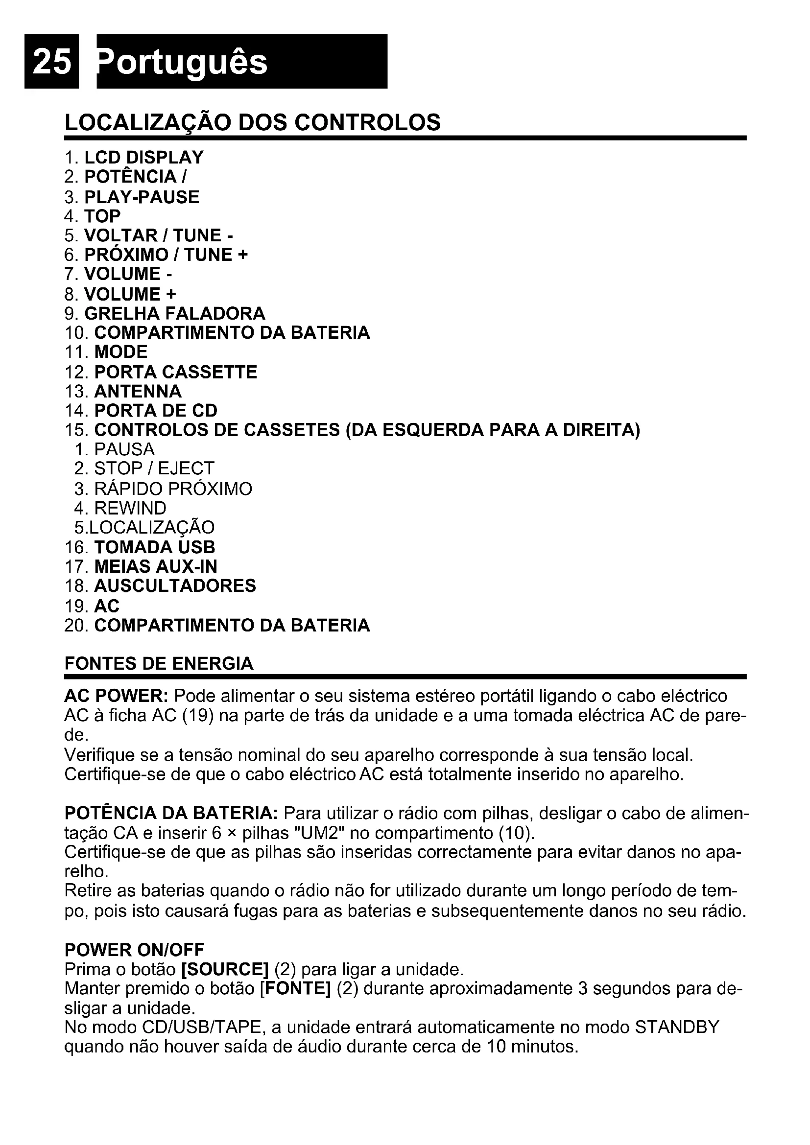AC POWER: Pode alimentar o seu sistema estéreo portátil ligando o cabo eléctrico AC à ficha AC (19) na parte de trás da unidade e a uma tomada eléctrica AC de pare- de. Verifique se a tensão nominal do seu aparelho corresponde à sua tensão local. Certifique-se de que o cabo eléctrico AC está totalmente inserido no aparelho. POTÊNCIA DA BATERIA: Para utilizar o rádio com pilhas, desligar o cabo de alimen- tação CA e inserir 6 × pilhas "UM2" no compartimento (10). Certifique-se de que as pilhas são inseridas correctamente para evitar danos no apa- relho. Retire as baterias quando o rádio não for utilizado durante um longo período de tem- po, pois isto causará fugas para as baterias e subsequentemente danos no seu rádio.