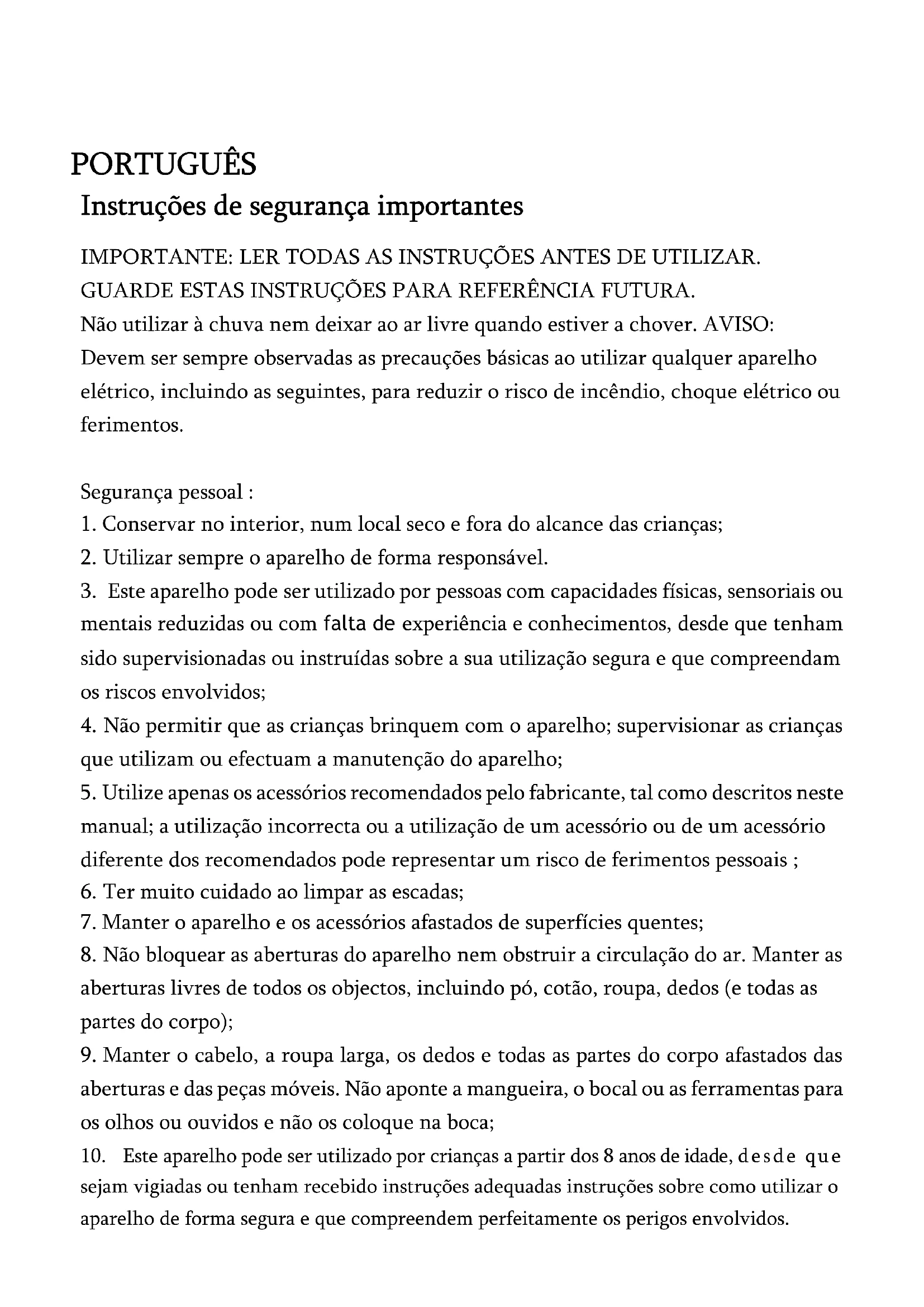 pelo fabricante. Utilização prevista : 1. Este aparelho foi concebido exclusivamente para a aspiração doméstica a seco;2. Não apanhar líquidos nem utilizar em superfícies molhadas;