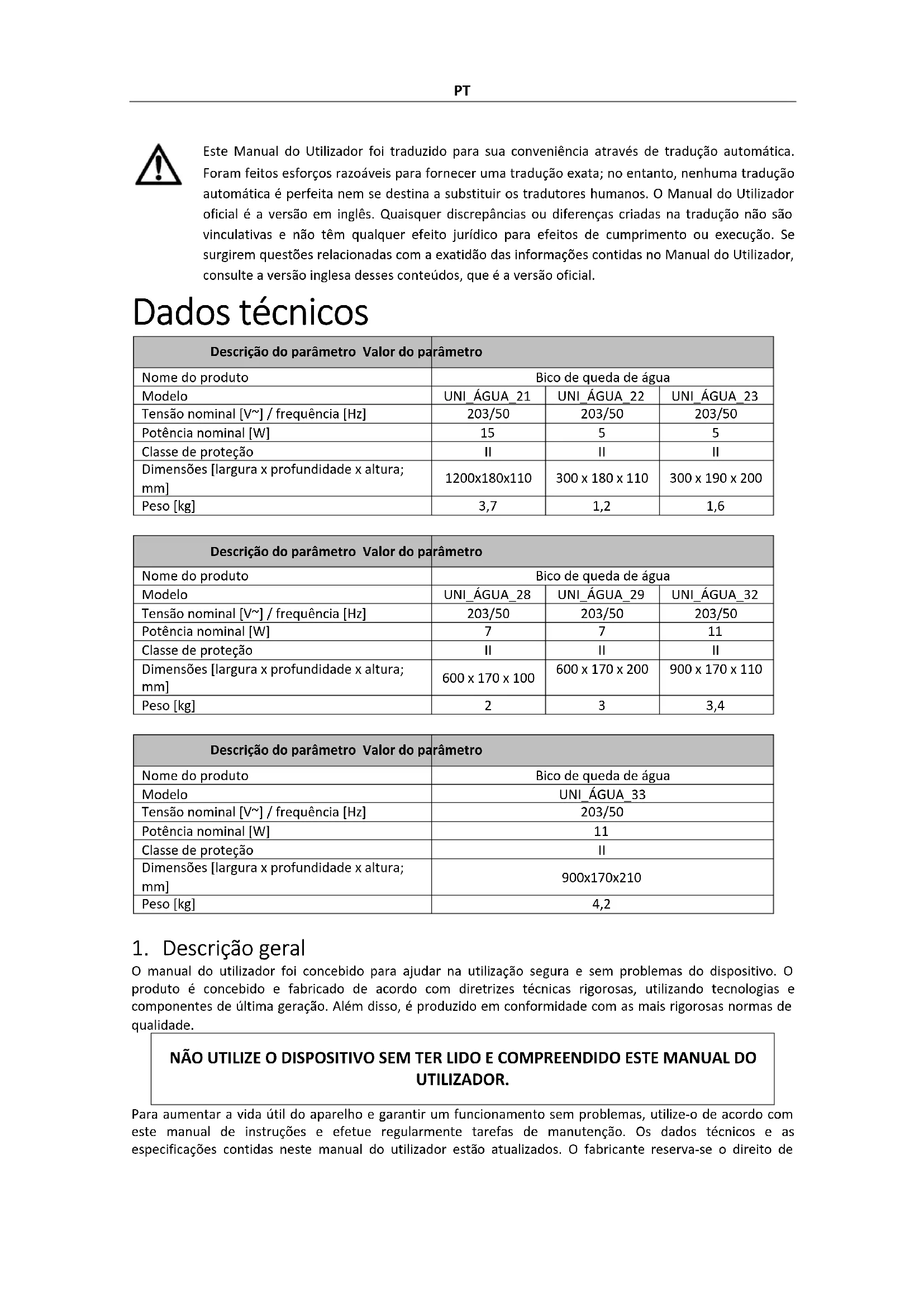 ATENÇÃO! Ler todas as precauções de segurança e todas as instruções. O não cumprimento dos avisos e instruções pode resultar em choque elétrico, incêndio e/ou ferimentos graves ou mesmo morte. Os termos "dispositivo" ou "produto" são utilizados nos avisos e instruções para fazer referência a: Bico de queda de água 2.1. Segurança elétrica Aplica-se à fonte de alimentação a) A ficha deve encaixar na tomada. Não alterar a ficha de nenhum modo. A utilização de fichas originais e de tomadas adequadas reduz o risco de choque elétrico. b) Não tocar no aparelho com as mãos molhadas ou húmidas. c) Utilizar o cabo apenas para o fim a que se destina. Nunca o utilize para transportar o aparelho ou para retirar a ficha de uma tomada. Manter o cabo afastado de fontes de calor, óleo, arestas afiadas ou peças móveis. Cabos danificados ou emaranhados aumentam o risco de choque elétrico. d) Se trabalhar com o aparelho no exterior, certifique-se de que utiliza uma extensão adequada para utilização no exterior. A utilização de um cabo de extensão adequado para utilização no exterior reduz o risco de choque elétrico. e) Se a utilização do aparelho num ambiente húmido não puder ser evitada, deve ser aplicado um dispositivo de corrente residual (RCD). A utilização de um RCD reduz o risco de choque elétrico. 2.2. Segurança no local de trabalho a) Certifique-se de que o local de trabalho está limpo e bem iluminado. Um local de trabalho desarrumado ou mal iluminado pode dar origem a acidentes. Tente pensar no futuro, observar o que se está a passar e usar o bom senso ao trabalhar com o aparelho. b) Se detectar danos ou um funcionamento irregular, desligue imediatamente o aparelho e comunique-o de imediato a um supervisor. c) Se houver dúvidas quanto ao correto funcionamento do aparelho, entre em contato com o serviço de suporte do fabricante. d) Somente o ponto de serviço do fabricante pode reparar o dispositivo. Não tente nenhum reparo sozinho!PT e) Em caso de incêndio, utilize um extintor de pó ou de dióxido de carbono (CO2) (um extintor destinado a ser utilizado em aparelhos elétricos sob tensão) para o apagar. f) Inspecionar regularmente o estado das etiquetas de segurança. Se as etiquetas forem ilegíveis, devem ser substituídas. g) Mantenha este manual disponível para referência futura. Se este aparelho for transmitido a terceiros, o manual deve ser transmitido com ele.