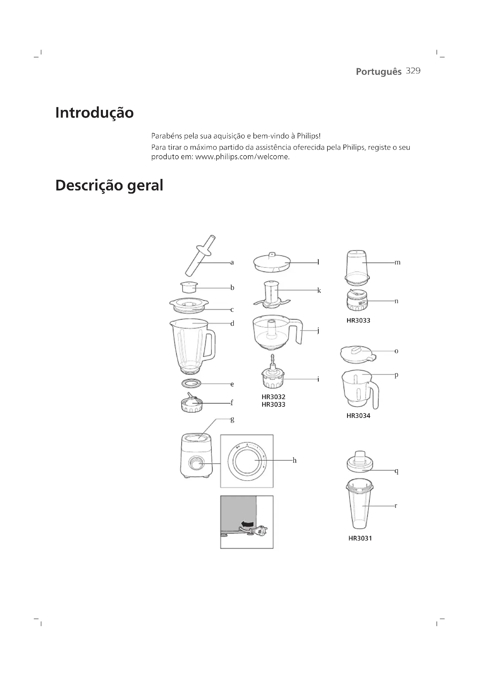 Português Português Introdução Parabéns pela sua aquisição e bem-vindo à Philips! Para tirar o máximo partido da assistência oferecida pela Philips, registe o seu produto em: www.philips.com/welcome. Descrição geral HR3034HR3031 HR3033HR3032 HR3033