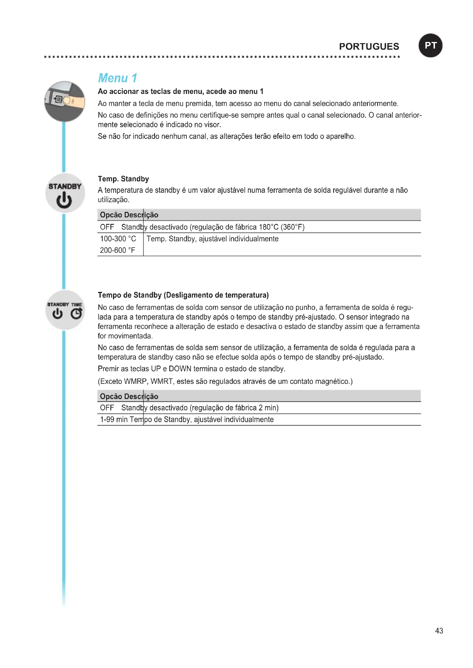 ITALIANO43 Menu 1 Ao accionar as teclas de menu, acede ao menu 1 Aomanterateclademenupremida,temacessoaomenudocanalselecionadoanteriormente. Nocasodedeniçõesnomenucertique-sesempreantesqualocanalselecionado.Ocanalanterior- menteselecionadoéindicadonovisor. Senãoforindicadonenhumcanal,asalteraçõesterãoefeitoemtodooaparelho. Temp. Standby Atemperaturadestandbyéumvalorajustávelnumaferramentadesoldaregulávelduranteanão utilização. Opcão Descrição OFF Standbydesactivado(regulaçãodefábrica180°C(360°F) 100-300°C 200-600°F Temp.Standby,ajustávelindividualmente Tempo de Standby (Desligamento de temperatura) Nocasodeferramentasdesoldacomsensordeutilizaçãonopunho,aferramentadesoldaéregu- ladaparaatemperaturadestandbyapósotempodestandbypré-ajustado.Osensorintegradona ferramentareconheceaalteraçãodeestadoedesactivaoestadodestandbyassimqueaferramenta formovimentada. Nocasodeferramentasdesoldasemsensordeutilização,aferramentadesoldaéreguladaparaa temperaturadestandbycasonãoseefectuesoldaapósotempodestandbypré-ajustado. PremirasteclasUPeDOWNterminaoestadodestandby. (ExcetoWMRP,WMRT,estessãoreguladosatravésdeumcontatomagnético.) Opcão Descrição OFF Standbydesactivado(regulaçãodefábrica2min) 1-99 min TempodeStandby,ajustávelindividualmente