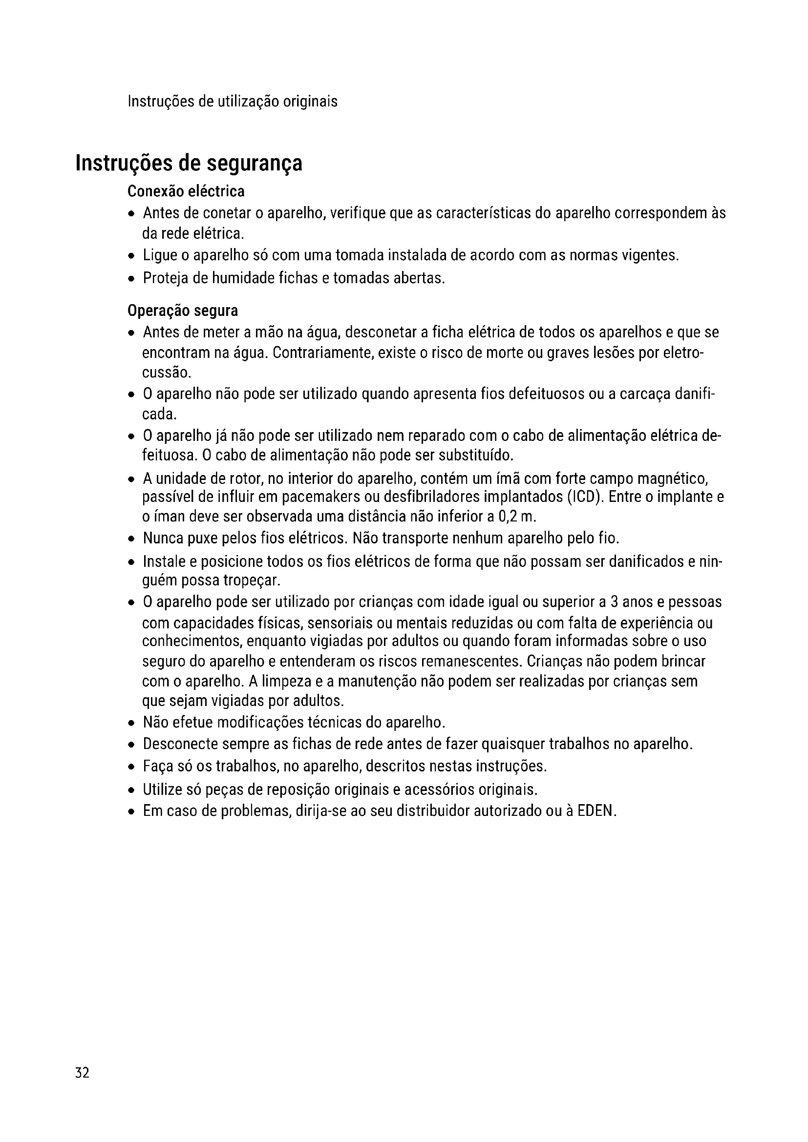 - Em caso de problemas, dirija-se ao seu distribuidor autorizado ou à EDEN.DE