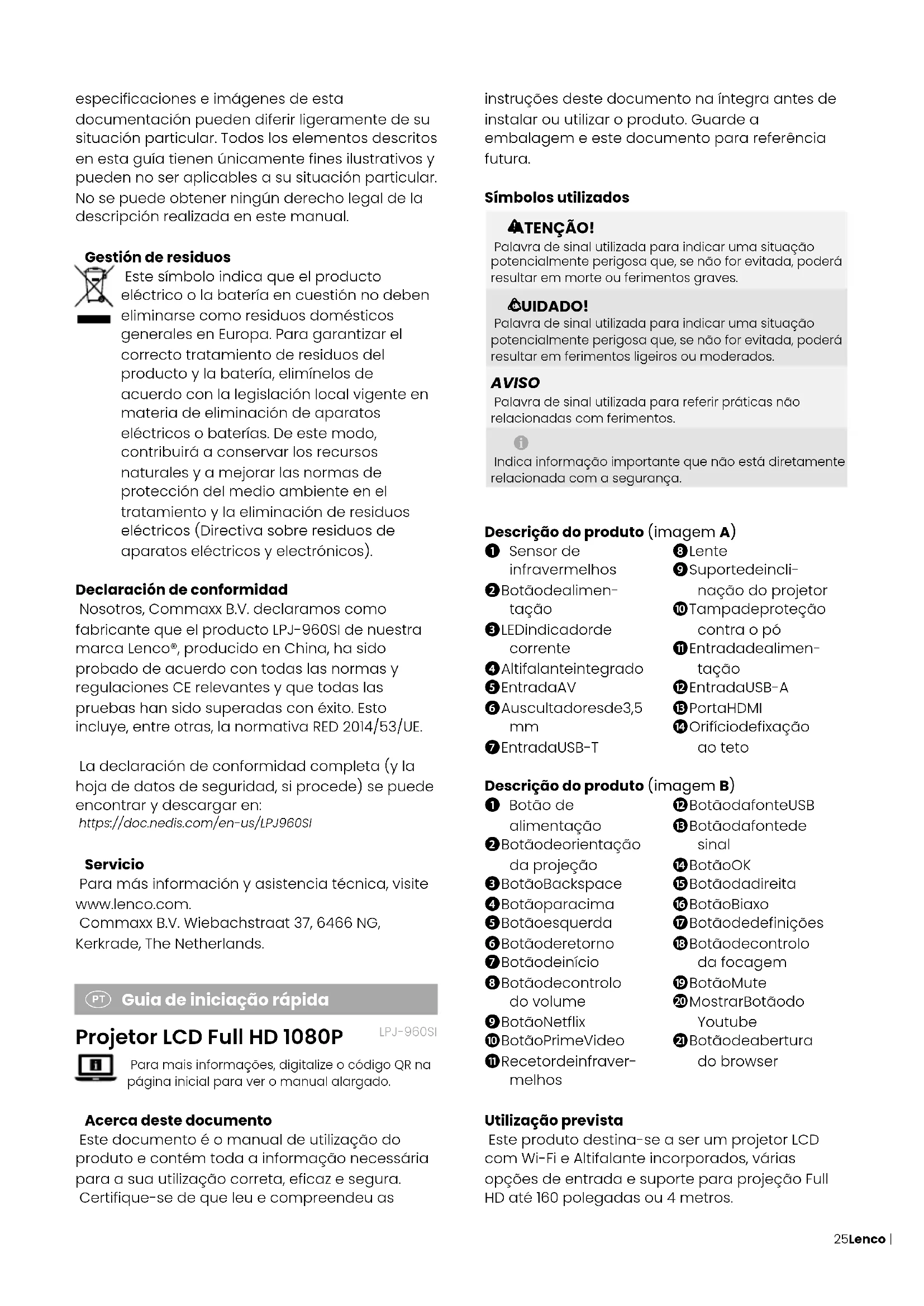 seleccione INICIO en la página de inicio del proyector.25Lenco | Quick start guide instruções deste documento na íntegra antes de instalar ou utilizar o produto. Guarde a embalagem e este documento para referência futura. Símbolos utilizados ATENÇÃO! Palavra de sinal utilizada para indicar uma situação potencialmente perigosa que, se não for evitada, poderá resultar em morte ou ferimentos graves. 1 CUIDADO! Palavra de sinal utilizada para indicar uma situação potencialmente perigosa que, se não for evitada, poderá resultar em ferimentos ligeiros ou moderados. AVISO Palavra de sinal utilizada para referir práticas não relacionadas com ferimentos. Indica informação importante que não está diretamente relacionada com a segurança. Descrição do produto (imagem A)