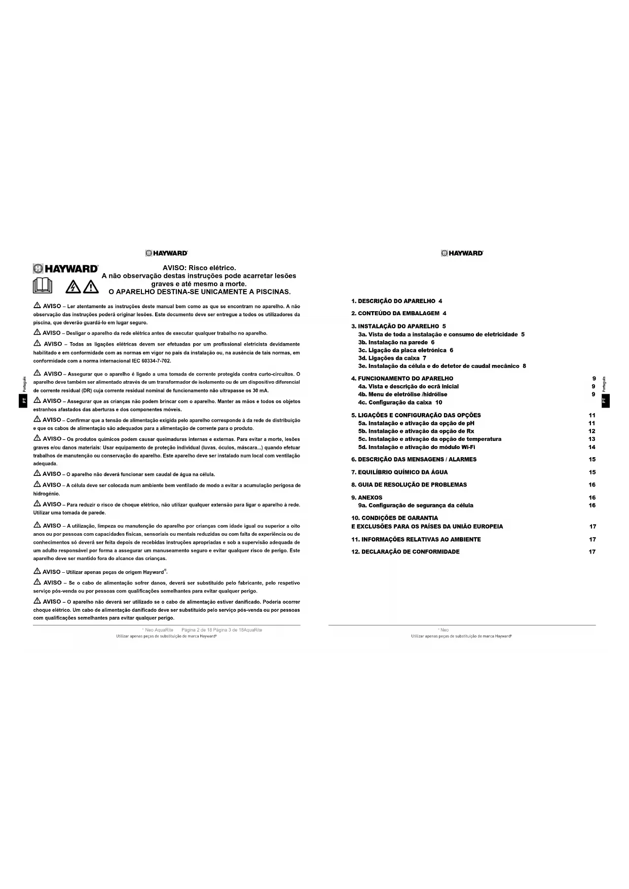 não aceita qualquer responsabilidade por danos diretos ou indiretos resultantes de uma instalação, ligação ou utilização incorreta do produto. Para apresentar qualquer reclamação ao abrigo da garantia e pedir a reparação ou substituição de um artigo, deverá contactar o seu revendedor. A devolução do equipamento à fábrica só poderá ser aceite com o acordo prévio da HAYWARD. As peças de desgaste não são abrangidas pela garantia. As peças de desgaste do eletrolisador de sal a seguir indicadas devem ser mantidas em função da respetiva estimativa de vida útil: - Célula de titânio: 8000 horas - Jogo de juntas (célula de titânio, suporte de sonda): 2 anos - Tubo Santoprene (bomba peristáltica) - Membrana (bomba eletromagnética): 2 anos - Sonda (pH, Rx, condutividade, cloro livre): 1 ano (garantia de 6 meses) Disposição relativa a resíduos de equipamentos elétricos e eletrónicos de prossionais. Em conformidade com a Diretiva 2012/19/UE relativa à gestão dos resíduos de equipamentos elétricos e eletrónicos, este equipamento deve ser depositada num ponto de recolha seletiva. ==> para mais informações, contacte o seu distribuidor. A boa gestão dos equipamentos elétricos e eletrónicos contribui para prevenir danos para o ambiente e para a saúde humana. Em conformidade com o Regulamento (UE) 2023/1542 do Parlamento Europeu e do Conselho, de 12 de julho de 2023, relativo a pilhas e acumuladores e respectivos resíduos, que altera a Diretiva 2008/98/CE e o Regulamento (UE) 2019/2020 e revoga a Diretiva 2006/66/CE, o símbolo que acompanha este manual informa da obrigação de recolha seletiva da pilha incorporada na equipa. Quando a pilha atingir o m da respetiva vida útil, deverá ser retirada e depositada num ponto de recolha seletiva. A página anterior indica como proceder para substituir a pilha. Este producto está em conformidade com as seguintes normas : - Diretiva LVD 2014/35/UE, IEC 60335-1:2020, EN IEC 60335-1:2023+A11:2023, EN 62233:2008 + IPX4, - Diretiva ECM 2014/30/UE, EN IEC55014-1:2021, EN IEC 55014-2:2021, EN IEC 61000-3-2:2019+A1:2021, EN61000-3-3:2013+A1:2019+A2:2021+AC:2022-01. - RoHS 2011/65/UE - Emenda (UE) 2015/863, Regulamento (UE) 2024/1781 - REEE. Em conformidade com o regulamento (UE) 2023/988 relativo à segurança geral dos produtos, a Hayward