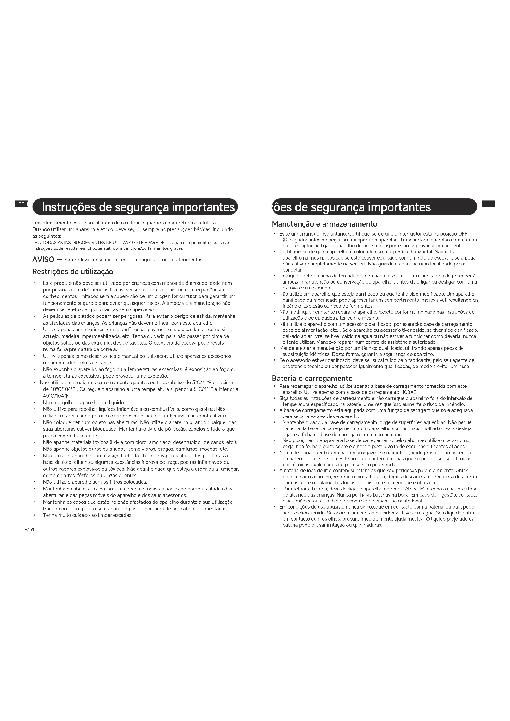 - Wanneer het apparaat volledig is opgeladen, schakelt het na 10 minuten automatisch over naar de standbymodus, met een energieverbruik van 0,8 W (met netwerkstandby) of 0,4 W (zonder netwerkstandby).97 98 PT PT Instruções de segurança importantes Instruções de segurança importantes Leia atentamente este manual antes de o utilizar e guardeo para referência futura. Quando utilizar um aparelho elétrico, deve seguir sempre as precauções básicas, incluindo as seguintes: LEIA TODAS AS INSTRUÇÕES ANTES DE UTILIZAR (ESTE APARELHO). O não cumprimento dos avisos e instruções pode resultar em choque elétrico, incêndio e/ou ferimentos graves. Para reduzir o risco de incêndio, choque elétrico ou ferimentos: AVISO —