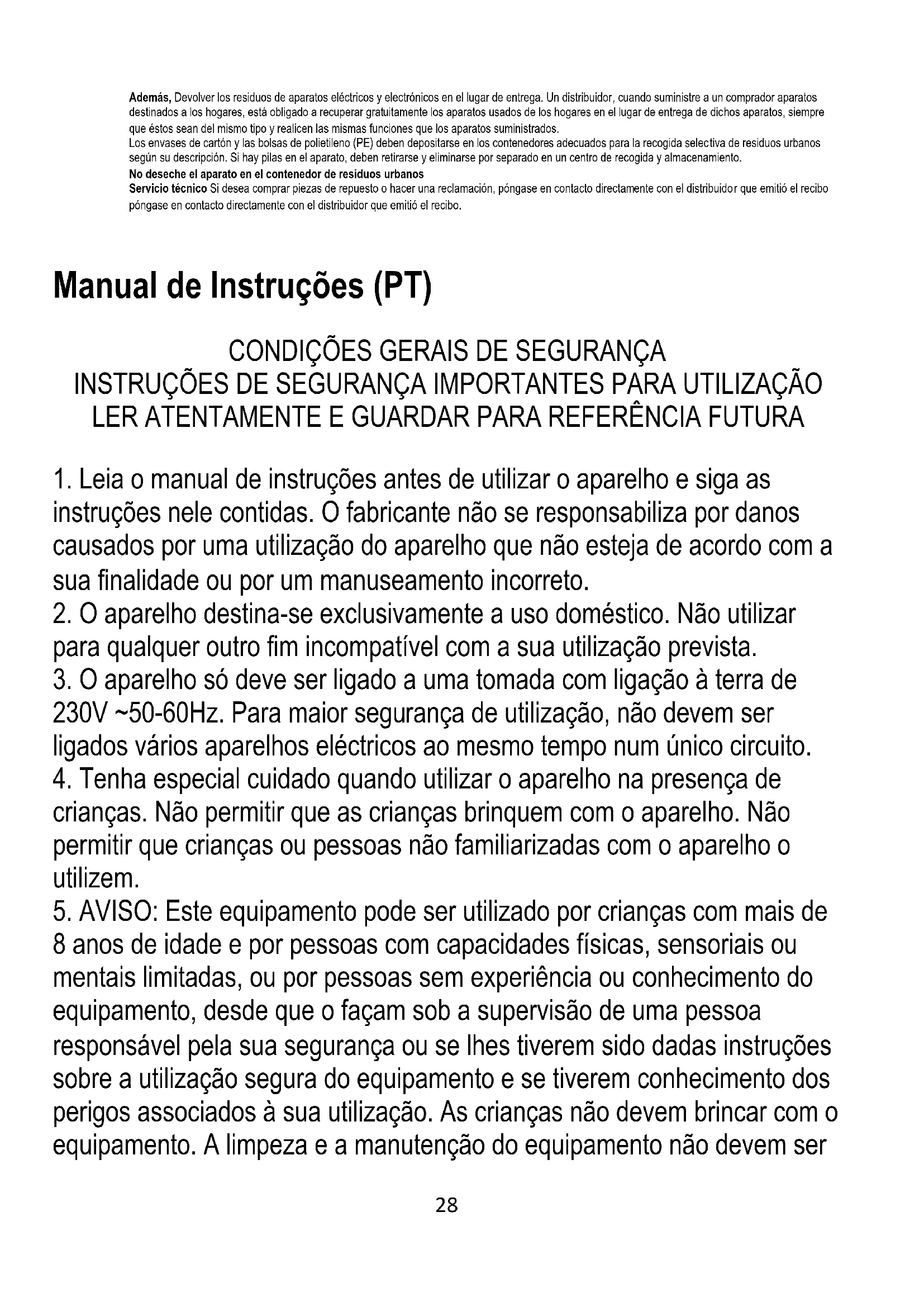8 anos de idade e por pessoas com capacidades físicas, sensoriais ou mentais limitadas, ou por pessoas sem experiência ou conhecimento do equipamento, desde que o façam sob a supervisão de uma pessoa responsável pela sua segurança ou se lhes tiverem sido dadas instruções sobre a utilização segura do equipamento e se tiverem conhecimento dos perigos associados à sua utilização. As crianças não devem brincar com o equipamento. A limpeza e a manutenção do equipamento não devem ser29 efectuadas por crianças, a menos que tenham mais de 8 anos de idade e que a atividade seja realizada sob supervisão.