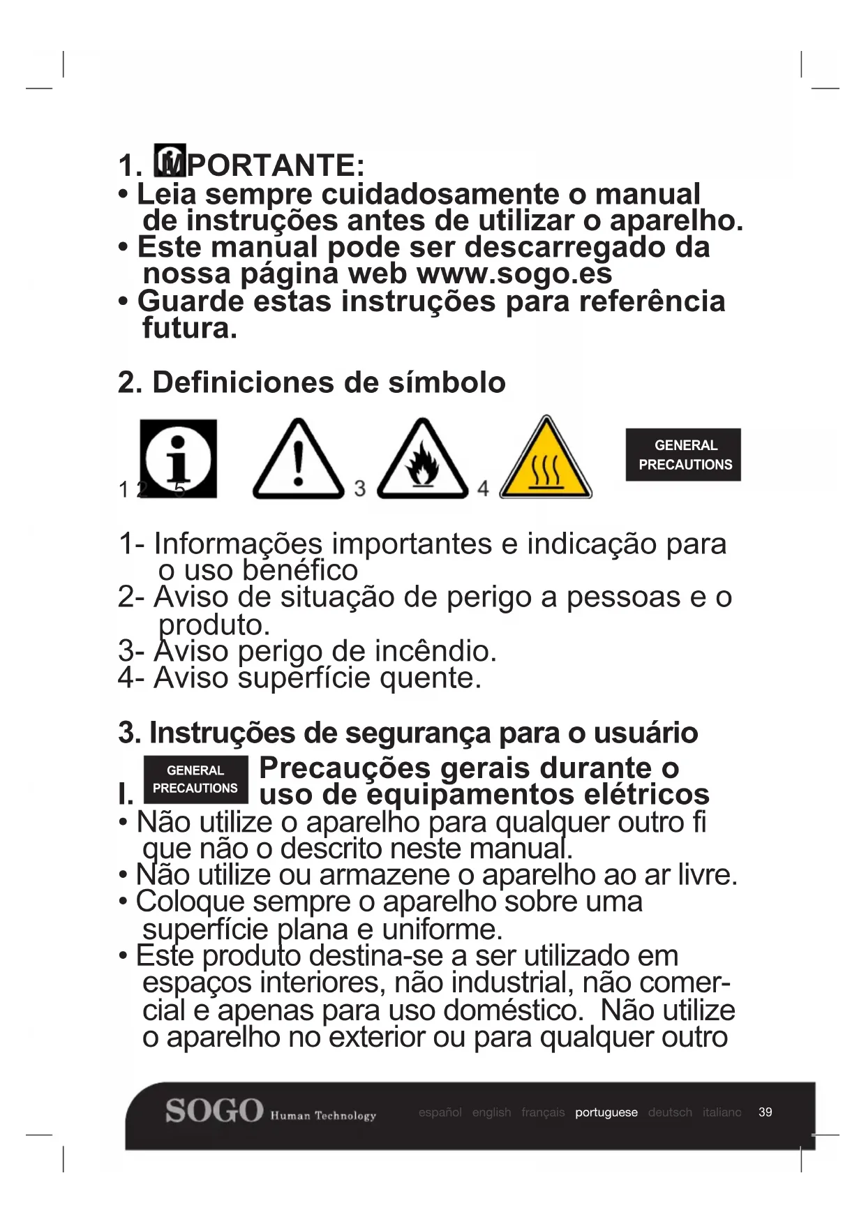 GENERAL PRECAUTIONS Precauções gerais durante o uso de equipamentos elétricos40 español english français portuguese deutsch italiano fim. A utilização indevida ou o manuseamento incorreto podem causar problemas no aparel- ho e causar lesões ao utilizador.