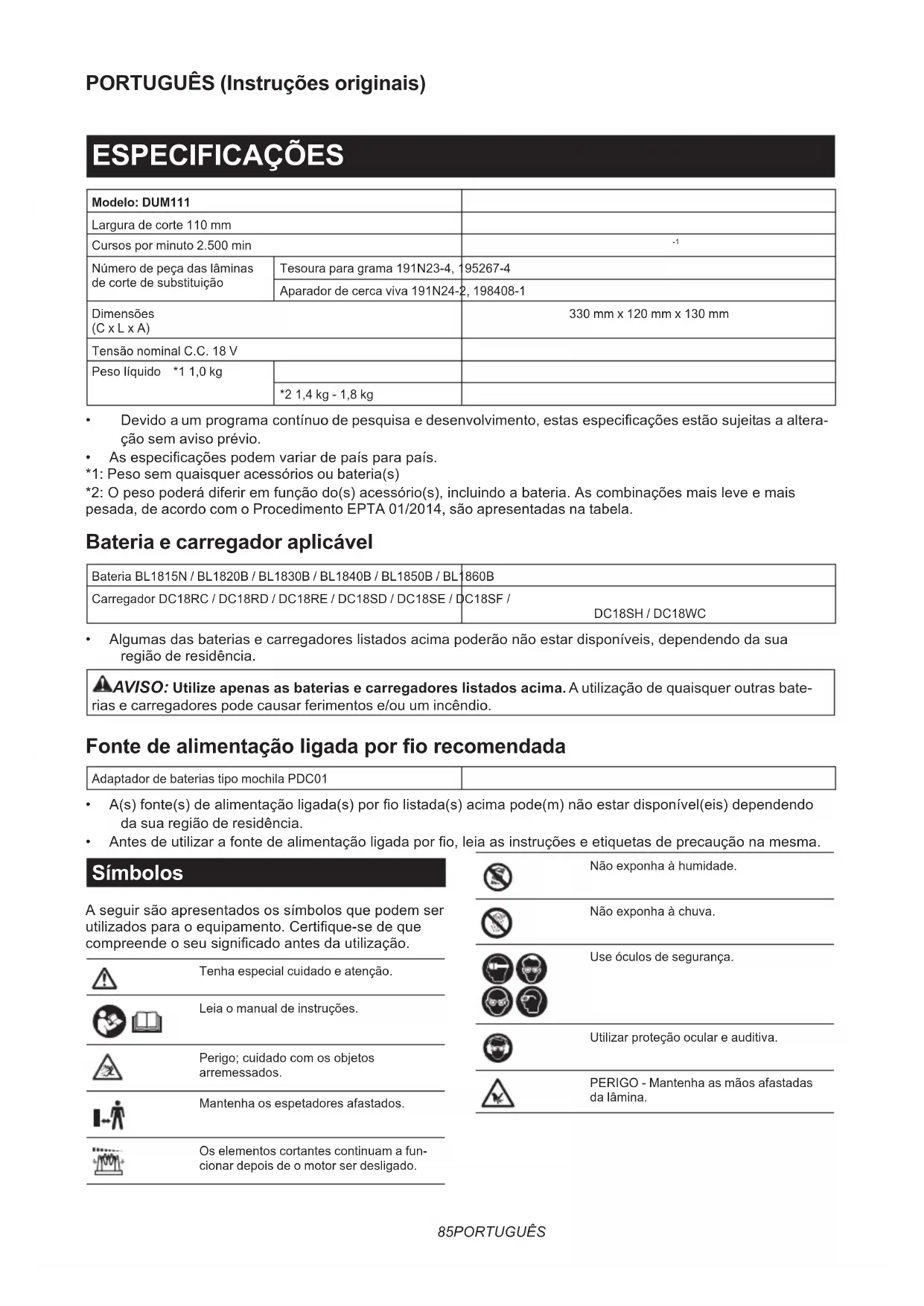 - Antesdeutilizarafontedealimentaçãoligadaporo,leiaasinstruçõeseetiquetasdeprecauçãonamesma. Símbolos Aseguirsãoapresentadosossímbolosquepodemser utilizadosparaoequipamento.Certique-sedeque compreendeoseusignicadoantesdautilização. Tenha especial cuidado e atenção. Leia o manual de instruções. Perigo;cuidadocomosobjetos arremessados. Mantenha os espetadores afastados. Os elementos cortantes continuam a fun- cionar depois de o motor ser desligado. Nãoexponhaàhumidade. Nãoexponhaàchuva. Use óculos de segurança. Utilizar proteção ocular e auditiva. PERIGO - Mantenha as mãos afastadas da lâmina.86 PORTUGUÊS Ni-MH Li-ion ApenasparapaísesdaUE Devidoàpresençadecomponentes perigososnoequipamento,osresíduos de equipamentos elétricos e eletrónicos, acumuladores e baterias podem ter um impacto negativo no meio ambiente e na saúde humana. Não elimine aparelhos elétricos e eletróni- cosoubateriasjuntamentecomresíduos domésticos! De acordo com a Diretiva europeia relativa aosresíduosdeequipamentoselétricose eletrónicos, acumuladores e baterias, bem comoarespetivaadaptaçãoàlegislação nacional,osresíduosdeequipamentos elétricos e eletrónicos, acumuladores e baterias devem ser armazenados separa- damente e entregues num ponto de reco- lhaseparadopararesíduosmunicipais, que opere de acordo com os regulamentos de proteção ambiental. Taléindicadopelosímbolodecontentor de lixo com rodas barrado com uma cruz colocado no equipamento. Níveldepotênciasonoragarantidode acordocomaDiretivaderuídoambiente da UE. Níveldepotênciasonoradeacordocomo RegulamentodecontrolodoruídodeNSW daAustrália Utilização a que se destina A ferramenta destina-se ao corte de bordos de relvados ou rebentos. Ruído AcaracterísticadonívelderuídoAdeterminadodeacordocomaEN62841-4-5: DUM111 com lâmina de corte para tesoura para grama instalada Nível de pressão sonora