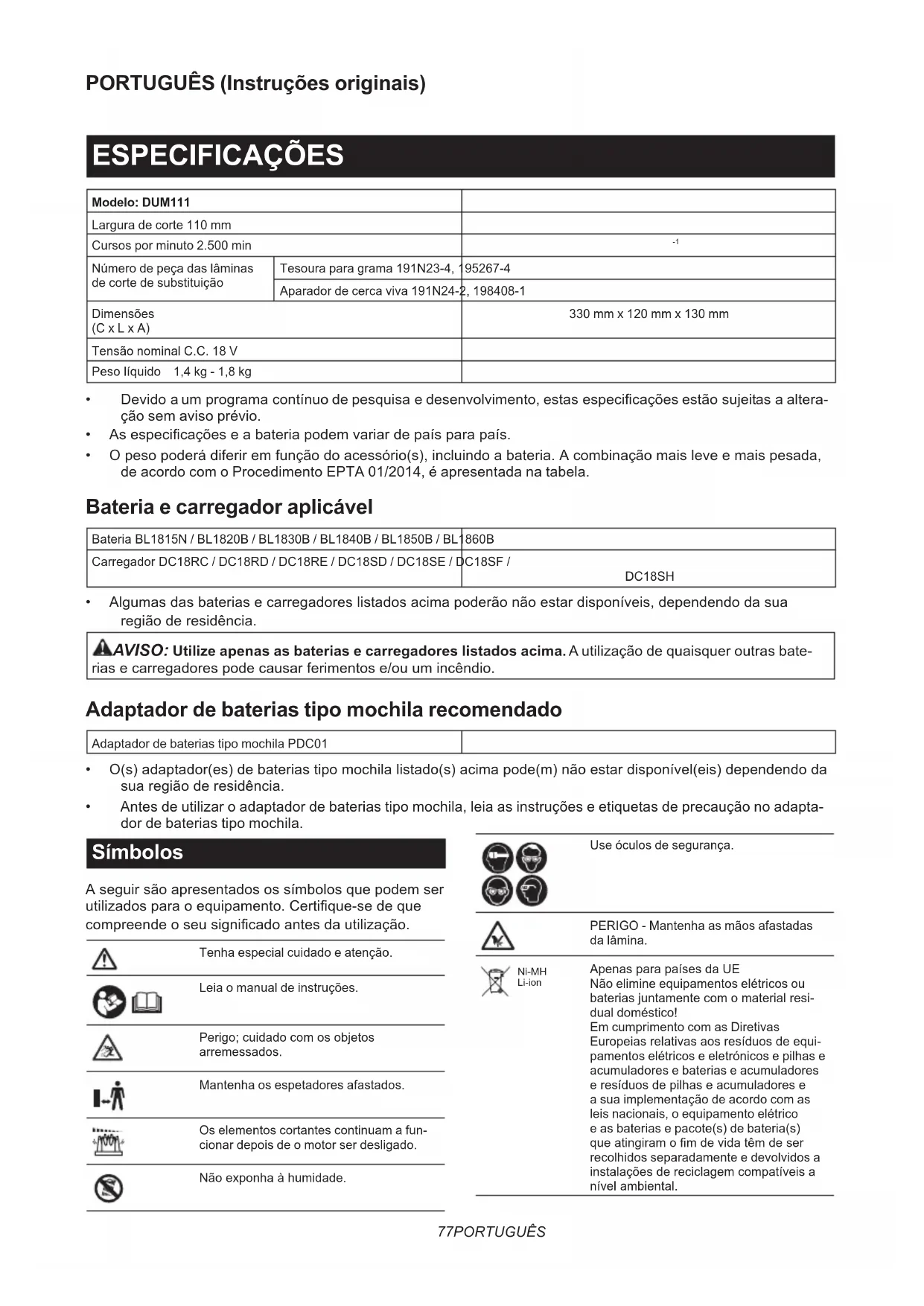 - Antes de utilizar o adaptador de baterias tipo mochila, leia as instruções e etiquetas de precaução no adapta- dor de baterias tipo mochila. Símbolos Aseguirsãoapresentadosossímbolosquepodemser utilizadosparaoequipamento.Certique-sedeque compreendeoseusignicadoantesdautilização. Tenha especial cuidado e atenção. Leia o manual de instruções. Perigo;cuidadocomosobjetos arremessados. Mantenha os espetadores afastados. Os elementos cortantes continuam a fun- cionar depois de o motor ser desligado. Nãoexponhaàhumidade. Use óculos de segurança. PERIGO - Mantenha as mãos afastadas da lâmina. Ni-MH Li-ion ApenasparapaísesdaUE Não elimine equipamentos elétricos ou bateriasjuntamentecomomaterialresi- dual doméstico! Em cumprimento com as Diretivas Europeiasrelativasaosresíduosdeequi- pamentos elétricos e eletrónicos e pilhas e acumuladores e baterias e acumuladores eresíduosdepilhaseacumuladorese a sua implementação de acordo com as leis nacionais, o equipamento elétrico e as baterias e pacote(s) de bateria(s) queatingiramomdevidatêmdeser recolhidos separadamente e devolvidos a instalaçõesdereciclagemcompatíveisa nívelambiental.78 PORTUGUÊS Utilização a que se destina A ferramenta destina-se ao corte de bordos de relvados ou rebentos. Ruído AcaracterísticadonívelderuídoAdeterminadode acordo com a EN50636-2-94: DUM111 com lâmina de corte para tesoura para grama instalada Níveldepressãoacústica(L