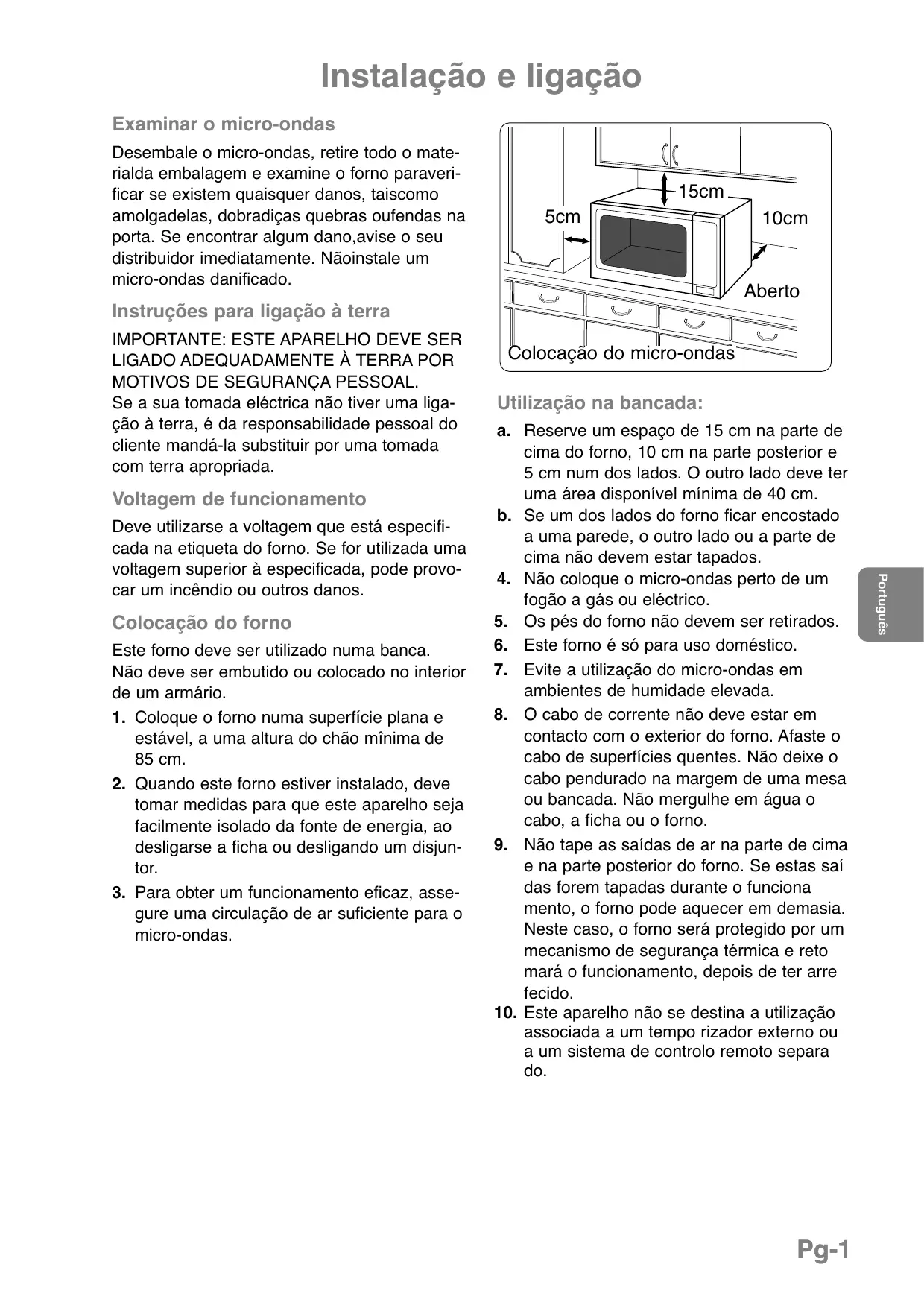 associada a um tempo rizador externo ou a um sistema de controlo remoto separa do. Pg-1 Português Deve utilizarse a voltagem que está especificada na etiqueta do forno. Se for utilizada uma voltagem superior à especificada, pode provocar um incêndio ou outros danos. Colocação do micro-ondas Instalação e ligação ATENÇÃO Informações importantes de segurança