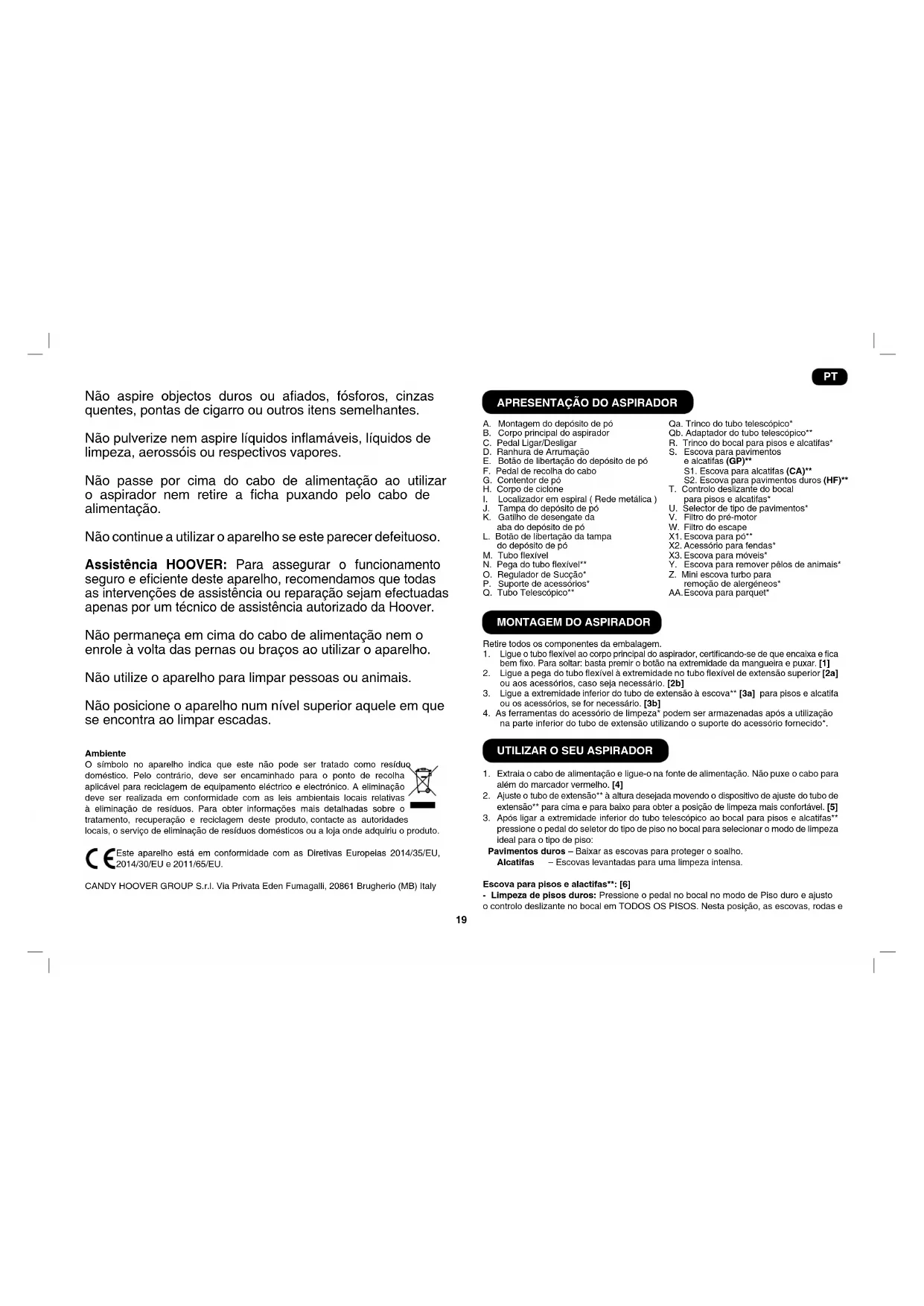 Não aspire objectos duros ou aados, fósforos, cinzas quentes, pontas de cigarro ou outros itens semelhantes. Não pulverize nem aspire líquidos inamáveis, líquidos de limpeza, aerossóis ou respectivos vapores. Não passe por cima do cabo de alimentação ao utilizar o aspirador nem retire a cha puxando pelo cabo de alimentação. Não continue a utilizar o aparelho se este parecer defeituoso. Assistência HOOVER: Para assegurar o funcionamento seguro e eciente deste aparelho, recomendamos que todas as intervenções de assistência ou reparação sejam efectuadas apenas por um técnico de assistência autorizado da Hoover. Não permaneça em cima do cabo de alimentação nem o enrole à volta das pernas ou braços ao utilizar o aparelho. Não utilize o aparelho para limpar pessoas ou animais. Não posicione o aparelho num nível superior aquele em que se encontra ao limpar escadas. Ambiente O símbolo no aparelho indica que este não pode ser tratado como resíduo doméstico. Pelo contrário, deve ser encaminhado para o ponto de recolha aplicável para reciclagem de equipamento eléctrico e electrónico. A eliminação deve ser realizada em conformidade com as leis ambientais locais relativas à eliminação de resíduos. Para obter informações mais detalhadas sobre o tratamento, recuperação e reciclagem deste produto, contacte as autoridades locais, o serviço de eliminação de resíduos domésticos ou a loja onde adquiriu o produto. Este aparelho está em conformidade com as Diretivas Europeias 2014/35/EU, 2014/30/EU e 2011/65/EU. CANDY HOOVER GROUP S.r.l. Via Privata Eden Fumagalli, 20861 Brugherio (MB) Italy
