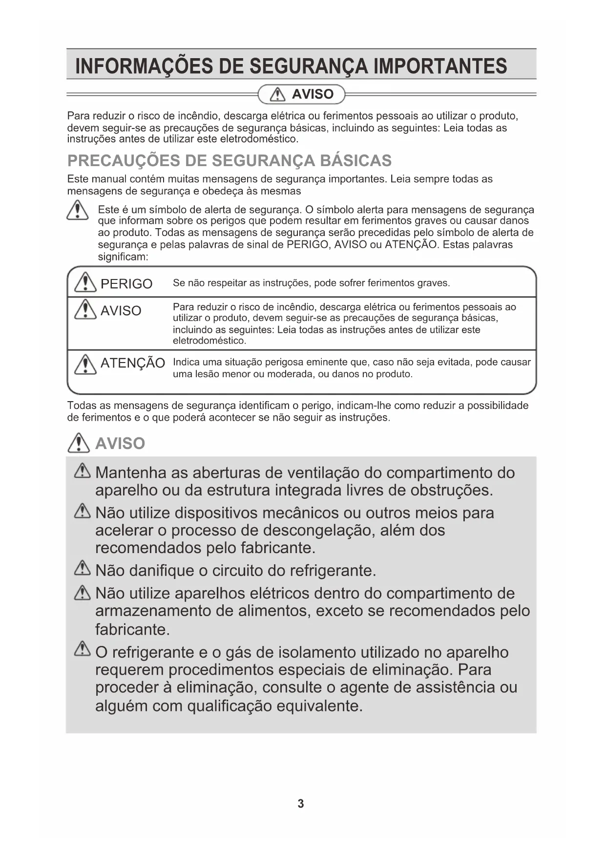 AVISOS IMPORTANTES ANTES DE CONTACTAR A ASSISTÊNCIAINFORMAÇÕES DE SEGURANÇA IMPORTANTES Mantenha as aberturas de ventilação do compartimento do aparelho ou da estrutura integrada livres de obstruções. Não utilize dispositivos mecânicos ou outros meios para acelerar o processo de descongelação, além dos recomendados pelo fabricante. Não danifique o circuito do refrigerante. Não utilize aparelhos elétricos dentro do compartimento de armazenamento de alimentos, exceto se recomendados pelo fabricante. O refrigerante e o gás de isolamento utilizado no aparelho requerem procedimentos especiais de eliminação. Para proceder à eliminação, consulte o agente de assistência ou alguém com qualificação equivalente. AVISO PRECAUÇÕES DE SEGURANÇA BÁSICAS Este manual contém muitas mensagens de segurança importantes. Leia sempre todas as mensagens de segurança e obedeça às mesmas Este é um símbolo de alerta de segurança. O símbolo alerta para mensagens de segurança que informam sobre os perigos que podem resultar em ferimentos graves ou causar danos ao produto. Todas as mensagens de segurança serão precedidas pelo símbolo de alerta de segurança e pelas palavras de sinal de PERIGO, AVISO ou ATENÇÃO. Estas palavras significam: PERIGO AVISO ATENÇÃO Se não respeitar as instruções, pode sofrer ferimentos graves.Para reduzir o risco de incêndio, descarga elétrica ou ferimentos pessoais ao utilizar o produto, devem seguir-se as precauções de segurança básicas, incluindo as seguintes: Leia todas as instruções antes de utilizar este eletrodoméstico.Indica uma situação perigosa eminente que, caso não seja evitada, pode causar uma lesão menor ou moderada, ou danos no produto. Todas as mensagens de segurança identificam o perigo, indicam-lhe como reduzir a possibilidade de ferimentos e o que poderá acontecer se não seguir as instruções. AVISO Para reduzir o risco de incêndio, descarga elétrica ou ferimentos pessoais ao utilizar o produto, devem seguir-se as precauções de segurança básicas, incluindo as seguintes: Leia todas as instruções antes de utilizar este eletrodoméstico. 3Se o gás utilizado for o R600a