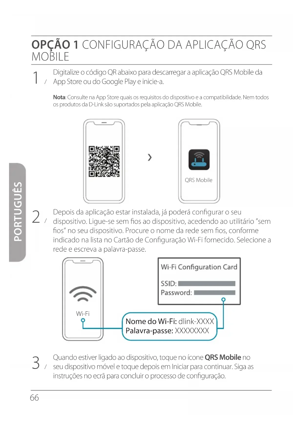 RÁPIDA www.dlink.com dlink-xxxxLigarxxxxxxxxxxxxxxxxxxNome do Wi-Fi: dlink-XXXXPalavra-passe: XXXXXXXX http://dlinkap.local./ II69 PORTUGUÊS POSICIONAMENTO Uma barra de cor âmbar indica um sinal fraco. Desloque o extensor para junto do router para melhorar a qualidade do sinal. Certifique- se de que o seu extensor está colocado num ambiente aberto. Coloque o extensor na área de alcance do seu router. Verifique o indicador LED no seu extensor para garantir uma ligação adequada. As barras verdes indicam um sinal forte. < 1 m < 1 m < 1 m < 1 m Nota: Consulte o Manual de Utilizador para obter informações sobre o significado dos LED do dispositivo específico.70 PORTUGUÊS PERGUNTAS FREQUENTES Por que não consigo ligar o meu router sem os ou por que motivo a minha ligação sem os cai? Verifique se o seu extensor está dentro do alcance do seu router. Tente ligá-lo num local próximo do router e verifique se o LED de Sinal acende em verde fixo. Observe que, ao encaminhar um sinal sem fios a partir de um router ou ponto de acesso, os dispositivos ligados ao extensor não terão a mesma velocidade/taxa de transferência que os ligados diretamente ao router. Como altero as congurações sem os do meu extensor? Para alterar o Nome da Rede Wi-Fi (SSID) e modificar a segurança (palavra- passe de Wi-Fi), aceda às definições sem fios através de: