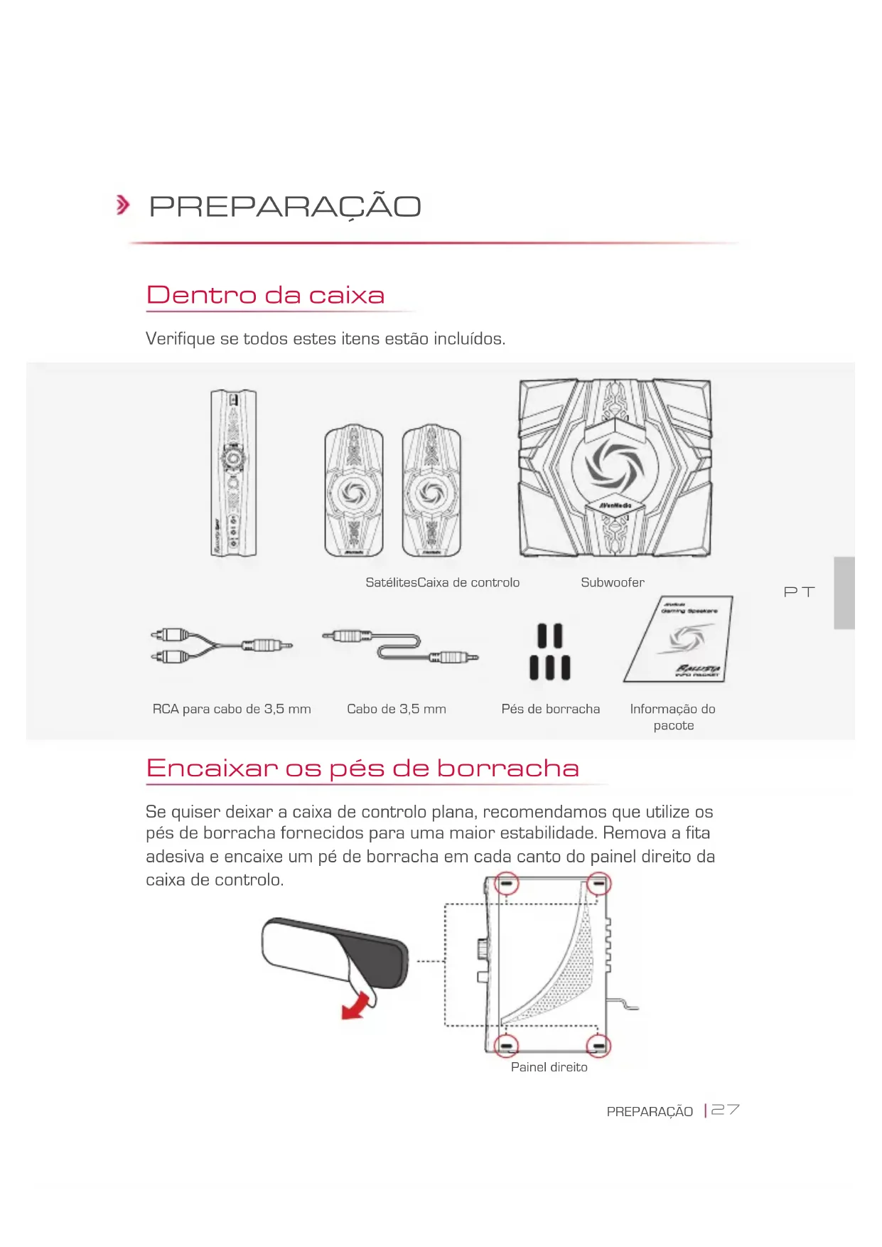 OUT Conecte sus satélites, subwoofer, consola de juego y otras fuentes de 1. audio a la caja de control. Conecte la caja de control a una toma de corriente y coloque el 2. interruptor de alimentación en la posición de encendido. Gire el botón de 3. alimentación/volumen para encender el Ballista Unity. Consola de juego Reproductor de MP3/Tableta Subwoofer Satélites (No incluido) Panel trasero Panel delantero27 PREPARAÇÃO Subwoofer RCA para cabo de 3,5 mm Encaixar os pés de borracha Se quiser deixar a caixa de controlo plana, recomendamos que utilize os pés de borracha fornecidos para uma maior estabilidade. Remova a fita adesiva e encaixe um pé de borracha em cada canto do painel direito da caixa de controlo. Informação do pacote SatélitesCaixa de controlo Cabo de 3,5 mm Painel direito Pés de borracha PREPARAÇÃO Dentro da caixa Verifique se todos estes itens estão incluídos. PT28 PREPARAÇÃO Vista geral da caixa de controlo 1 Indicador de alimentação 8 Entrada de áudio esquerda 2 Botão do volume/alimentação 9 Entrada de áudio direita 3 Botão de graves 10 Saída do altifalante esquerda 4 Saída do auscultador 11 Saída do altifalante direita 5 Entrada do microfone 12 Saída do subwoofer 6 Entrada de linha 13 Interruptor de alimentação 7 Saída do microfone 14 Entrada da alimentação CA