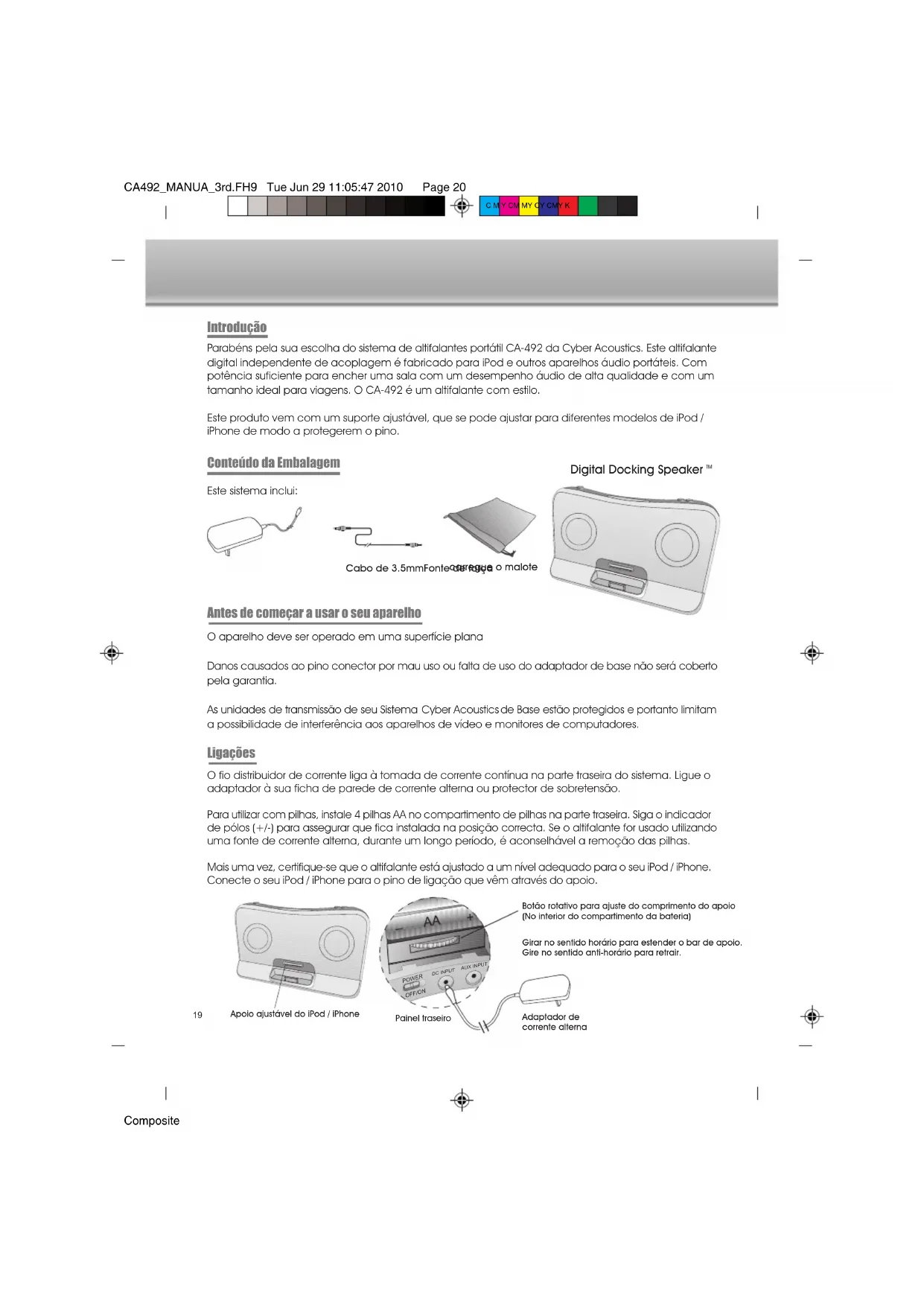 Asegúrese que el iPod/iPhone queda perfectamente encajado en la ranura y que hace un buen contacto con el pin conector.CA492_MANUA_3rd.FH9 Tue Jun 29 11:05:47 2010 Page 20 Composite C M Y CM MY CY CMY K carregue o malote Parabéns pela sua escolha do sistema de altifalantes portátil CA-492 da Cyber Acoustics. Este altifalante digital independente de acoplagem é fabricado para iPod e outros aparelhos áudio portáteis. Com potência suficiente para encher uma sala com um desempenho áudio de alta qualidade e com um tamanho ideal para viagens. O CA-492 é um altifalante com estilo. Este produto vem com um suporte ajustável, que se pode ajustar para diferentes modelos de iPod / iPhone de modo a protegerem o pino. Introdução O aparelho deve ser operado em uma superfície plana Danos causados ao pino conector por mau uso ou falta de uso do adaptador de base não será coberto pela garantia. As unidades de transmissão de seu Sistema Cyber Acoustics de Base estão protegidos e portanto limitam a possibilidade de interferência aos aparelhos de vídeo e monitores de computadores. Antes de começar a usar o seu aparelho Digital Docking Speaker