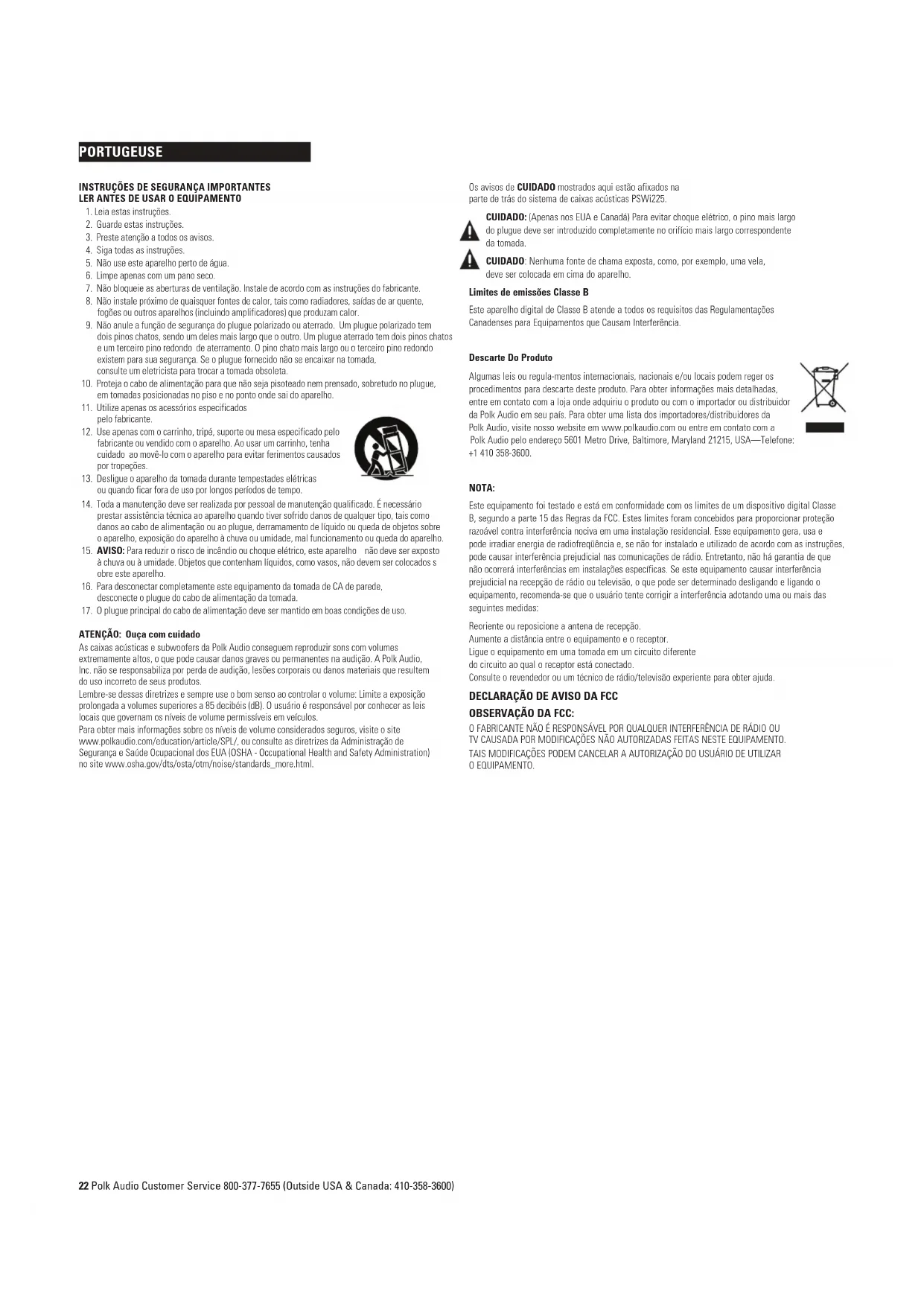 ATENÇÃO: Ouça com cuidado As caixas acústicas e subwoofers da Polk Audio conseguem reproduzir sons com volumes extremamente altos, o que pode causar danos graves ou permanentes na audição. A Polk Audio, Inc. não se responsabiliza por perda de audição, lesões corporais ou danos materiais que resultem do uso incorreto de seus produtos. Lembre-se dessas diretrizes e sempre use o bom senso ao controlar o volume: Limite a exposição prolongada a volumes superiores a 85 decibéis (dB). O usuário é responsável por conhecer as leis locais que governam os níveis de volume permissíveis em veículos. Para obter mais informações sobre os níveis de volume considerados seguros, visite o site www.polkaudio.com/education/article/SPL/, ou consulte as diretrizes da Administração de Segurança e Saúde Ocupacional dos EUA (OSHA - Occupational Health and Safety Administration) no site www.osha.gov/dts/osta/otm/noise/standards_more.html. Os avisos de CUIDADO mostrados aqui estão afixados na parte de trás do sistema de caixas acústicas PSWi225. CUIDADO: (Apenas nos EUA e Canadá) Para evitar choque elétrico, o pino mais largo do plugue deve ser introduzido completamente no orifício mais largo correspondente da tomada. CUIDADO: Nenhuma fonte de chama exposta, como, por exemplo, uma vela, deve ser colocada em cima do aparelho. Limites de emissões Classe B Este aparelho digital de Classe B atende a todos os requisitos das Regulamentações Canadenses para Equipamentos que Causam Interferência. Descarte Do Produto Algumas leis ou regula-mentos internacionais, nacionais e/ou locais podem reger os procedimentos para descarte deste produto. Para obter informações mais detalhadas, entre em contato com a loja onde adquiriu o produto ou com o importador ou distribuidor da Polk Audio em seu país. Para obter uma lista dos importadores/distribuidores da Polk Audio, visite nosso website em www.polkaudio.com ou entre em contato com a Polk Audio pelo endereço 5601 Metro Drive, Baltimore, Maryland 21215, USA—Telefone: +1 410 358-3600. NOTA: Este equipamento foi testado e está em conformidade com os limites de um dispositivo digital Classe B, segundo a parte 15 das Regras da FCC. Estes limites foram concebidos para proporcionar proteção razoável contra interferência nociva em uma instalação residencial. Esse equipamento gera, usa e pode irradiar energia de radiofreqüência e, se não for instalado e utilizado de acordo com as instruções, pode causar interferência prejudicial nas comunicações de rádio. Entretanto, não há garantia de que não ocorrerá interferências em instalações específicas. Se este equipamento causar interferência prejudicial na recepção de rádio ou televisão, o que pode ser determinado desligando e ligando o equipamento, recomenda-se que o usuário tente corrigir a interferência adotando uma ou mais das seguintes medidas: Reoriente ou reposicione a antena de recepção. Aumente a distância entre o equipamento e o receptor. Ligue o equipamento em uma tomada em um circuito diferente do circuito ao qual o receptor está conectado. Consulte o revendedor ou um técnico de rádio/televisão experiente para obter ajuda.