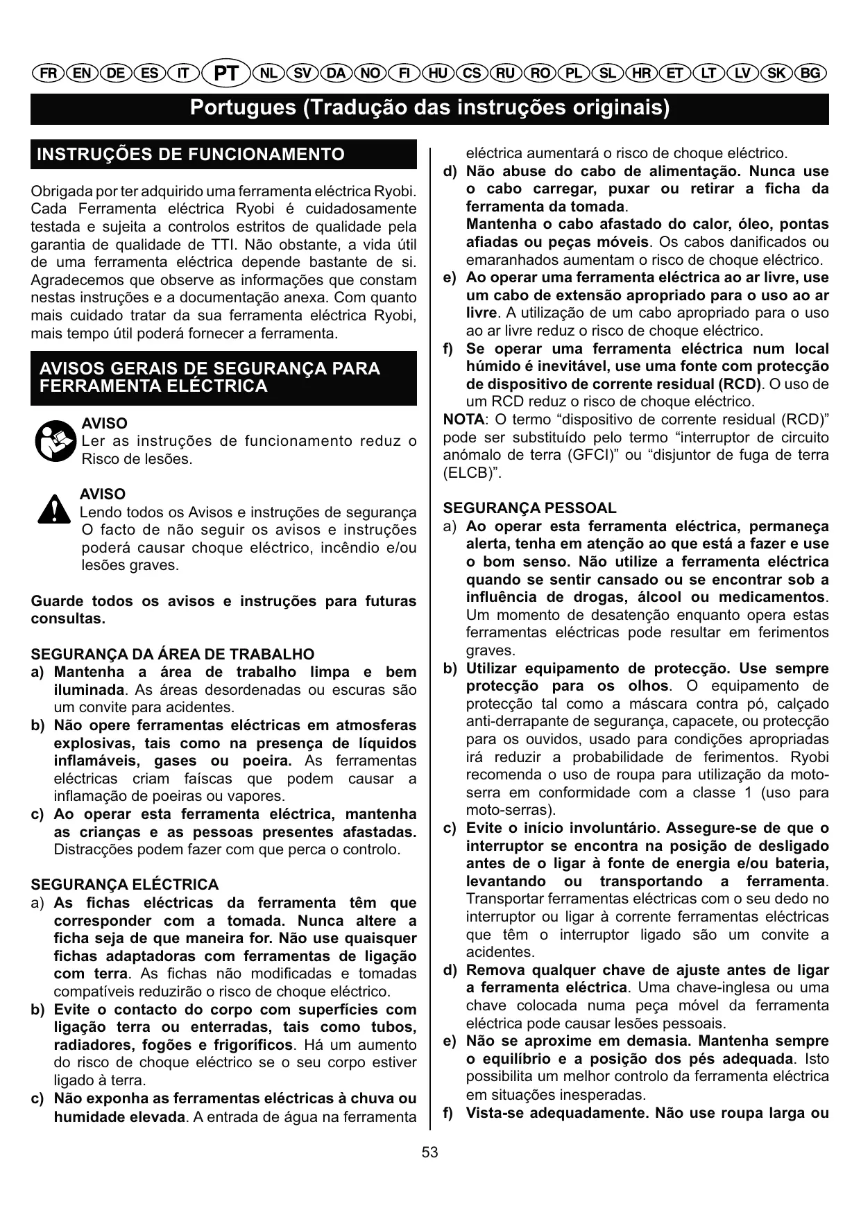 Obrigada por ter adquirido uma ferramenta eléctrica Ryobi. Cada Ferramenta eléctrica Ryobi é cuidadosamente testada e sujeita a controlos estritos de qualidade pela garantia de qualidade de TTI. Não obstante, a vida útil de uma ferramenta eléctrica depende bastante de si. Agradecemos que observe as informações que constam nestas instruções e a documentação anexa. Com quanto mais cuidado tratar da sua ferramenta eléctrica Ryobi, mais tempo útil poderá fornecer a ferramenta.