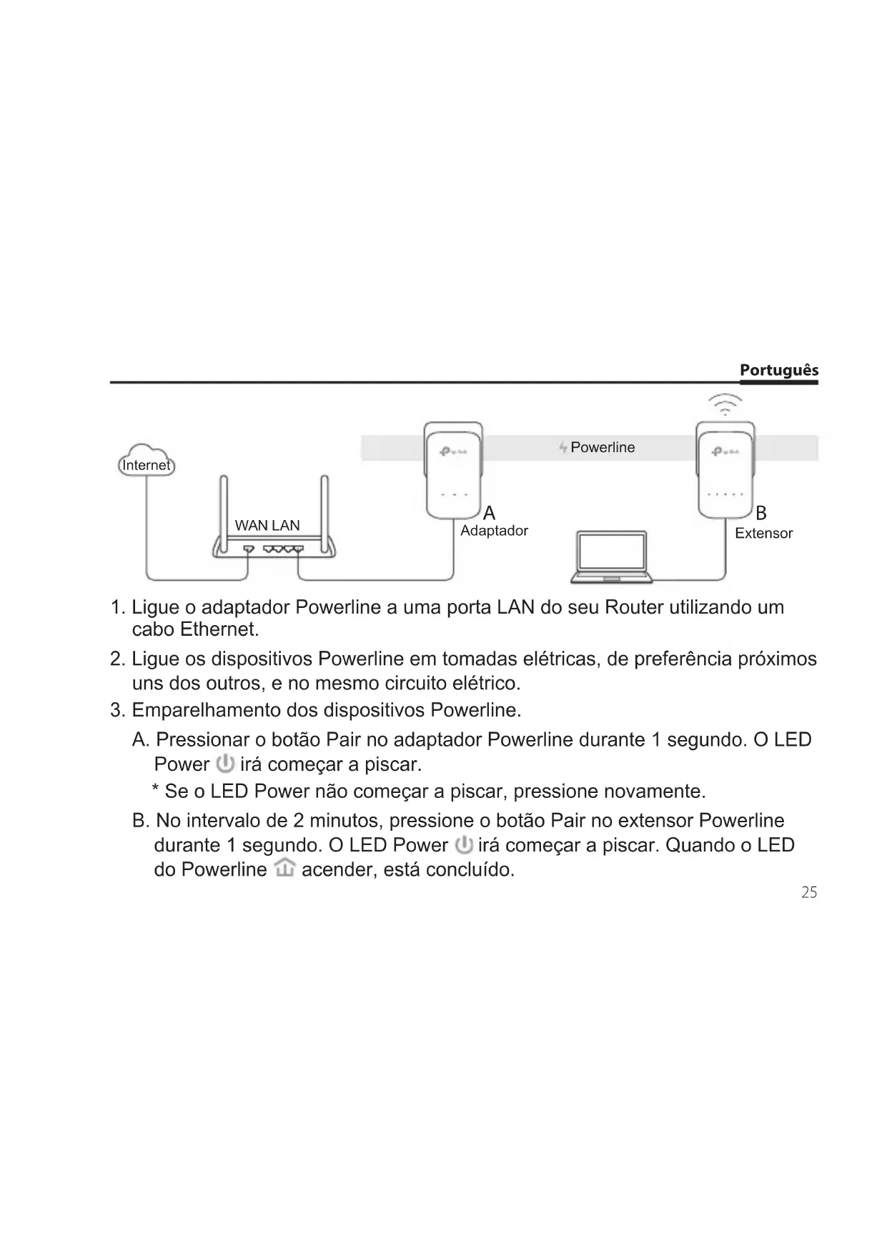 - Se o LED Power não começar a piscar, pressione novamente. B. No intervalo de 2 minutos, pressione o botão Pair no extensor Powerline durante 1 segundo. O LED Power irá começar a piscar. Quando o LED do Powerline acender, está concluído. Internet WAN LAN Adaptador Extensor PowerlinePortuguês