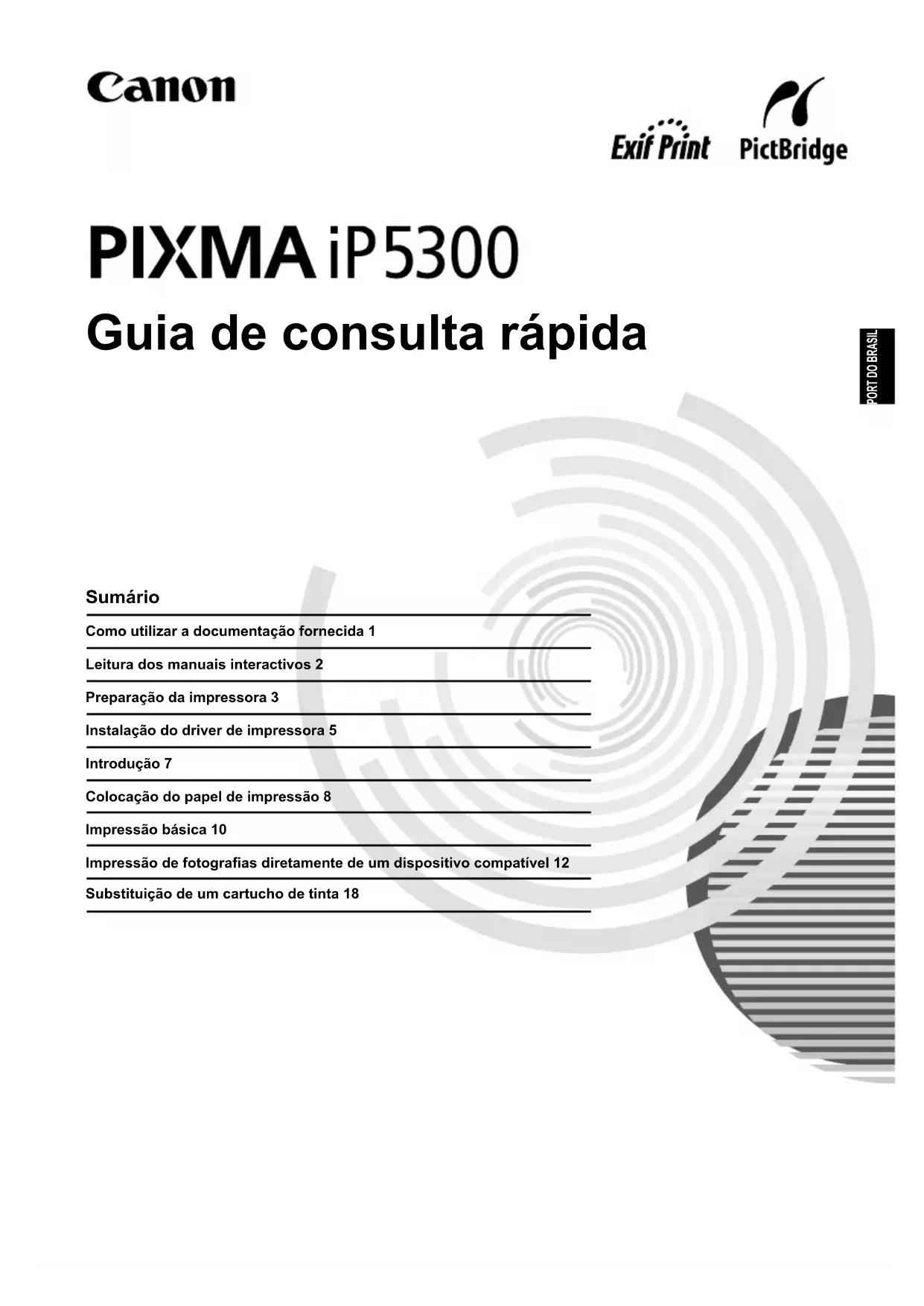 (EEA: Noruega, Islandia y Liechtenstein) Sólo para clientes de Europa, Oriente Próximo, África y Rusia Para conocer los datos de contacto de la asistencia técnica de Canon, consulte la cubierta posterior del folleto de EWS (Sistemas de garantía Europeos) o visite www.canon-europe.com. Canon Europa N.V., Bovenkerkerweg 59-61, 1185 XB Amstelveen, Países bajosPORT DO BRASIL Guia de consulta rápida Sumário Como utilizar a documentação fornecida 1 Leitura dos manuais interactivos 2 Preparação da impressora 3 Instalação do driver de impressora 5 Introdução 7 Colocação do papel de impressão 8 Impressão básica 10 Impressão de fotografias diretamente de um dispositivo compatível 12 Substituição de um cartucho de tinta 18PORT DO BRASIL Exif Print Esta impressora tem suporte para Exif Print. Exif Print é um padrão que visa melhorar a comunicação entre câmeras digitais e impressoras. Na conexão com uma câmera digital compatível com o padrão Exif Print, os dados de imagem da câmera no momento em que é tirada a fotografia são utilizados e otimizados, resultando em impressões de excelente qualidade. Regulamentos de radiointerferência canadenses / Réglementations canadiennes relatives aux interférences radio Este aparelho digital não excede os limites da Classe B para emissões de ruído de rádio provenientes de um aparelho digital, conforme disposto no padrão para equipamentos causadores de interferência intitulado “Digital Apparatus” (aparelho digital) ICES-003 da Industry Canada. Cet appareil numérique respecte les limites de bruits radioélectriques applicables aux appareils numériques de Classe B prescrites dans la norme sur le matériel brouilleur NMB- 003 d'Industrie Canada intitulée « Appareils numériques ». Programa internacional da ENERGY STAR
