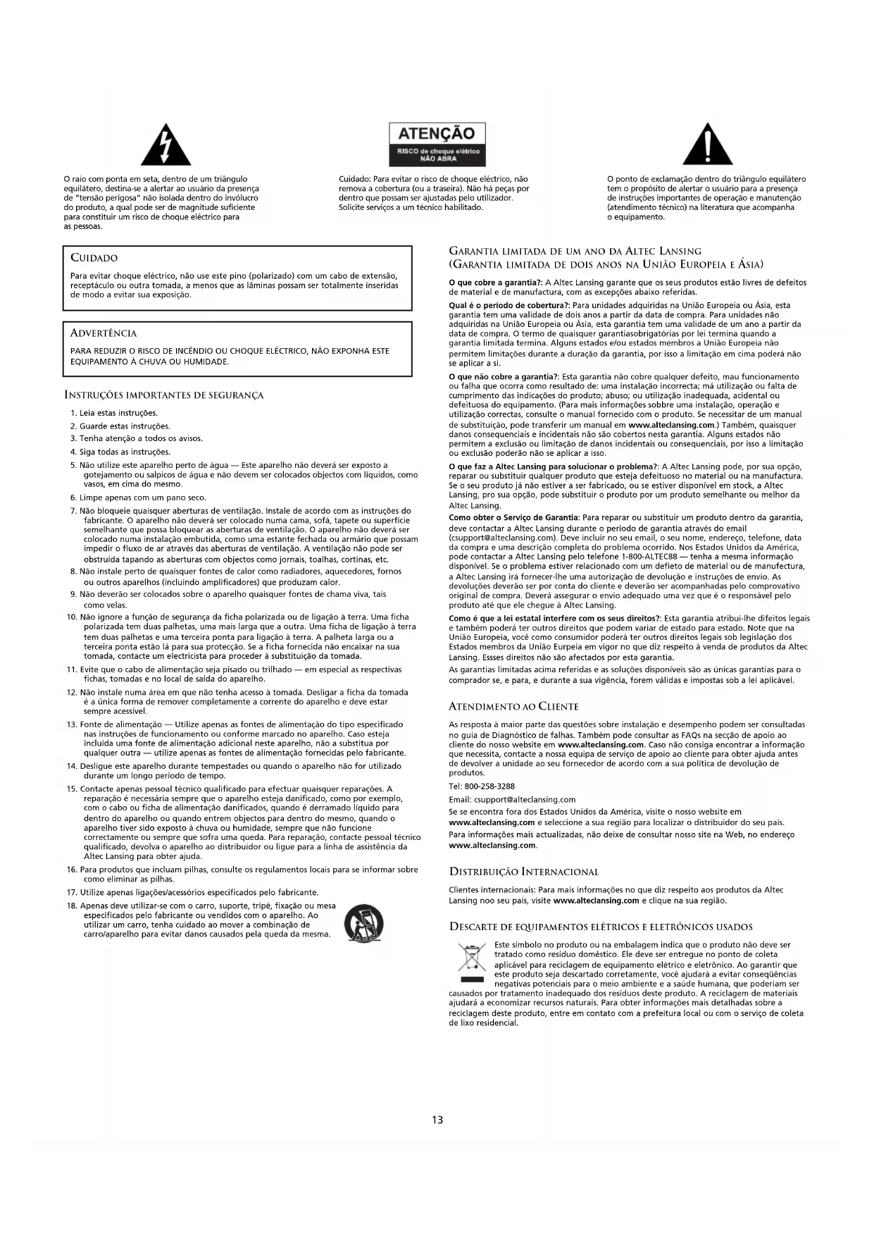 especificados pelo fabricante ou vendidos com o aparelho. Ao utilizar um carro, tenha cuidado ao mover a combinação de carro/aparelho para evitar danos causados pela queda da mesma. GARANTIA LIMITADA DE UM ANO DA ALTEC LANSING (GARANTIA LIMITADA DE DOIS ANOS NA UNIÃO EUROPEIA E ÁSIA) O que cobre a garantia?: A Altec Lansing garante que os seus produtos estão livres de defeitos de material e de manufactura, com as excepções abaixo referidas. Qual é o período de cobertura?: Para unidades adquiridas na União Europeia ou Ásia, esta garantia tem uma validade de dois anos a partir da data de compra. Para unidades não adquiridas na União Europeia ou Ásia, esta garantia tem uma validade de um ano a partir da data de compra. O termo de quaisquer garantiasobrigatórias por lei termina quando a garantia limitada termina. Alguns estados e/ou estados membros a União Europeia não permitem limitações durante a duração da garantia, por isso a limitação em cima poderá não se aplicar a si. O que não cobre a garantia?: Esta garantia não cobre qualquer defeito, mau funcionamento ou falha que ocorra como resultado de: uma instalação incorrecta; má utilização ou falta de cumprimento das indicações do produto; abuso; ou utilização inadequada, acidental ou defeituosa do equipamento. (Para mais informações sobbre uma instalação, operação e utilização correctas, consulte o manual fornecido com o produto. Se necessitar de um manual de substituição, pode transferir um manual em www.alteclansing.com.) Também, quaisquer danos consequenciais e incidentais não são cobertos nesta garantia. Alguns estados não permitem a exclusão ou limitação de danos incidentais ou consequenciais, por isso a limitação ou exclusão poderão não se aplicar a isso. O que faz a Altec Lansing para solucionar o problema?: A Altec Lansing pode, por sua opção, reparar ou substituir qualquer produto que esteja defeituoso no material ou na manufactura. Se o seu produto já não estiver a ser fabricado, ou se estiver disponível em stock, a Altec Lansing, pro sua opção, pode substituir o produto por um produto semelhante ou melhor da Altec Lansing. Como obter o Serviço de Garantia: Para reparar ou substituir um produto dentro da garantia, deve contactar a Altec Lansing durante o período de garantia através do email (csupport@alteclansing.com). Deve incluir no seu email, o seu nome, endereço, telefone, data da compra e uma descrição completa do problema ocorrido. Nos Estados Unidos da América, pode contactar a Altec Lansing pelo telefone 1-800-ALTEC88 — tenha a mesma informação disponível. Se o problema estiver relacionado com um defieto de material ou de manufectura, a Altec Lansing irá fornecer-lhe uma autorização de devolução e instruções de envio. As devoluções deverão ser por conta do cliente e deverão ser acompanhadas pelo comprovativo original de compra. Deverá assegurar o envio adequado uma vez que é o responsável pelo produto até que ele chegue à Altec Lansing. Como é que a lei estatal interfere com os seus direitos?: Esta garantia atribui-lhe difeitos legais e também poderá ter outros direitos que podem variar de estado para estado. Note que na União Europeia, você como consumidor poderá ter outros direitos legais sob legislação dos Estados membros da União Eurpeia em vigor no que diz respeito à venda de produtos da Altec Lansing. Essses direitos não são afectados por esta garantia. As garantias limitadas acima referidas e as soluções disponíveis são as únicas garantias para o comprador se, e para, e durante a sua vigência, forem válidas e impostas sob a lei aplicável.
