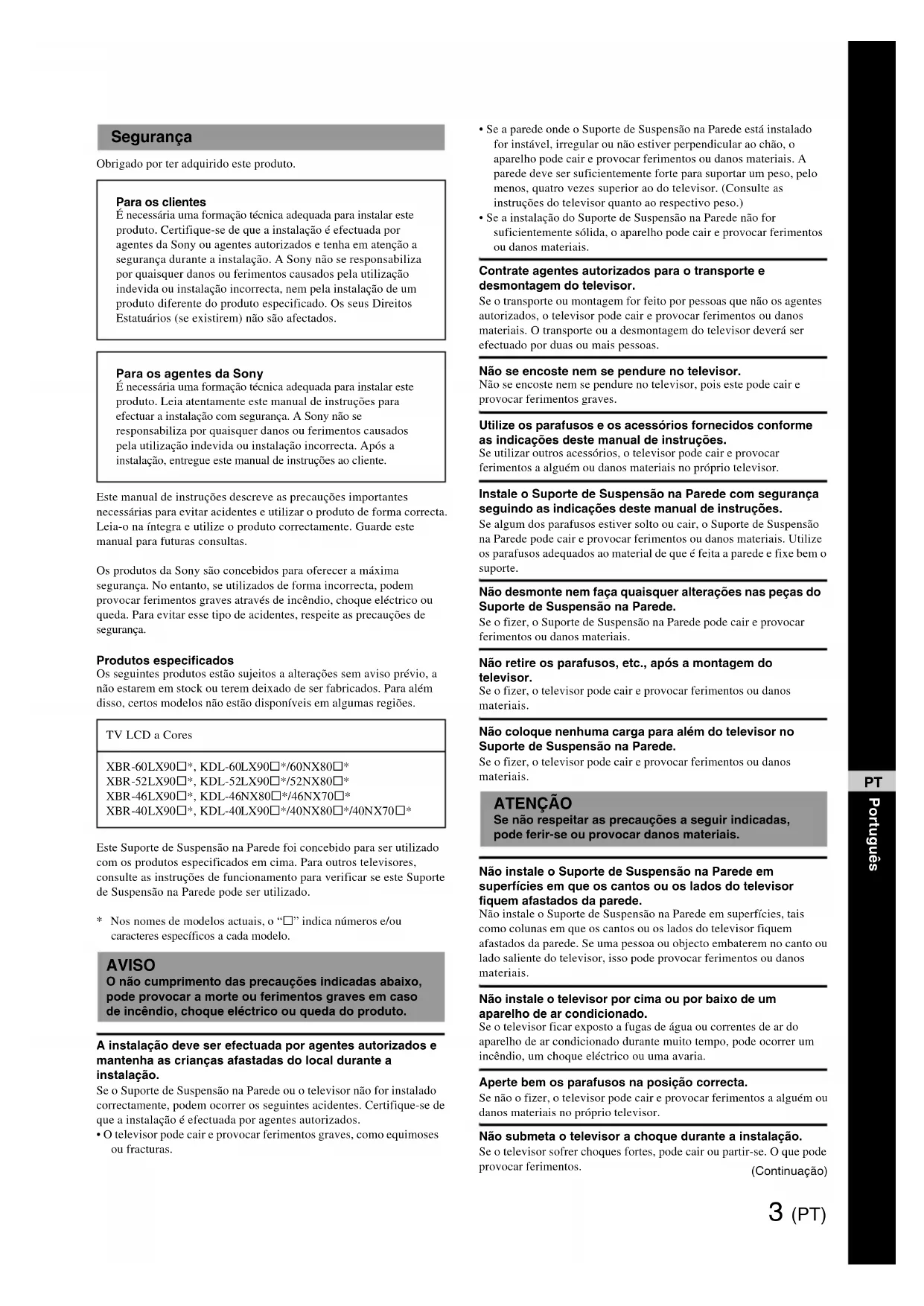 - Se a instalação do Suporte de Suspensão na Parede não for suficientemente sólida, o aparelho pode cair e provocar ferimentos ou danos materiais. Contrate agentes autorizados para o transporte e desmontagem do televisor. Se o transporte ou montagem for feito por pessoas que não os agentes autorizados, o televisor pode cair e provocar ferimentos ou danos materiais. O transporte ou a desmontagem do televisor deverá ser efectuado por duas ou mais pessoas. Não se encoste nem se pendure no televisor. Não se encoste nem se pendure no televisor, pois este pode cair e provocar ferimentos graves. Utilize os parafusos e os acessórios fornecidos conforme as indicações deste manual de instruções. Se utilizar outros acessórios, o televisor pode cair e provocar ferimentos a alguém ou danos materiais no próprio televisor. Instale o Suporte de Suspensão na Parede com segurança seguindo as indicações deste manual de instruções. Se algum dos parafusos estiver solto ou cair, o Suporte de Suspensão na Parede pode cair e provocar ferimentos ou danos materiais. Utilize os parafusos adequados ao material de que é feita a parede e fixe bem o suporte. Não desmonte nem faça quaisquer alterações nas peças do Suporte de Suspensão na Parede. Se o fizer, o Suporte de Suspensão na Parede pode cair e provocar ferimentos ou danos materiais. Não retire os parafusos, etc., após a montagem do televisor. Se o fizer, o televisor pode cair e provocar ferimentos ou danos materiais. Não coloque nenhuma carga para além do televisor no Suporte de Suspensão na Parede. Se o fizer, o televisor pode cair e provocar ferimentos ou danos materiais. Não instale o Suporte de Suspensão na Parede em superfícies em que os cantos ou os lados do televisor fiquem afastados da parede. Não instale o Suporte de Suspensão na Parede em superfícies, tais como colunas em que os cantos ou os lados do televisor fiquem afastados da parede. Se uma pessoa ou objecto embaterem no canto ou lado saliente do televisor, isso pode provocar ferimentos ou danos materiais. Não instale o televisor por cima ou por baixo de um aparelho de ar condicionado. Se o televisor ficar exposto a fugas de água ou correntes de ar do aparelho de ar condicionado durante muito tempo, pode ocorrer um incêndio, um choque eléctrico ou uma avaria. Aperte bem os parafusos na posição correcta. Se não o fizer, o televisor pode cair e provocar ferimentos a alguém ou danos materiais no próprio televisor. Não submeta o televisor a choque durante a instalação. Se o televisor sofrer choques fortes, pode cair ou partir-se. O que pode provocar ferimentos. Segurança Para os clientes É necessária uma formação técnica adequada para instalar este produto. Certifique-se de que a instalação é efectuada por agentes da Sony ou agentes autorizados e tenha em atenção a segurança durante a instalação. A Sony não se responsabiliza por quaisquer danos ou ferimentos causados pela utilização indevida ou instalação incorrecta, nem pela instalação de um produto diferente do produto especificado. Os seus Direitos Estatuários (se existirem) não são afectados. Para os agentes da Sony É necessária uma formação técnica adequada para instalar este produto. Leia atentamente este manual de instruções para efectuar a instalação com segurança. A Sony não se responsabiliza por quaisquer danos ou ferimentos causados pela utilização indevida ou instalação incorrecta. Após a instalação, entregue este manual de instruções ao cliente. TV LCD a Cores XBR-60LX90s*, KDL-60LX90s*/60NX80s* XBR-52LX90s*, KDL-52LX90s*/52NX80s* XBR-46LX90s*, KDL-46NX80s*/46NX70s* XBR-40LX90s*, KDL-40LX90s*/40NX80s*/40NX70s* AVISO O não cumprimento das precauções indicadas abaixo, pode provocar a morte ou ferimentos graves em caso de incêndio, choque eléctrico ou queda do produto. ATENÇÃO Se não respeitar as precauções a seguir indicadas, pode ferir-se ou provocar danos materiais.