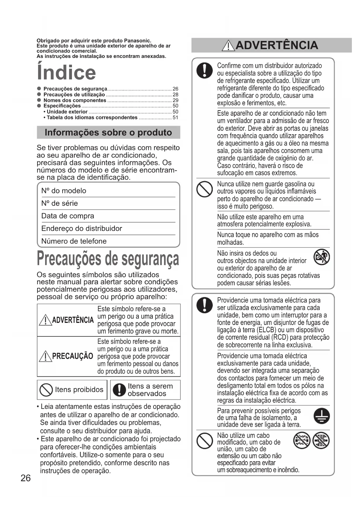 - Tabela dos idiomas correspondentes ....................... 51 Índice Precauções de segurança Informações sobre o produto Se tiver problemas ou dúvidas com respeito ao seu aparelho de ar condicionado, precisará das seguintes informações. Os números do modelo e de série encontram- se na placa de identicação. Nº do modelo Nº de série Data de compra Endereço do distribuidor Número de telefone Conrme com um distribuidor autorizado ou especialista sobre a utilização do tipo de refrigerante especicado. Utilizar um refrigerante diferente do tipo especicado pode danicar o produto, causar uma explosão e ferimentos, etc. Este aparelho de ar condicionado não tem um ventilador para a admissão de ar fresco do exterior. Deve abrir as portas ou janelas com frequência quando utilizar aparelhos de aquecimento a gás ou a óleo na mesma sala, pois tais aparelhos consomem uma grande quantidade de oxigénio do ar. Caso contrário, haverá o risco de sufocação em casos extremos. Nunca utilize nem guarde gasolina ou outros vapores ou líquidos inamáveis perto do aparelho de ar condicionado — isso é muito perigoso. Não utilize este aparelho em uma atmosfera potencialmente explosiva. Nunca toque no aparelho com as mãos molhadas. Não insira os dedos ou outros objectos na unidade interior ou exterior do aparelho de ar condicionado, pois suas peças rotativas podem causar sérias lesões. Os seguintes símbolos são utilizados neste manual para alertar sobre condições potencialmente perigosas aos utilizadores, pessoal de serviço ou próprio aparelho: ADVERTÊNCIA Este símbolo refere-se a um perigo ou a uma prática perigosa que pode provocar um ferimento grave ou morte. PRECAUÇÃO Este símbolo refere-se a um perigo ou a uma prática perigosa que pode provocar um ferimento pessoal ou danos do produto ou de outros bens. Itens proibidos Itens a serem observados Obrigado por adquirir este produto Panasonic.Este produto é uma unidade exterior de aparelho de ar condicionado comercial.As instruções de instalação se encontram anexadas.