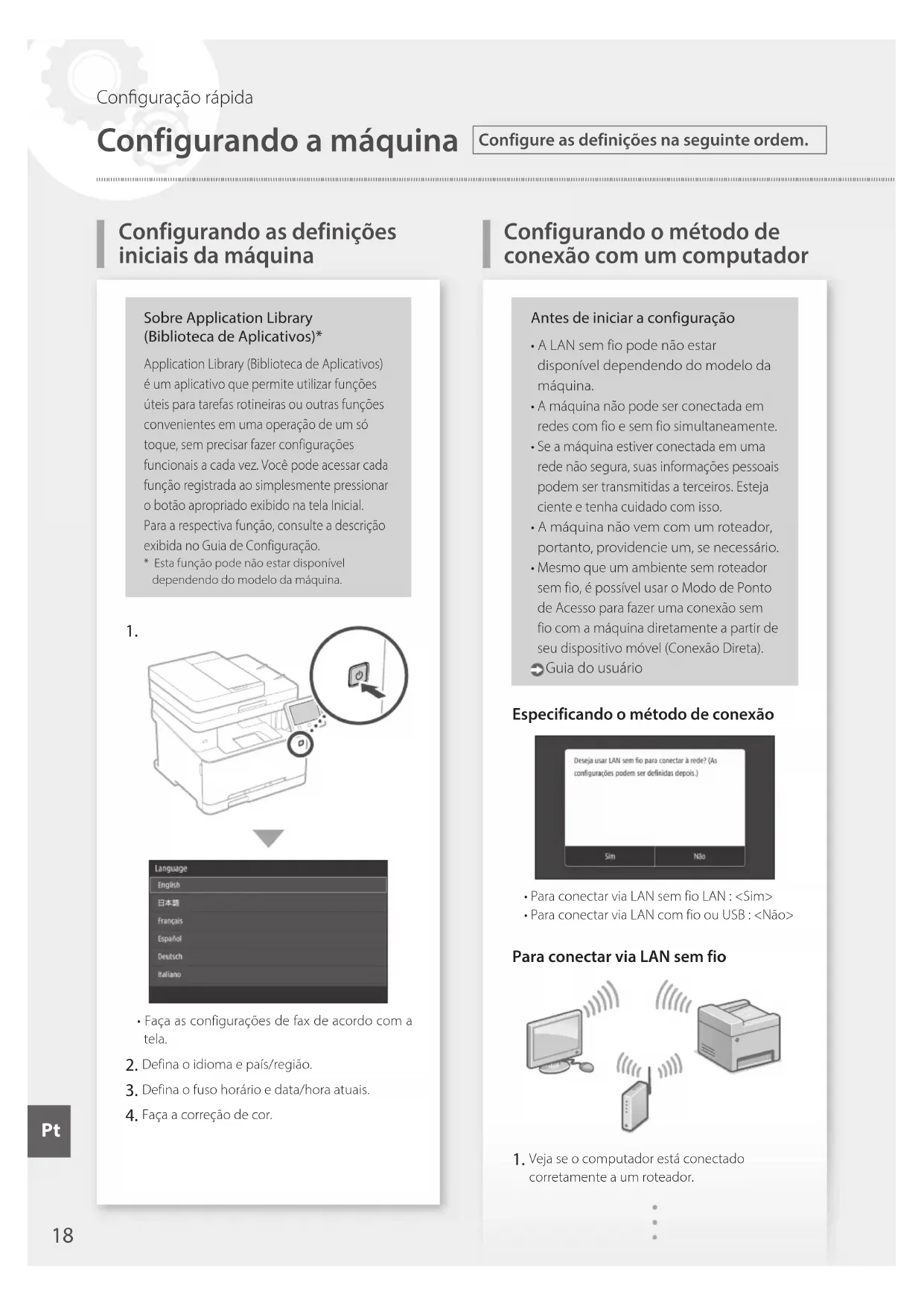Configurando a máquina Configurando as definições iniciais da máquina Configure as definições na seguinte ordem. Conguração rápida Pt2. Verifique as configurações de rede do computador. Anote o SSID e chave da rede.• Veja o rótulo no roteador. Guia do usuário A operação de configuração é mais fácil se o roteador tiver uma marca WPS. Guia do usuário Defina o ponto de acesso e chave de rede de acordo com a tela.1. Pressione <OK>.2. Pressione <Configurações de SSID>.3. Pressione <Selecionar Ponto de Acesso>.4. Selecione o ponto de acesso (SSID), e pressione <Próxima>.5. Insira uma chave WEP (chave de rede) e pressione <Aplicar>.6. Pressione <Sim>.• O endereço IP será configurado automaticamente em alguns minutos.• "Conectado." é exibido. Instale o driver e software. "Instalando o software" na página 20 Para ver o guia em vídeo do processo Você pode encontrar o vídeo e o guia para auxiliar o processo de conexão da Rede Sem Fio a partir da URL abaixo. A visualização desses manuais garantirá uma configuração tranquila do dispositivo em seu ambiente sem fio existente. http://www.usa.canon.com/WirelessHelpAgora que terminou de ajustar as configurações iniciais.Se sua máquina tem a função de fax, continue a fazer as configurações de fax. página 21 Para conectar via LAN com fio A máquina não vem com um cabo de rede.Por favor, providencie um, se necessário. Veja se o computador está conectado corretamente a um roteador. Verifique as configurações de rede do computador. Conecte o cabo de rede.• Após conectar o cabo, aguarde alguns minutos (até que o endereço IP seja definido automaticamente).• Se um endereço IP estático foi definido no computador, defina o endereço IP da máquina manualmente. Instale o driver e software. "Instalando o software" na página 20Agora que terminou de ajustar as configurações iniciais.Se sua máquina tem a função de fax, continue a fazer as configurações de fax. página 21Para detalhes "Congurar usando o guia de conguração" no Guia do Usuário
