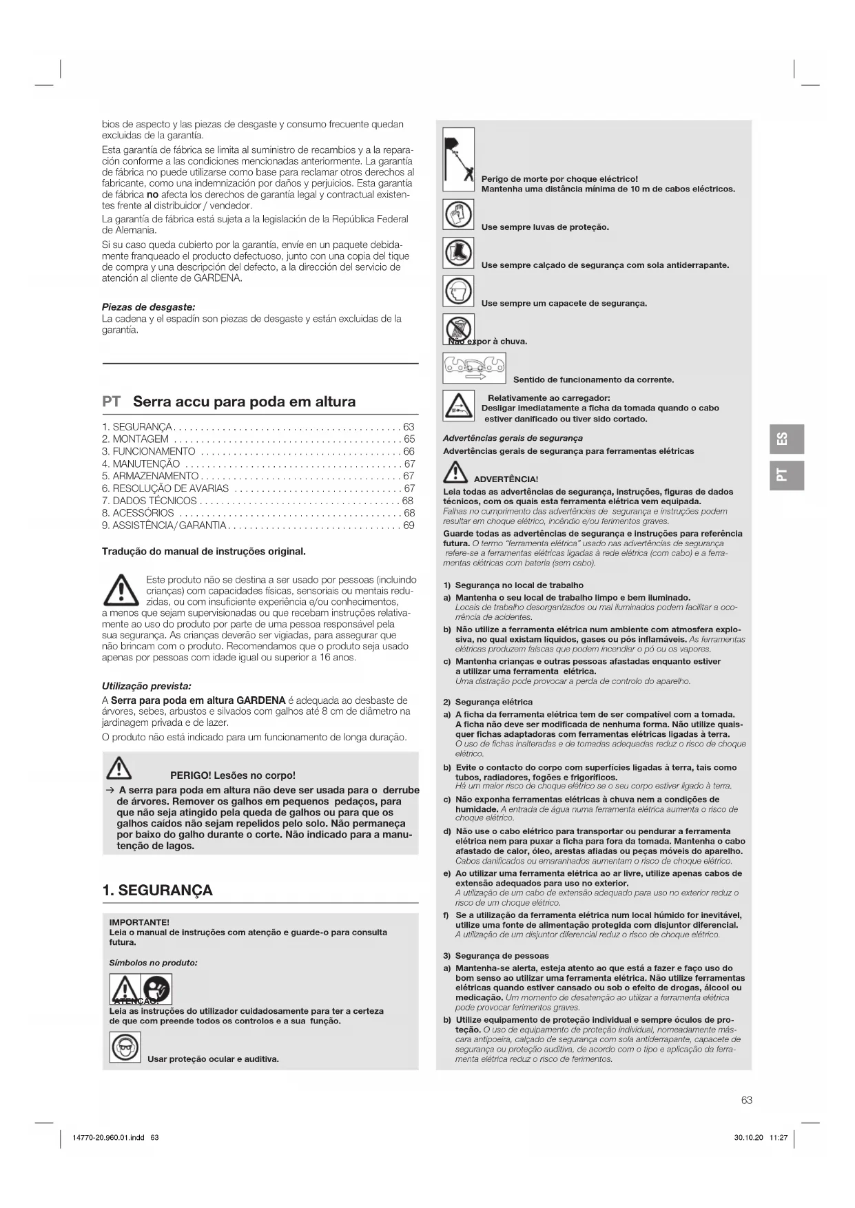 o carregador por conta própria e apenas permita que seja reparado por pessoal técnico qualificado e apenas com peças de substituição originais. Carregadores, cabos e fichas danificados aumentam o risco de um choque elétrico.v Não operar o carregador em superfícies facilmente inflamáveis (por ex. papel, têxteis, etc.) ou num ambiente inflamável. Há risco de incên-dio devido ao aquecimento do carregador ocorrido durante o carregamento.v Se for necessário substituir o cabo elétrico, isto deve ser feito pela GARDENA ou por um centro de assistência ao cliente autorizado para ferramentas elétri-cas GARDENA, de forma a evitar riscos para a segurança.v Não utilize o produto enquanto este estiver a carregar.v Estas advertências de segurança apenas se aplicam a baterias de iões de lítio do POWER FOR ALL Systems PBA 18V.v Utilize a bateria apenas em produtos do fabricante POWER FOR ALL Systems. Só assim se consegue proteger a bateria de sobrecarga perigosa.v Carregue a bateria apenas com os carregadores recomendados pelo fabricante. Há risco de incêndio se um carregador, indicado para um deter-minado tipo de baterias, for utilizado com outro tipo de baterias.v A bateria é fornecida parcialmente carregada. Para garantir a potência máxima da bateria, carregue totalmente a bateria no carregador antes da primeira utilização.v Guarde a bateria fora do alcance de crianças.v Não abra a bateria. Há risco de curto-circuito.v Podem sair vapores em caso de danos e utilização incorreta da bate-ria. A bateria pode arder ou explodir. Assegure uma boa ventilação e procure ajuda médica em caso de sintomas. Os vapores podem irritar as vias respiratórias.v Uma má utilização ou uma bateria danificada pode provocar a saída de líquido inflamável da bateria. Evite o contacto. Se, mesmo assim, houver contacto, lave com água. Se o líquido entrar em contacto com os olhos, procure ajuda médica. O líquido derramado da bateria pode provocar irritações cutâneas ou queima-duras.v Se a bateria estiver com defeito, pode sair líquido e humedecer objetos adjacentes. Verifique as peças afetadas. Limpe-as ou substitua-as, se necessário.v Não coloque a bateria em curto-circuito. Mantenha a bateria não utili-zada afastada de clipes, moedas, chaves, pregos, parafusos ou outros pequenos objetos de metal que possam curto-circuitar os contactos. Um curto-circuito entre os contactos da bateria pode provocar queimaduras ou um incêndio.v A bateria pode ficar danificada por objetos afiados como, por ex., pregos ou chave de fendas ou pela aplicação de força exterior. Pode provocar um curto-circuito interno e queimar a bateria, provocar fumo, explosão ou aquecimento excessivo.v Nunca repare baterias danificadas. Qualquer manutenção da bateria deve ser feita apenas pelo fabricante ou por centros de assistência ao cliente autorizados. Proteja a bateria contra o calor, por ex., contra radiação solar prolongada, fogo, sujidade, água e humidade. Há risco de explosão e curto-circuito. v Utilize e armazene a bateria apenas com uma temperatura ambiente entre – 20 °C e + 50 °C. Por exemplo, no verão não deixe a bateria dentro do carro. Com tempera turas < 0 °C pode ocorrer uma limitação no desempenho especifica do aparelho.v Carregue a bateria apenas com temperaturas ambiente entre 0 °C e+ 45 °C. O carregamento fora desta gama de temperatura pode danificar abateria ou aumentar o risco de incêndio.Segurança elétrica PERIGO! Paragem cardíaca!Este produto cria um campo eletromagnético durante o funcionamento. Em determinadas condições, este campo pode afetar o modo de funcio-namento de implantes médicos ativos ou passivos. Para evitar situações de risco que possam provocar ferimentos graves ou mortais, as pessoas com um implante médico devem consultar o seu médico e o fabricante do implante antes da utilização deste produto.Ligar o carregador apenas na tensão alternada indicada na placa de caracte-rísticas. Em circunstância alguma deve ligar uma terra a qualquer parte do produto.Não utilizar o produto se houver previsão de trovoada.Proteja os contactos da bateria contra a humidade.Segurança pessoal PERIGO! Risco de asfixia!As peças mais pequenas podem ser engolidas. O saco de plástico repre-senta um risco de asfixia para crianças. Mantenha as crianças afastadas durante a montagem.Use a serra para poda em altura apenas para as funções e do modo previstos. O operador ou utente é responsável por acidentes que ocorram a outras pes-soas na sua propriedade. Preste especial atenção ao perigo que pode represen-tar para terceiros o aumento do seu raio de trabalho ao utilizar a extensão teles-cópica. PERIGO! O uso de proteção auditiva e o ruído do produto podem fazer com que não se aperceba da aproximação de pessoas.Use sempre vestuário apropriado, luvas e sapatos robustos.Evite o contacto com o óleo da corrente, especialmente se tiver alergia.Inspeccione as áreas onde a serra para poda em altura irá ser usada e remova todos os arames, cabos eléctricos escondidos e outros objectos estranhos.Todos os trabalhos de ajuste (inclinar a cabeça de corte, alterar o comprimento do tubo telescópico) têm de ser executados com a cobertura de protecção colocada easerra para poda em altura não pode ser apoiada sobre o dispositivo de corte.Antes da utilização e após um embate forte a máquina deve ser verificada quanto a indícios de quebra ou danos e repare-os se for necessário.Nunca tente usar uma serra para poda em altura incompleta ou com alterações não autorizadas.Utilização e manutenção de ferramentas eléctricasDeve saber como desligar o produto em caso de emergência. Nunca pegue na serra para poda em altura pela cobertura de protecção.Não utilize a serra para poda em altura se os dispositivos de proteção estiverem danificados.Não utilize escadas enquanto estiver a usar a serra para poda em altura.Utilize o produto apenas em ter
