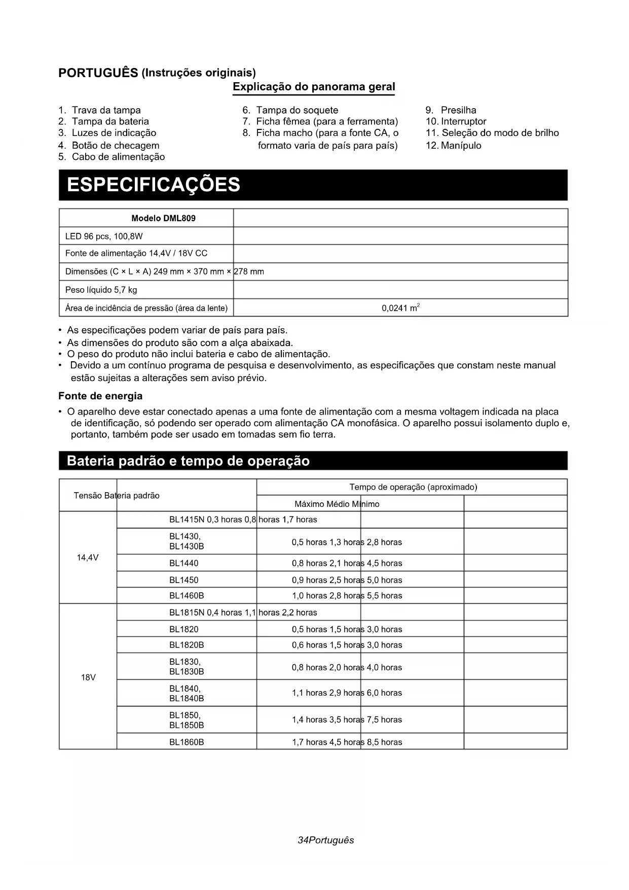 - Algunos artículos en esta lista pueden estar incluidos en la caja del dispositivo como accesorios estándar. Pueden variar de un país a otro.34 Português PORTUGUÊS (Instruções originais) Explicação do panorama geral 1. Trava da tampa2. Tampa da bateria3. Luzes de indicação4. Botão de checagem5. Cabo de alimentação6. Tampa do soquete7. Ficha fêmea (para a ferramenta)8. Ficha macho (para a fonte CA, o formato varia de país para país)9. Presilha10. Interruptor11. Seleção do modo de brilho12. Manípulo ESPECIFICAÇÕES Modelo DML809LED 96 pcs, 100,8WFonte de alimentação 14,4V / 18V CCDimensões (C × L × A) 249 mm × 370 mm × 278 mmPeso líquido 5,7 kgÁrea de incidência de pressão (área da lente)0,0241 m
