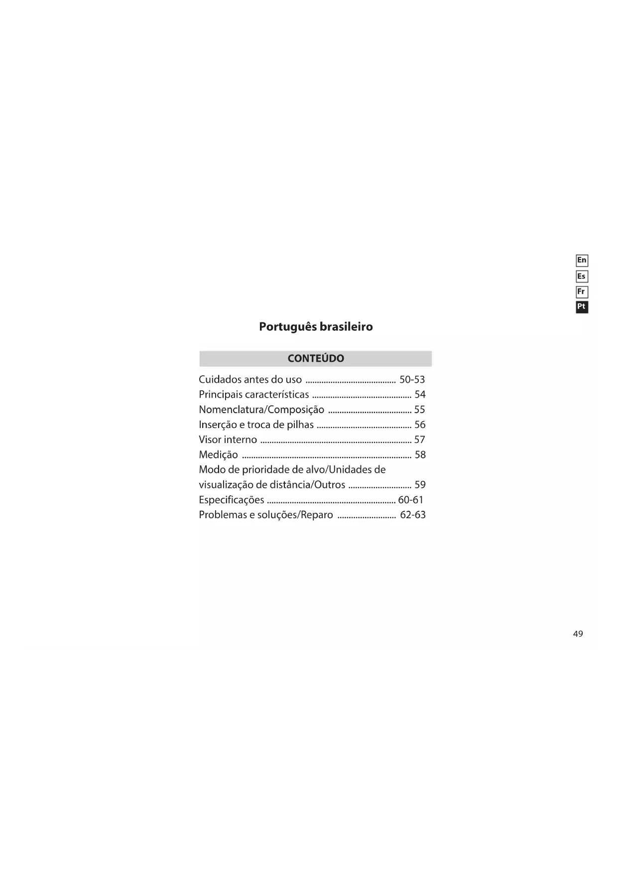 Modo de prioridade de alvo/Unidades de visualização de distância/Outros ............................ 59 Especificações ......................................................... 60-61 Problemas e soluções/Reparo .......................... 62-63 Português brasileiro50