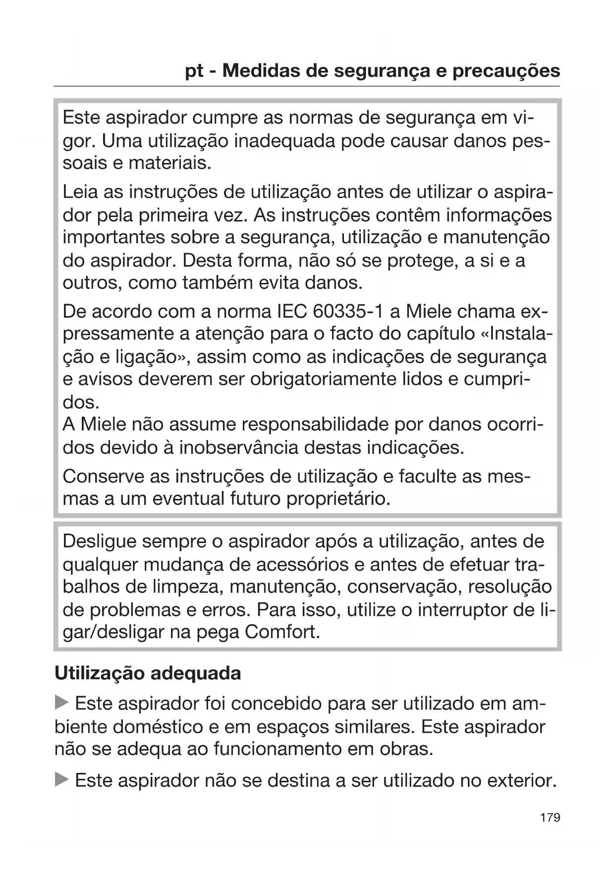 Este aspirador cumpre as normas de segurança em vi- gor. Uma utilização inadequada pode causar danos pes- soais e materiais. Leia as instruções de utilização antes de utilizar o aspira- dor pela primeira vez. As instruções contêm informações importantes sobre a segurança, utilização e manutenção do aspirador. Desta forma, não só se protege, a si e a outros, como também evita danos. De acordo com a norma IEC60335-1 a Miele chama ex- pressamente a atenção para o facto do capítulo «Instala- ção e ligação», assim como as indicações de segurança e avisos deverem ser obrigatoriamente lidos e cumpri- dos. A Miele não assume responsabilidade por danos ocorri- dos devido à inobservância destas indicações. Conserve as instruções de utilização e faculte as mes- mas a um eventual futuro proprietário. Desligue sempre o aspirador após a utilização, antes de qualquer mudança de acessórios e antes de efetuar tra- balhos de limpeza, manutenção, conservação, resolução de problemas e erros. Para isso, utilize o interruptor de li- gar/desligar na pega Comfort. Utilização adequada Este aspirador foi concebido para ser utilizado em am- biente doméstico e em espaços similares. Este aspirador não se adequa ao funcionamento em obras. Este aspirador não se destina a ser utilizado no exterior.pt - Medidas de segurança e precauções