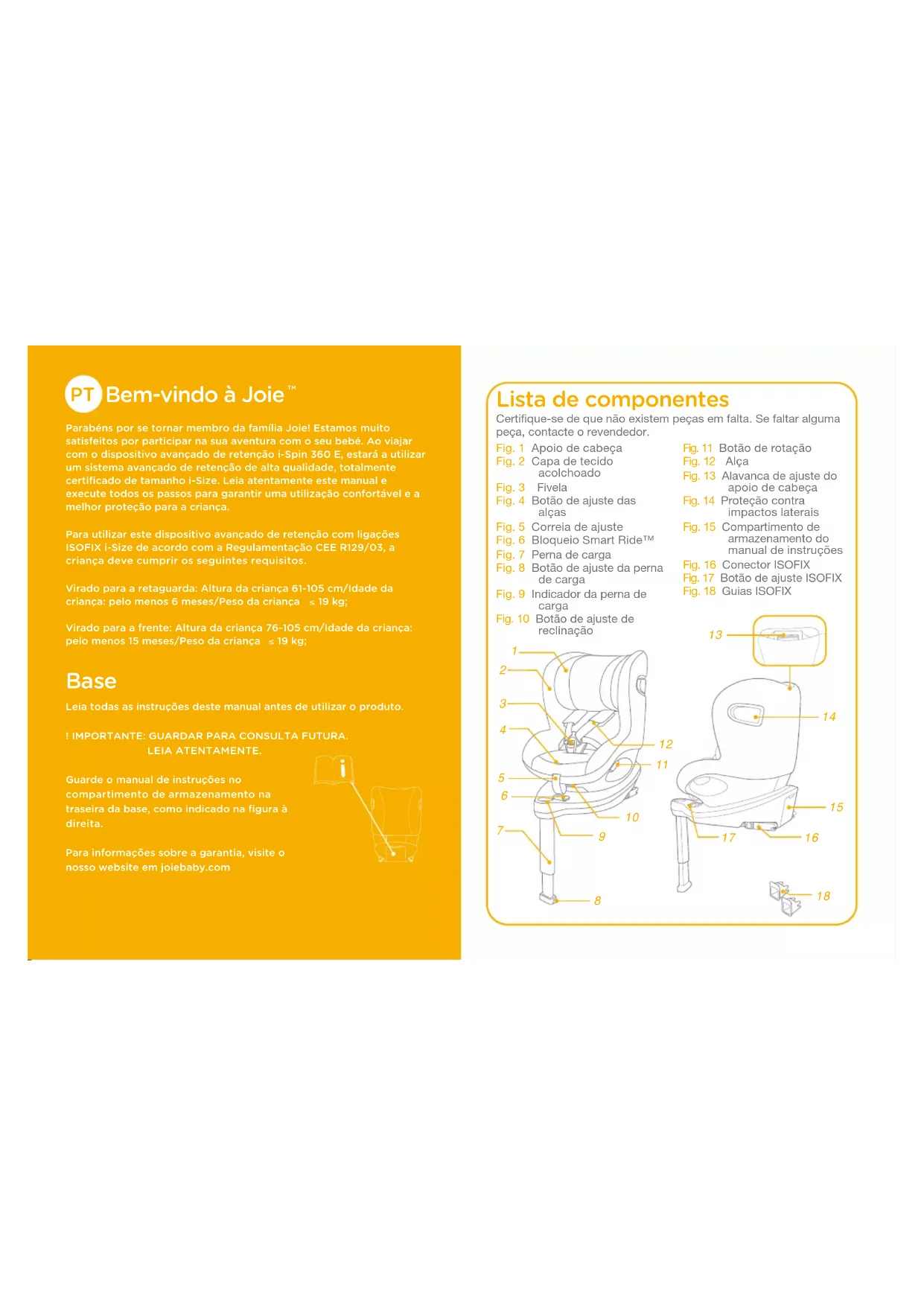 Parabéns por se tornar membro da família Joie! Estamos muito satisfeitos por participar na sua aventura com o seu bebé. Ao viajar com o dispositivo avançado de retenção i-Spin 360 E, estará a utilizar um sistema avançado de retenção de alta qualidade, totalmente certificado de tamanho i-Size. Leia atentamente este manual e execute todos os passos para garantir uma utilização confortável e a melhor proteção para a criança.Para utilizar este dispositivo avançado de retenção com ligações ISOFIX i-Size de acordo com a Regulamentação CEE R129/03, a criança deve cumprir os seguintes requisitos.Virado para a retaguarda: Altura da criança 61-105 cm/Idade da criança: pelo menos 6 meses/Peso da criança 19 kg;Virado para a frente: Altura da criança 76-105 cm/Idade da criança: pelo menos 15 meses/Peso da criança 19 kg; Base Leia todas as instruções deste manual antes de utilizar o produto.! IMPORTANTE: GUARDAR PARA CONSULTA FUTURA.LEIA ATENTAMENTE.Guarde o manual de instruções no compartimento de armazenamento na traseira da base, como indicado na figura à direita. Para informações sobre a garantia, visite o nosso website em joiebaby.com Lista de componentes Fig. 1 Apoio de cabeçaFig. 2 Capa de tecido acolchoadoFig. 3 FivelaFig. 4 Botão de ajuste das alçasFig. 5 Correia de ajusteFig. 6 Bloqueio Smart Ride™Fig. 7 Perna de cargaFig. 8 Botão de ajuste da perna de cargaFig. 9 Indicador da perna de cargaFig. 10 Botão de ajuste de reclinaçãoFig. 11 Botão de rotaçãoFig. 12 AlçaFig. 13 Alavanca de ajuste do apoio de cabeçaFig. 14 Proteção contra impactos lateraisFig. 15 Compartimento de armazenamento do manual de instruçõesFig. 16 Conector ISOFIXFig. 17 Botão de ajuste ISOFIXFig. 18 Guias ISOFIX Certifique-se de que não existem peças em falta. Se faltar alguma peça, contacte o revendedor.