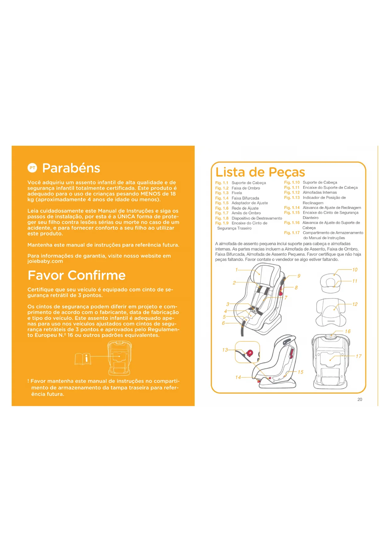Parabéns Você adquiriu um assento infantil de alta qualidade e de segurança infantil totalmente certificada. Este produto é adequado para o uso de crianças pesando MENOS de 18 kg (aproximadamente 4 anos de idade ou menos). Leia cuidadosamente este Manual de Instruções e siga os passos de instalação, por esta é a ÚNICA forma de prote- ger seu filho contra lesões sérias ou morte no caso de um acidente, e para fornecer conforto a seu filho ao utilizar este produto. Mantenha este manual de instruções para referência futura. Para informações de garantia, visite nosso website em joiebaby.com Favor Confirme Certifique que seu veículo é equipado com cinto de se- gurança retrátil de 3 pontos. Os cintos de segurança podem diferir em projeto e com- primento de acordo com o fabricante, data de fabricação e tipo do veículo. Este assento infantil é adequado ape- nas para uso nos veículos ajustados com cintos de segu- rança retráteis de 3 pontos e aprovados pelo Regulamen- to Europeu N.º 16 ou outros padrões equivalentes. ! Favor mantenha este manual de instruções no comparti- mento de armazenamento da tampa traseira para refer- ência futura.
