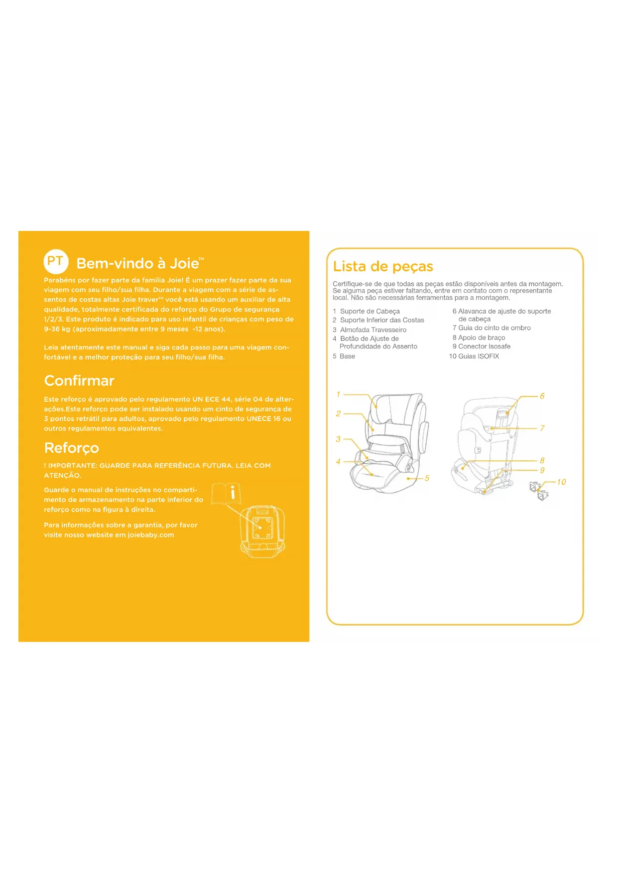 Parabéns por fazer parte da família Joie! É um prazer fazer parte da sua viagem com seu filho/sua filha. Durante a viagem com a série de as-sentos de costas altas Joie traver™ você está usando um auxiliar de alta qualidade, totalmente certificada do reforço do Grupo de segurança 1/2/3. Este produto é indicado para uso infantil de crianças com peso de 9-36 kg (aproximadamente entre 9 meses -12 anos).Leia atentamente este manual e siga cada passo para uma viagem con-fortável e a melhor proteção para seu filho/sua filha. Confirmar Este reforço é aprovado pelo regulamento UN ECE 44, série 04 de alter-ações.Este reforço pode ser instalado usando um cinto de segurança de 3 pontos retrátil para adultos, aprovado pelo regulamento UNECE 16 ou outros regulamentos equivalentes. Reforço ! IMPORTANTE: GUARDE PARA REFERÊNCIA FUTURA. LEIA COM ATENÇÃO.Guarde o manual de instruções no comparti-mento de armazenamento na parte inferior do reforço como na figura à direita.Para informações sobre a garantia, por favor visite nosso website em joiebaby.com