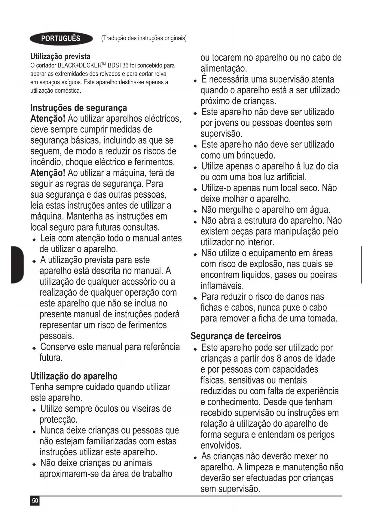 BDST36 foi concebido para aparar as extremidades dos relvados e para cortar relva em espaços exíguos. Este aparelho destina-se apenas a utilização doméstica. Instruções de segurança Atenção! Ao utilizar aparelhos eléctricos, deve sempre cumprir medidas de segurança básicas, incluindo as que se seguem, de modo a reduzir os riscos de incêndio, choque eléctrico e ferimentos. Atenção! Ao utilizar a máquina, terá de seguir as regras de segurança. Para sua segurança e das outras pessoas, leia estas instruções antes de utilizar a máquina. Mantenha as instruções em local seguro para futuras consultas. uLeia com atenção todo o manual antes de utilizar o aparelho. uA utilização prevista para este aparelho está descrita no manual. A utilização de qualquer acessório ou a realização de qualquer operação com este aparelho que não se inclua no presente manual de instruções poderá representar um risco de ferimentos pessoais. uConserve este manual para referência futura. Utilização do aparelho Tenha sempre cuidado quando utilizar este aparelho. uUtilize sempre óculos ou viseiras de protecção. uNunca deixe crianças ou pessoas que não estejam familiarizadas com estas instruções utilizar este aparelho. uNão deixe crianças ou animais aproximarem-se da área de trabalho ou tocarem no aparelho ou no cabo de alimentação. uÉ necessária uma supervisão atenta quando o aparelho está a ser utilizado próximo de crianças. uEste aparelho não deve ser utilizado por jovens ou pessoas doentes sem supervisão. uEste aparelho não deve ser utilizado como um brinquedo. uUtilize apenas o aparelho à luz do dia ou com uma boa luz articial. uUtilize-o apenas num local seco. Não deixe molhar o aparelho. uNão mergulhe o aparelho em água. uNão abra a estrutura do aparelho. Não existem peças para manipulação pelo utilizador no interior. uNão utilize o equipamento em áreas com risco de explosão, nas quais se encontrem líquidos, gases ou poeiras inamáveis. uPara reduzir o risco de danos nas chas e cabos, nunca puxe o cabo para remover a cha de uma tomada. Segurança de terceiros uEste aparelho pode ser utilizado por crianças a partir dos 8 anos de idade e por pessoas com capacidades físicas, sensitivas ou mentais reduzidas ou com falta de experiência e conhecimento. Desde que tenham recebido supervisão ou instruções em relação à utilização do aparelho de forma segura e entendam os perigos envolvidos. uAs crianças não deverão mexer no aparelho. A limpeza e manutenção não deverão ser efectuadas por crianças sem supervisão.51 (Tradução das instruções originais) PORTUGUÊS Riscos residuais. Podem surgir riscos residuais adicionais durante a utilização da ferramenta que poderão não constar nos avisos de segurança incluídos. Estes riscos podem resultar de má utilização, uso prolongado, etc. Mesmo com a aplicação dos regulamentos de segurança relevantes e com a implementação de dispositivos de segurança, alguns riscos residuais não podem ser evitados. Incluem: uferimentos causados pelo contacto com peças em rotação/movimento. uferimentos causados durante a troca de peças, lâminas ou acessórios. uferimentos causados pela utilização prolongada de uma ferramenta. Quando utilizar uma ferramenta por períodos prolongados, faça intervalos regulares. uDiminuição da audição. uProblemas de saúde causados pela inalação de poeiras resultantes da utilização da ferramenta (exemplo: trabalhos em madeira, especialmente carvalho, faia e MDF). Após a utilização uQuando não for utilizado, o aparelho deve ser guardado num local seco e com boa ventilação, fora do alcance das crianças. uAs crianças não devem ter acesso a aparelhos armazenados. uQuando o aparelho for guardado ou transportado num veículo, deverá ser colocado na bagageira ou xo de forma a evitar o movimento devido a alterações súbitas na velocidade ou direcção. Inspecção e reparações uAntes da utilização, verique a existência de peças danicadas ou avariadas no aparelho. Verique se existem peças partidas e quaisquer outras situações que possam afectar o bom funcionamento. uNão utilize este aparelho se alguma das suas peças estiver danicada ou avariada. uMande reparar ou substituir quaisquer peças danicadas ou avariadas por um agente de reparação autorizado. uNunca tente retirar ou substituir quaisquer peças que não as especicadas neste manual. Utilizar um cabo de extensão Utilize sempre um cabo de extensão aprovado e adequado para a potência deste aparelho (ver dados técnicos). O cabo de extensão deve ser adequado para utilização ao ar livre e marcado em conformidade. Poderá utilizar um cabo de extensão HO5VV-F de 1,5 mm