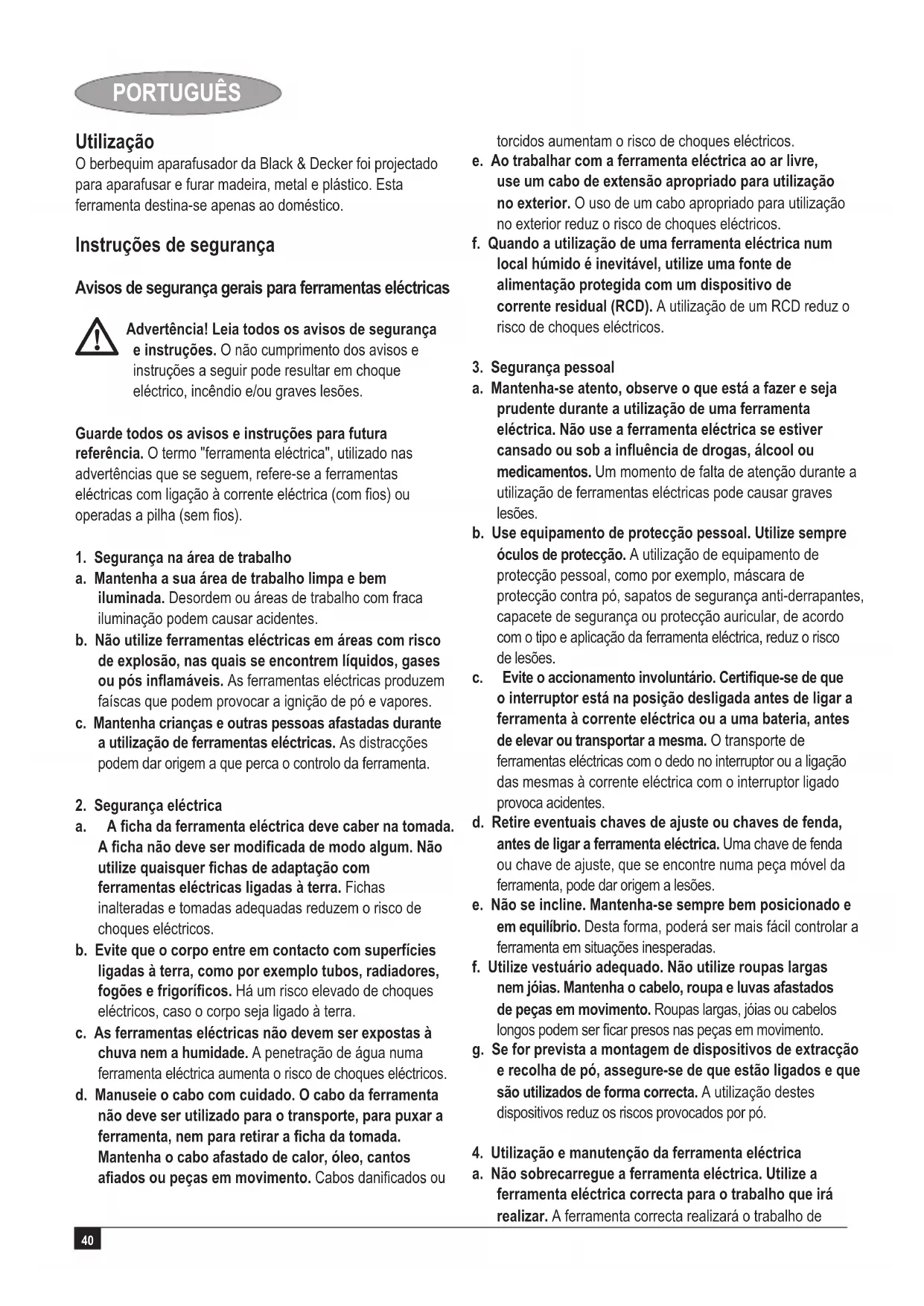 Kevin Hewitt Director de Engenharia do Consumo Spennymoor, County Durham DL16 6JG, Reino Unido 22-5-2009 Garantia A Black & Decker cona na qualidade de seus produtos e oferece um programa de garantia excelente. Esta declaração de garantia soma-se aos seus direitos legais e não os prejudica em nenhum aspecto. A garantia será válida nos territórios dos Estados Membros da União Europeia e na Área de Livre Comércio da Europa. Caso algum produto da Black & Decker apresente avarias devido a defeitos de material, mão-de-obra ou ausência de conformidade no prazo de 24 meses a partir da data de compra, a Black & Decker garantirá a substituição das peças defeituosas, a reparação dos produtos que foram submetidos a uso adequado e remoção ou substituição dos mesmos para assegurar o mínimo de inconvenientes ao cliente a menos que: u O produto tenha sido utilizado para ns comerciais, prossionais ou aluguer; u O produto tenha sido submetido a uso incorrecto ou descuido; u O produto tenha sofrido danos causados por objectos estranhos, substâncias ou acidentes; u Tenha um histórico de reparacões efectuadas por terceiros que não sejam os agentes autorizados ou prossionais de manutenção da Black & Decker. Para activar a garantia, será necessário enviar a prova de compra ao revendedor ou agente de reparação autorizado. Para vericar a localização do agente de reparação mais próximo de si contacte o escritório local da Black & Decker no endereço indicado neste manual. Se preferir, consulte a lista de agentes autorizados da Black & Decker e os dados completos de nossos serviços de atendimento pós-venda na Internet no endereço: www.2helpU.com Visite o nosso website www.blackanddecker.eu para registar o seu novo produto Black & Decker e para se manter actualizado sobre novos produtos e ofertas especiais. Estão disponíveis mais informações sobre a Black & Decker e sobre a nossa gama de produtos em www.blackanddecker.eu46 SVENSKA Användningsområde Din borrmaskin/skruvdragare från Black & Decker kan användas till skruvdragning och borrning i trä, metall och plast. Verktyget är endast avsett som konsumentverktyg. Säkerhetsregler Allmänna säkerhetsvarningar för motordrivna verktyg