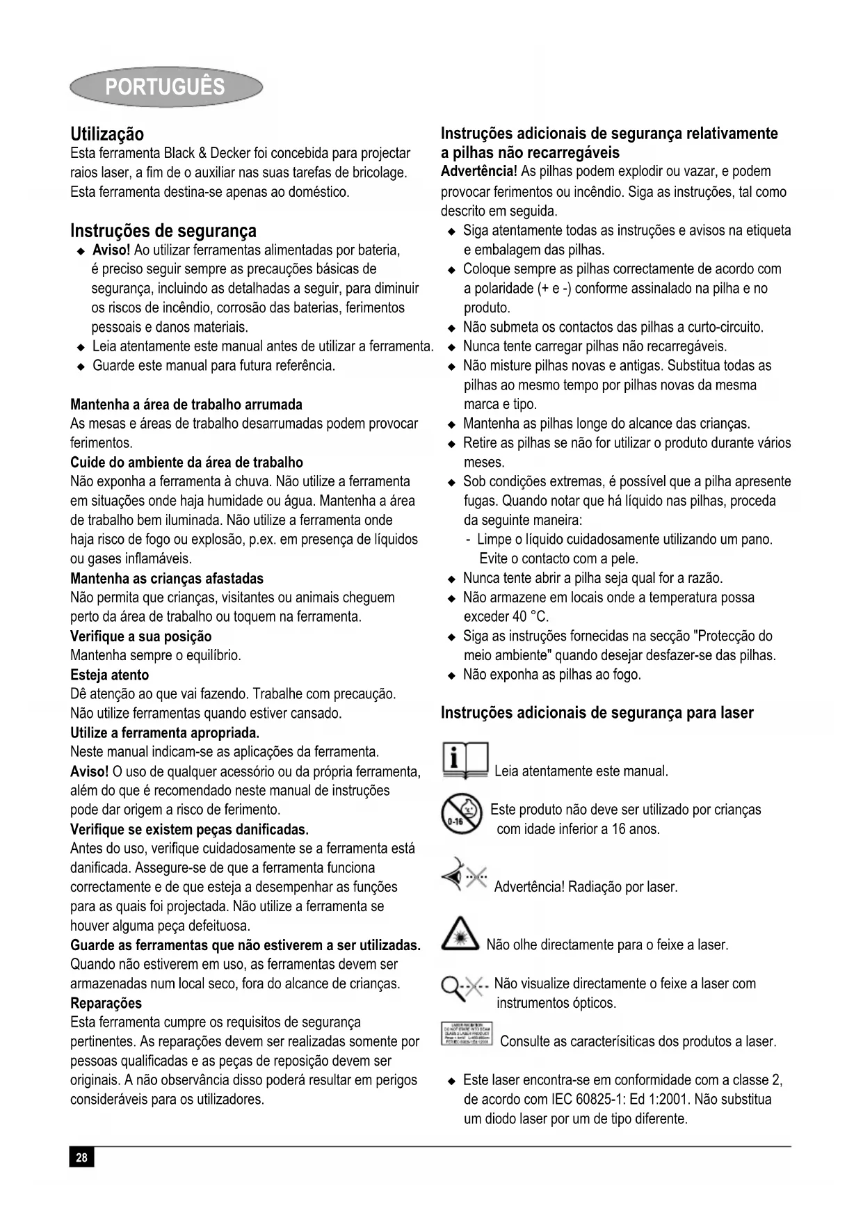 Kevin Hewitt Director de Ingeniería Spennymoor, County Durham DL16 6JG, United Kingdom 01-10-2006 Garantía Black & Decker confía plenamente en la calidad de sus productos y ofrece una garantía extraordinaria. Esta declaración de garantía es una añadido, y en ningún caso un perjuicio para sus derechos estatutarios. La garantía es válida dentro de los territorios de los Estados Miembros de la Unión Europea y de los de la Zona Europea de Libre Comercio. Si un producto Black & Decker resultará defectuoso debido a materiales o mano de obra defectuosos o a la falta de conformidad, Black & Decker garantiza, dentro de los 24 meses de la fecha de compra, la sustitución de las piezas defectuosas, la reparación de los productos sujetos a un desgaste y rotura razonables o la sustitución de tales productos para garantizar al cliente el mínimo de inconvenientes, a menos que: El producto haya sido utilizado con propósitos comerciales, profesionales o de alquiler; El producto haya sido sometido a un uso inadecuado o negligente; El producto haya sufrido daños causados por objetos o sustancias extrañas o accidentes; Se hayan realizado reparaciones por parte de personas que no sean los servicios de reparación autorizados o personal de servicios de Black & Decker; Para reclamar en garantía, será necesario que presente la prueba de compra al vendedor o al servicio técnico de reparaciones autorizado. Pueden consultar la dirección de su servicio técnico más cercano poniéndose en contacto con la oficina local de Black & Decker en la dirección que se indica en este manual. Como alternativa, se puede consultar en Internet, en la dirección siguiente, la lista de servicios técnicos autorizados e información completa de nuestros servicios de postventa y contactos: www.2helpU.com Visite nuestro sitio web www.blackanddecker.eu para registrar su nuevo producto Black & Decker y mantenerse al día sobre nuestros productos y ofertas especiales. Encontrará información adicional sobre la marca Black & Decker y nuestra gama de productos en www. blackanddecker.eu28 PORTUGUÊS Utilização Esta ferramenta Black & Decker foi concebida para projectar raios laser, a fim de o auxiliar nas suas tarefas de bricolage. Esta ferramenta destina-se apenas ao doméstico. Instruções de segurança Aviso! Ao utilizar ferramentas alimentadas por bateria, é preciso seguir sempre as precauções básicas de segurança, incluindo as detalhadas a seguir, para diminuir os riscos de incêndio, corrosão das baterias, ferimentos pessoais e danos materiais. Leia atentamente este manual antes de utilizar a ferramenta. Guarde este manual para futura referência. Mantenha a área de trabalho arrumada As mesas e áreas de trabalho desarrumadas podem provocar ferimentos. Cuide do ambiente da área de trabalho Não exponha a ferramenta à chuva. Não utilize a ferramenta em situações onde haja humidade ou água. Mantenha a área de trabalho bem iluminada. Não utilize a ferramenta onde haja risco de fogo ou explosão, p.ex. em presença de líquidos ou gases inflamáveis. Mantenha as crianças afastadas Não permita que crianças, visitantes ou animais cheguem perto da área de trabalho ou toquem na ferramenta. Verifique a sua posição Mantenha sempre o equilíbrio. Esteja atento Dê atenção ao que vai fazendo. Trabalhe com precaução. Não utilize ferramentas quando estiver cansado. Utilize a ferramenta apropriada. Neste manual indicam-se as aplicações da ferramenta. Aviso! O uso de qualquer acessório ou da própria ferramenta, além do que é recomendado neste manual de instruções pode dar origem a risco de ferimento. Verifique se existem peças danificadas. Antes do uso, verifique cuidadosamente se a ferramenta está danificada. Assegure-se de que a ferramenta funciona correctamente e de que esteja a desempenhar as funções para as quais foi projectada. Não utilize a ferramenta se houver alguma peça defeituosa. Guarde as ferramentas que não estiverem a ser utilizadas. Quando não estiverem em uso, as ferramentas devem ser armazenadas num local seco, fora do alcance de crianças. Reparações Esta ferramenta cumpre os requisitos de segurança pertinentes. As reparações devem ser realizadas somente por pessoas qualificadas e as peças de reposição devem ser originais. A não observância disso poderá resultar em perigos consideráveis para os utilizadores. Instruções adicionais de segurança relativamente a pilhas não recarregáveis Advertência! As pilhas podem explodir ou vazar, e podem provocar ferimentos ou incêndio. Siga as instruções, tal como descrito em seguida. Siga atentamente todas as instruções e avisos na etiqueta e embalagem das pilhas. Coloque sempre as pilhas correctamente de acordo com a polaridade (+ e -) conforme assinalado na pilha e no produto. Não submeta os contactos das pilhas a curto-circuito. Nunca tente carregar pilhas não recarregáveis. Não misture pilhas novas e antigas. Substitua todas as pilhas ao mesmo tempo por pilhas novas da mesma marca e tipo. Mantenha as pilhas longe do alcance das crianças. Retire as pilhas se não for utilizar o produto durante vários meses. Sob condições extremas, é possível que a pilha apresente fugas. Quando notar que há líquido nas pilhas, proceda da seguinte maneira: - Limpe o líquido cuidadosamente utilizando um pano. Evite o contacto com a pele. Nunca tente abrir a pilha seja qual for a razão. Não armazene em locais onde a temperatura possa exceder 40 °C. Siga as instruções fornecidas na secção "Protecção do meio ambiente" quando desejar desfazer-se das pilhas. Não exponha as pilhas ao fogo. Instruções adicionais de segurança para laser Leia atentamente este manual. Este produto não deve ser utilizado por crianças com idade inferior a 16 anos. Advertência! Radiação por laser. Não olhe directamente para o feixe a laser. Não visualize directamente o feixe a laser com instrumentos ópticos. Consulte a