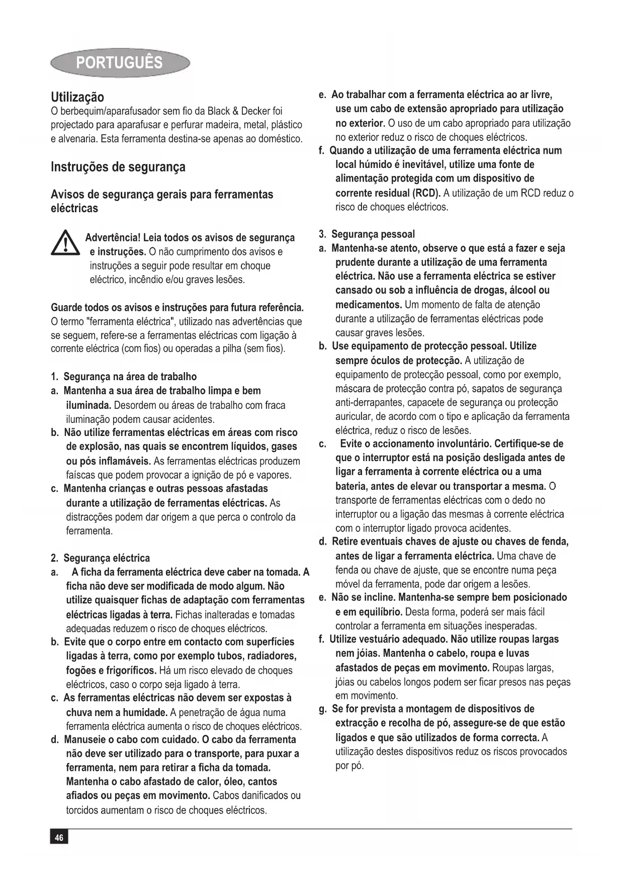 Advertência! Leia todos os avisos de segurança e instruções. O não cumprimento dos avisos e instruções a seguir pode resultar em choque eléctrico, incêndio e/ou graves lesões. Guarde todos os avisos e instruções para futura referência. O termo "ferramenta eléctrica", utilizado nas advertências que se seguem, refere-se a ferramentas eléctricas com ligação à corrente eléctrica (com os) ou operadas a pilha (sem os).