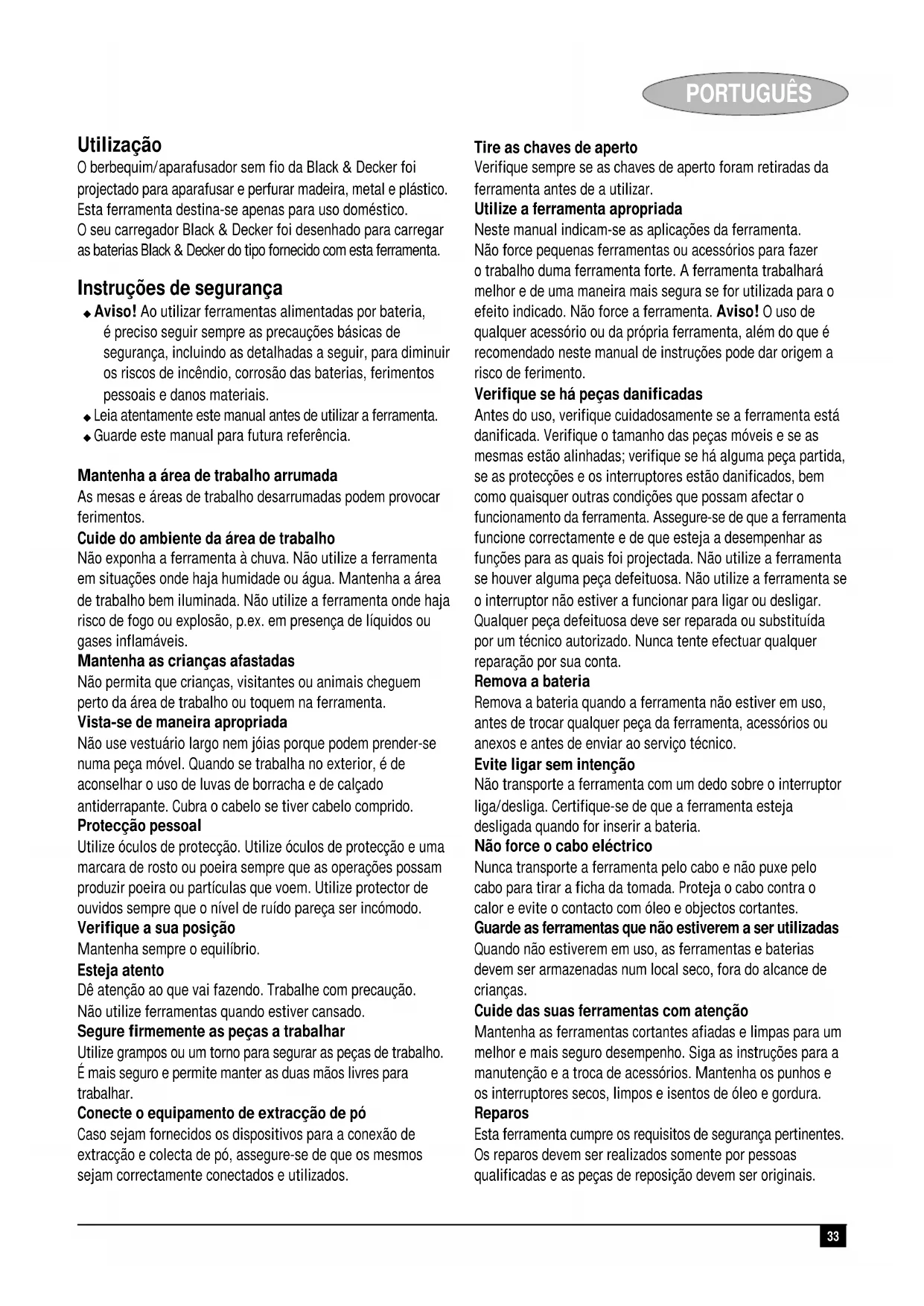 Colin Wills Director of Engineering BDCI, 4/F, 2 Dai Wang Street Tai Po Industrial Estate Tai Po NT, Hong Kong Garantía Black & Decker confía plenamente en la calidad de sus productos y ofrece una garantía extraordinaria. Esta declaración de garantía es una añadido, y en ningún caso un perjuicio para sus derechos estatutarios. La garantía es válida dentro de los territorios de los Estados Miembros de la Unión Europea y de los de la Zona Europea de Libre Comercio. Si un producto Black & Decker resultará defectuoso debido a materiales o mano de obra defectuosos o a la falta de conformidad, Black & Decker garantiza, dentro de los 24 meses de la fecha de compra, la sustitución de las piezas defectuosas, la reparación de los productos sujetos a un desgaste y rotura razonables o la sustitución de tales productos para garantizar al cliente el mínimo de inconvenientes, a menos que: ◆ El producto haya sido utilizado con propósitos comerciales, profesionales o de alquiler; ◆ El producto haya sido sometido a un uso inadecuado o negligente; ◆ El producto haya sufrido daños causados por objetos o sustancias extrañas o accidentes; ◆ Se hayan realizado reparaciones por parte de personas que no sean los servicios de reparación autorizados o personal de servicios de Black & Decker; Para reclamar en garantía, será necesario que presente la prueba de compra al vendedor o al servicio técnico de reparaciones autorizado. Pueden consultar la dirección de su servicio técnico más cercano poniéndose en contacto con la oficina local de Black & Decker en la dirección que se indica en este manual. Como alternativa, se puede consultar en Internet, en la dirección siguiente, la lista de servicios técnicos autorizados e información completa de nuestros servicios de postventa y contactos: www.2helpU.com.33 PORTUGUÊS Utilização O berbequim/aparafusador sem fio da Black & Decker foi projectado para aparafusar e perfurar madeira, metal e plástico. Esta ferramenta destina-se apenas para uso doméstico. O seu carregador Black & Decker foi desenhado para carregar as baterias Black & Decker do tipo fornecido com esta ferramenta. Instruções de segurança ◆ Aviso! Ao utilizar ferramentas alimentadas por bateria, é preciso seguir sempre as precauções básicas de segurança, incluindo as detalhadas a seguir, para diminuir os riscos de incêndio, corrosão das baterias, ferimentos pessoais e danos materiais. ◆ Leia atentamente este manual antes de utilizar a ferramenta. ◆ Guarde este manual para futura referência. Mantenha a área de trabalho arrumada As mesas e áreas de trabalho desarrumadas podem provocar ferimentos. Cuide do ambiente da área de trabalho Não exponha a ferramenta à chuva. Não utilize a ferramenta em situações onde haja humidade ou água. Mantenha a área de trabalho bem iluminada. Não utilize a ferramenta onde haja risco de fogo ou explosão, p.ex. em presença de líquidos ou gases inflamáveis. Mantenha as crianças afastadas Não permita que crianças, visitantes ou animais cheguem perto da área de trabalho ou toquem na ferramenta. Vista-se de maneira apropriada Não use vestuário largo nem jóias porque podem prender-se numa peça móvel. Quando se trabalha no exterior, é de aconselhar o uso de luvas de borracha e de calçado antiderrapante. Cubra o cabelo se tiver cabelo comprido. Protecção pessoal Utilize óculos de protecção. Utilize óculos de protecção e uma marcara de rosto ou poeira sempre que as operações possam produzir poeira ou partículas que voem. Utilize protector de ouvidos sempre que o nível de ruído pareça ser incómodo. Verifique a sua posição Mantenha sempre o equilíbrio. Esteja atento Dê atenção ao que vai fazendo. Trabalhe com precaução. Não utilize ferramentas quando estiver cansado. Segure firmemente as peças a trabalhar Utilize grampos ou um torno para segurar as peças de trabalho. É mais seguro e permite manter as duas mãos livres para trabalhar. Conecte o equipamento de extracção de pó Caso sejam fornecidos os dispositivos para a conexão de extracção e colecta de pó, assegure-se de que os mesmos sejam correctamente conectados e utilizados. Tire as chaves de aperto Verifique sempre se as chaves de aperto foram retiradas da ferramenta antes de a utilizar. Utilize a ferramenta apropriada Neste manual indicam-se as aplicações da ferramenta. Não force pequenas ferramentas ou acessórios para fazer o trabalho duma ferramenta forte. A ferramenta trabalhará melhor e de uma maneira mais segura se for utilizada para o efeito indicado. Não force a ferramenta. Aviso! O uso de qualquer acessório ou da própria ferramenta, além do que é recomendado neste manual de instruções pode dar origem a risco de ferimento. Verifique se há peças danificadas Antes do uso, verifique cuidadosamente se a ferramenta está danificada. Verifique o tamanho das peças móveis e se as mesmas estão alinhadas; verifique se há alguma peça partida, se as protecções e os interruptores estão danificados, bem como quaisquer outras condições que possam afectar o funcionamento da ferramenta. Assegure-se de que a ferramenta funcione correctamente e de que esteja a desempenhar as funções para as quais foi projectada. Não utilize a ferramenta se houver alguma peça defeituosa. Não utilize a ferramenta se o interruptor não estiver a funcionar para ligar ou desligar. Qualquer peça defeituosa deve ser reparada ou substituída por um técnico autorizado. Nunca tente efectuar qualquer reparação por sua conta. Remova a bateria Remova a bateria quando a ferramenta não estiver em uso, antes de trocar qualquer peça da ferramenta, acessórios ou anexos e antes de enviar ao serviço técnico. Evite ligar sem intenção Não transporte a ferramenta com um dedo sobre o interruptor liga/desliga. Certifique-se de que a ferramenta esteja desligada quando for inserir a bateria. Não force o cabo eléctrico Nunca transporte a