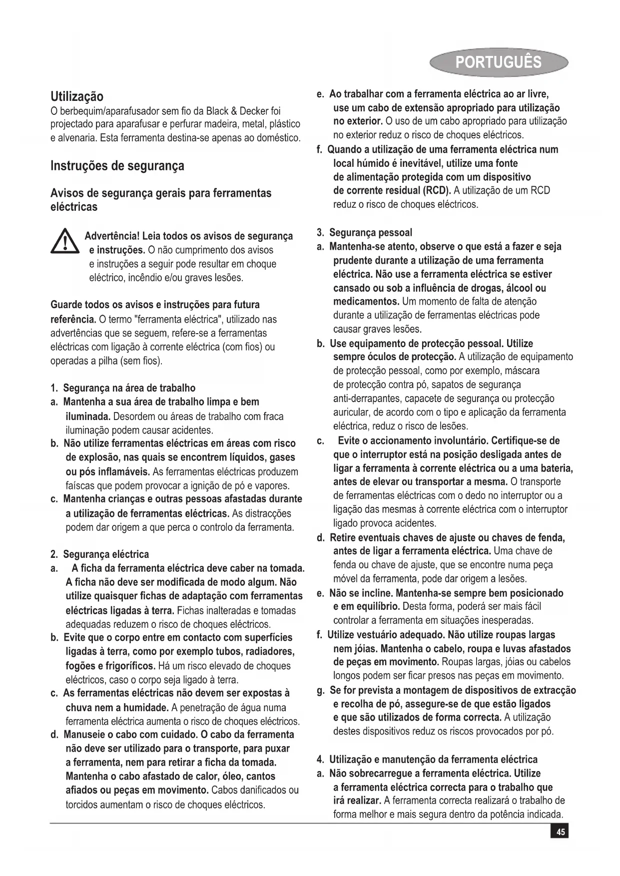 Advertência! Para reduzir o risco de ferimentos, o utilizador deve ler o manual de instruções. Instruções adicionais de segurança para baterias e carregadores Pilhas u Nunca tente abrir a bateria seja qual for a razão.u Não deixe que a bateria entre em contacto com a água.u Não armazene em locais onde a temperatura possa exceder 40 °C. u Carregue somente à temperatura ambiente, entre 10 °C e 40 °C. u Carregue somente utilizando o carregador fornecido com a ferramenta. u Quando se deszer das baterias, siga as instruções fornecidas na secção "Protecção do meio ambiente". Carregadores u Utilize seu carregador Black & Decker somente para carregar as baterias do tipo fornecido com a sua ferramenta. Outras baterias poderiam explodir, causando ferimentos pessoais e estragos. u Nunca tente carregar baterias não recarregáveis.u Substitua os cabos defeituosos imediatamente.u Não deixe que o carregador entre em contacto com a água. u Não abra o carregador.u Não submeta o carregador a testes.