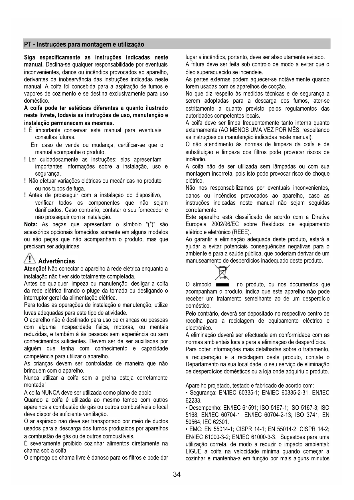 Si la iluminación no funciona, antes de llamar al servicio de asistencia técnica, controlar que las lámparas estén bien montadas en su sede.34 PT - Instruções para montagem e utilização Siga especificamente as instruções indicadas neste manual. Declina-se qualquer responsabilidade por eventuais inconvenientes, danos ou incêndios provocados ao aparelho, derivantes da inobservância das instruções indicadas neste manual. A coifa foi concebida para a aspiração de fumos e vapores de cozimento e se destina exclusivamente para uso doméstico. A coifa pode ter estéticas diferentes a quanto ilustrado neste livrete, todavia as instruções de uso, manutenção e instalação permanecem as mesmas. ! É importante conservar este manual para eventuais consultas futuras. Em caso de venda ou mudança, certificar-se que o manual acompanhe o produto. ! Ler cuidadosamente as instruções: elas apresentam importantes informações sobre a instalação, uso e segurança. ! Não efetuar variações elétricas ou mecânicas no produto ou nos tubos de fuga. ! Antes de prosseguir com a instalação do dispositivo, verificar todos os componentes que não sejam danificados. Caso contrário, contatar o seu fornecedor e não prosseguir com a instalação. Nota: As peças que apresentam o símbolo “(*)” são acessórios opcionais fornecidos somente em alguns modelos ou são peças que não acompanham o produto, mas que precisam ser adquiridas. Advertências Atenção! Não conectar o aparelho à rede elétrica enquanto a instalação não tiver sido totalmente completada. Antes de qualquer limpeza ou manutenção, desligar a coifa da rede elétrica tirando o pluge da tomada ou desligando o interruptor geral da alimentação elétrica. Para todas as operações de instalação e manutenção, utilize luvas adequadas para este tipo de atividade. O aparelho não é destinado para uso de crianças ou pessoas com alguma incapacidade fisica, motoras, ou mentais reduzidas, e também à às pessoas sem experiência ou sem conhecimentos suficientes. Devem ser de ser auxiliadas por alguém que tenha com conhecimento e capacidade competência para utilizar o aparelho. As crianças devem ser controladas de maneira que não brinquem com o aparelho. Nunca utilizar a coifa sem a grelha esteja corretamente montada! A coifa NUNCA deve ser utilizada como plano de apoio. Quando a coifa é utilizada ao mesmo tempo com outros aparelhos a combustão de gás ou outros combustíveis o local deve dispor de suficiente ventilação. O ar aspirado não deve ser transportado por meio de ductos usados para a descarga dos fumos produzidos por aparelhos a combustão de gás ou de outros combustíveis. É severamente proibido cozinhar alimentos diretamente na chama sob a coifa. O emprego de chama livre é danoso para os filtros e pode dar lugar a incêndios, portanto, deve ser absolutamente evitado. A fritura deve ser feita sob controlo de modo a evitar que o óleo superaquecido se incendeie. As partes externas podem aquecer-se notávelmente quando forem usadas com os aparelhos de cocção. No que diz respeito às medidas técnicas e de segurança a serem adoptadas para a descarga dos fumos, ater-se estritamente a quanto previsto pelos regulamentos das autoridades competentes locais. A coifa deve ser limpa frequentemente tanto interna quanto externamente (AO MENOS UMA VEZ POR MÊS, respeitando as instruções de manutenção indicadas neste manual). O não atendimento às normas de limpeza da coifa e de substituição e limpeza dos filtros pode provocar riscos de incêndio. A coifa não de ser utilizada sem lâmpadas ou com sua montagem incorreta, pois isto pode provocar risco de choque elétrico. Não nos responsabilizamos por eventuais inconvenientes, danos ou incêndios provocados ao aparelho, caso as instruções indicadas neste manual não sejam seguidas corretamente. Este aparelho está classificado de acordo com a Diretiva Europeia 2002/96/EC sobre Resíduos de equipamento elétrico e eletrónico (REEE). Ao garantir a eliminação adequada deste produto, estará a ajudar a evitar potenciais consequências negativas para o ambiente e para a saúde pública, que poderiam derivar de um manuseamento de desperdícios inadequado deste produto. O símbolo no produto, ou nos documentos que acompanham o produto, indica que este aparelho não pode receber um tratamento semelhante ao de um desperdício doméstico. Pelo contrário, deverá ser depositado no respectivo centro de recolha para a reciclagem de equipamento eléctrico e electrónico. A eliminação deverá ser efectuada em conformidade com as normas ambientais locais para a eliminação de desperdícios. Para obter informações mais detalhadas sobre o tratamento, a recuperação e a reciclagem deste produto, contate o Departamento na sua localidade, o seu serviço de eliminação de desperdícios domésticos ou a loja onde adquiriu o produto. Aparelho projetado, testado e fabricado de acordo com: