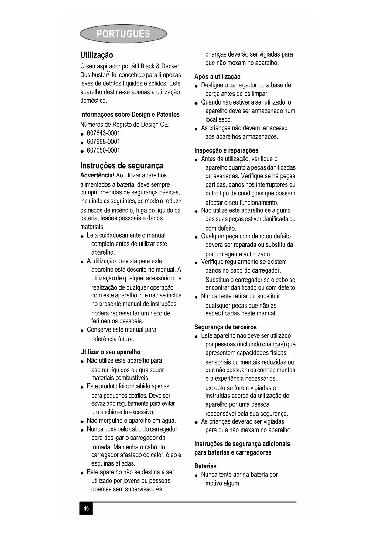 O seu aspirador portátil Black & Decker Dustbuster® FOI concebido para limpezas leves de detritos liquidos e solidos. Este aparecido destiná-se apenas a utilização domestica.