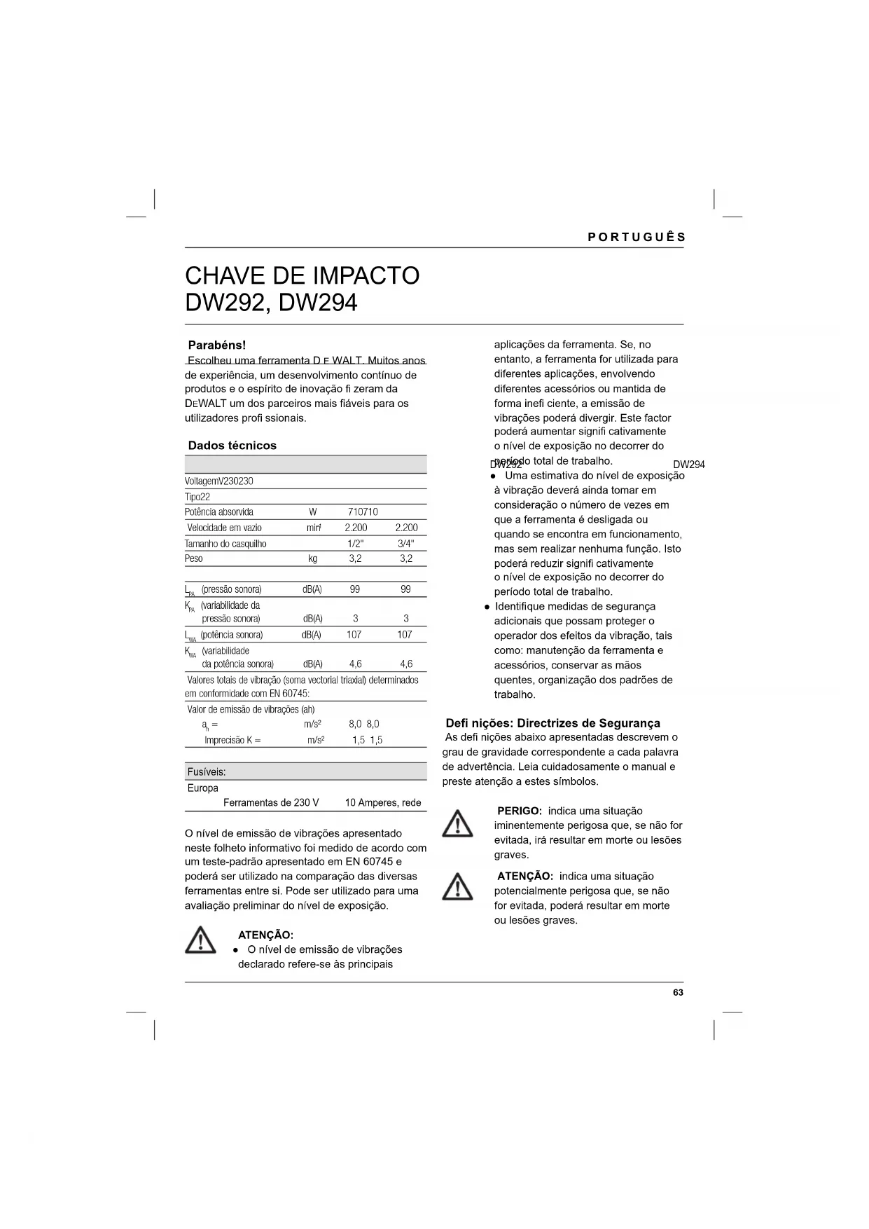 ATENÇÃO: Nunca modifi que a ferramenta eléctrica ou qualquer uma das suas peças. Podem ocorrer danos ou lesões. 1 Interruptor on/off 2 Selector de sentido de rotação 3 Bigorna 4 Casquilho Utilização A chave de impacto DW292, DW294 foi concebida para aplicações profi ssionais de chaves de fendas e colocação de porcas. NÃO utilize A ferramenta na presença de humidade ou de líquidos ou gases infl amáveis. Esta chave de impacto é uma ferramenta eléctrica profi ssional. NÃO permita que crianças mexam na ferramenta. É necessária supervisão quando operadores sem experiência utilizarem esta ferramenta. Segurança eléctrica O motor eléctrico foi concebido apenas para uma voltagem específica. Verifique sempre se a tensão da tomada de electricidade corresponde à voltagem indicada na placa com os requisitos de alimentação da ferramenta. A sua ferramenta da DEWALT possui isolamento duplo, em conformidade com a norma EN 60745. Por conseguinte, não é necessária qualquer ligação à terra Se o cabo de alimentação estiver danificado, este tem de ser substituído por um cabo especialmente preparado, disponível através dos centros de assistência da DEWALT. Utilizar uma extensão Se for necessário utilizar uma extensão, use uma extensão aprovada que seja adequada para a potência de alimentação desta ferramenta (consulte os dados técnicos). O diâmetro mínimo do fio condutor é 1 mm