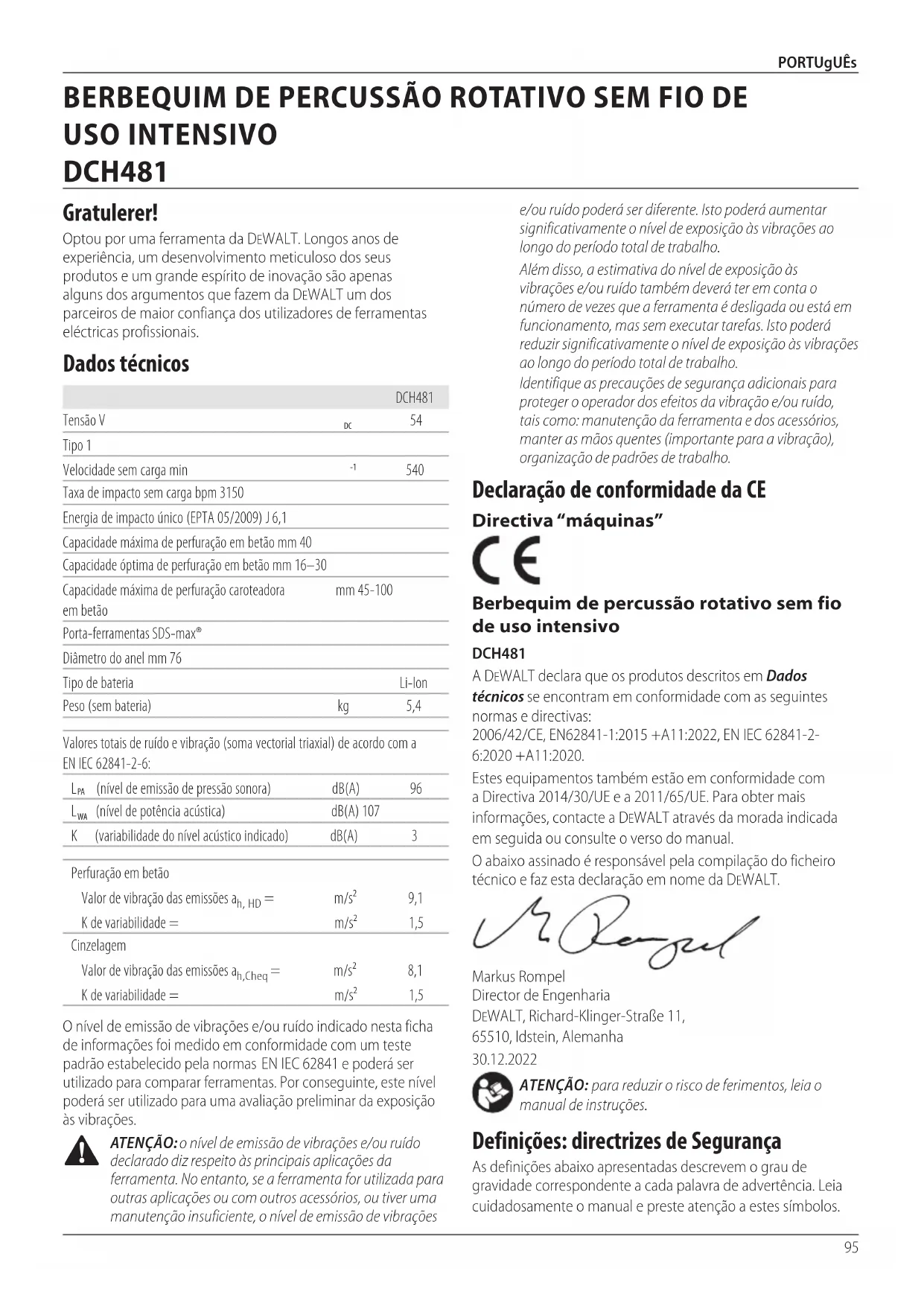 - Litium-ion celler kan gjenbrukes. Lever dem til forhandleren eller en lokal gjenbruksstasjon. De innleverte batteripakkene vil gjenbrukes eller avfallsbehandleskorrekt.95 PORTUgUês Declaração de conformidade da CE Directiva “máquinas” Berbequim de percussão rotativo sem fio de uso intensivo DCH481 A DeWALT declara que os produtos descritos em Dados técnicos se encontram em conformidade com as seguintes normas e directivas: 2006/42/CE, EN62841-1:2015 +A11:2022, EN IEC 62841-2- 6:2020 +A11:2020. Estes equipamentos também estão em conformidade com a Directiva 2014/30/UE e a 2011/65/UE. Para obter mais informações, contacte a DeWALT através da morada indicada em seguida ou consulte o verso domanual. O abaixo assinado é responsável pela compilação do ficheiro técnico e faz esta declaração em nome daDeWALT. Markus Rompel Director de Engenharia DeWALT, Richard-Klinger-Straße 11, 65510, Idstein, Alemanha