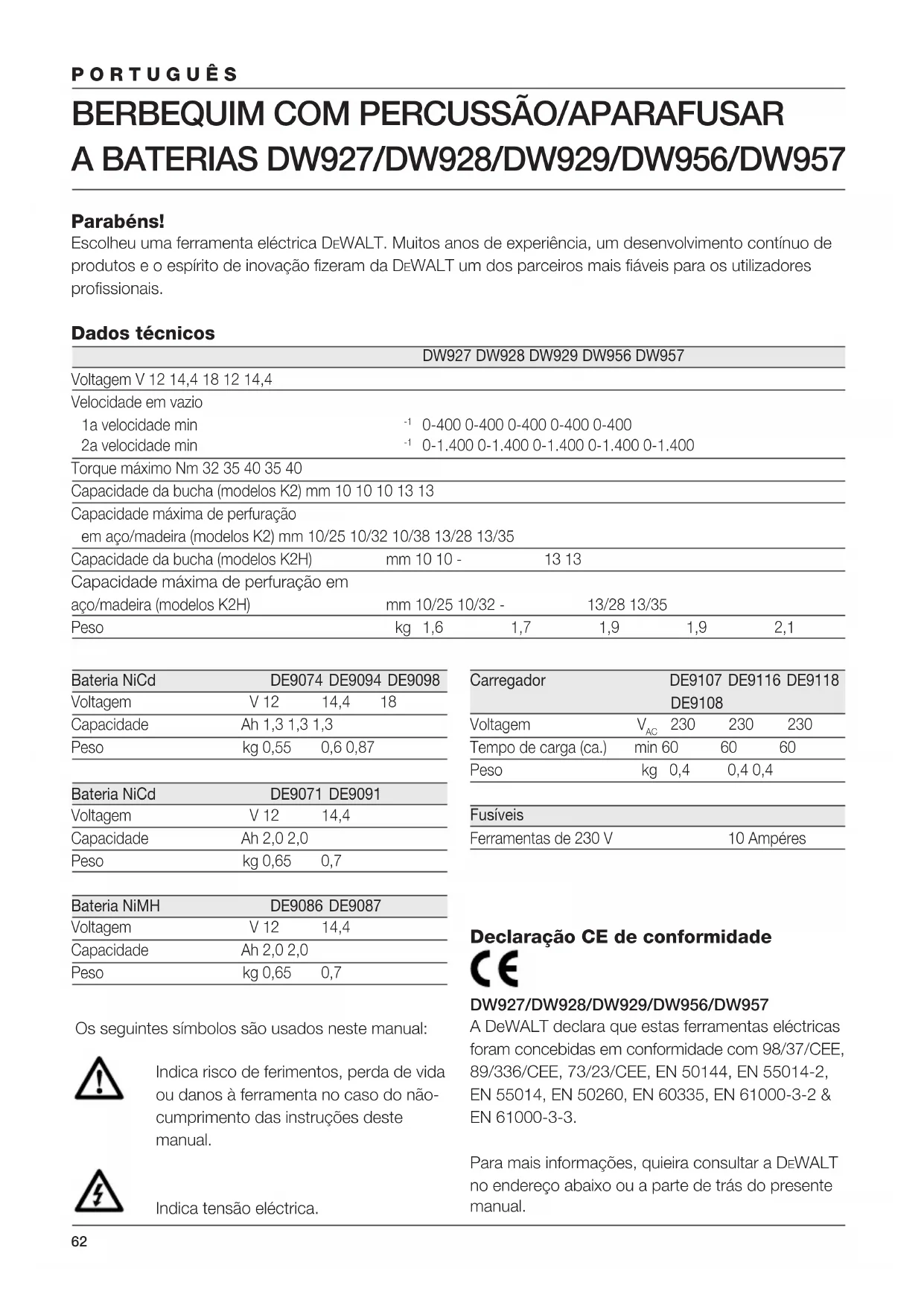Tempo de carga (ca.) min 60 60 60 Peso kg 0,4 0,4 0,4 Fusíveis Ferramentas de 230 V 10 Ampéres Os seguintes símbolos são usados neste manual: Indica risco de ferimentos, perda de vida ou danos à ferramenta no caso do não- cumprimento das instruções deste manual. Indica tensão eléctrica. Declaração CE de conformidade DW927/DW928/DW929/DW956/DW957 A DeWALT declara que estas ferramentas eléctricas foram concebidas em conformidade com 98/37/CEE, 89/336/CEE, 73/23/CEE, EN 50144, EN 55014-2, EN 55014, EN 50260, EN 60335, EN 61000-3-2 & EN 61000-3-3. Para mais informações, quieira consultar a DEWALT no endereço abaixo ou a parte de trás do presente manual.63 PORTUGUÊS DW927 DW928 DW929 DW956 DW957
