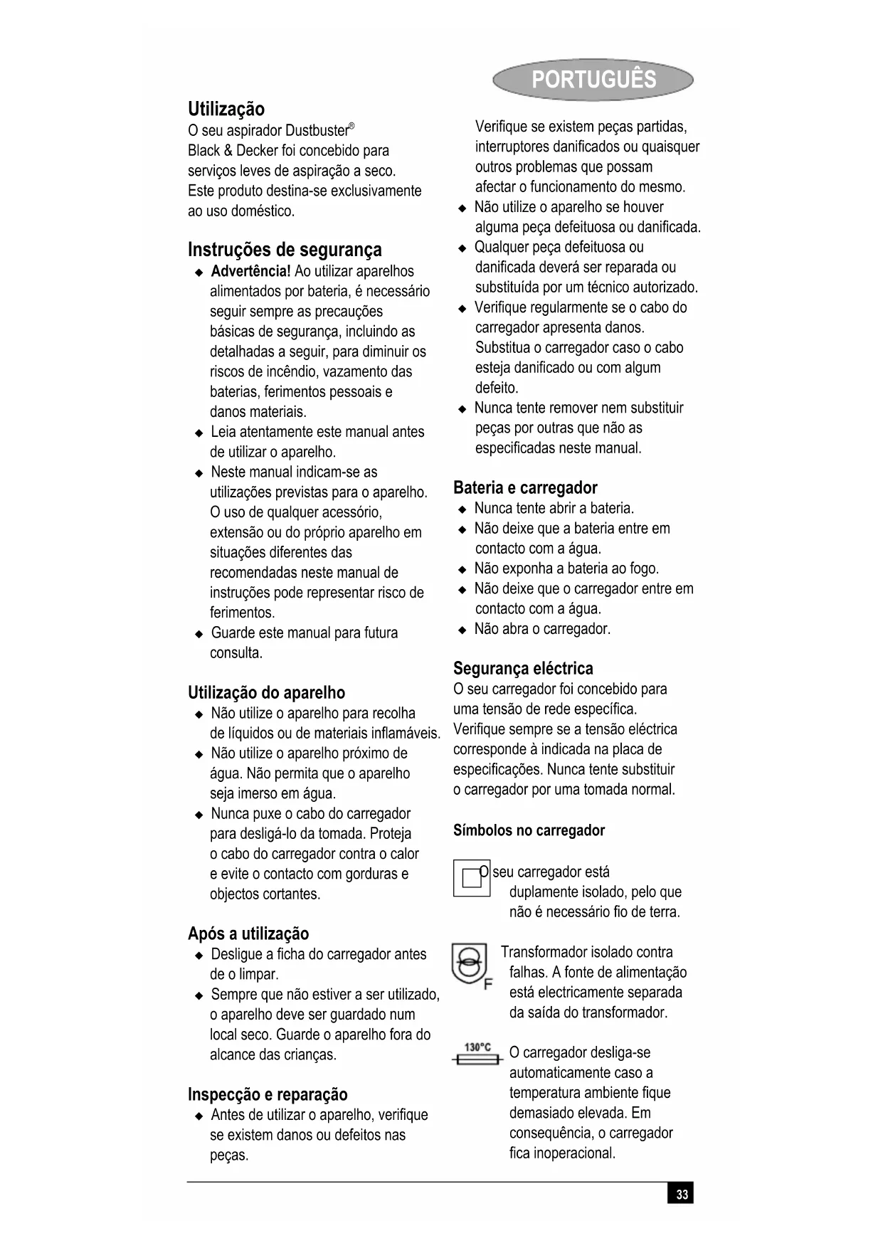 Black & Decker foi concebido para serviços leves de aspiração a seco. Este produto destina-se exclusivamente ao uso doméstico. Instruções de segurança Advertência! Ao utilizar aparelhos alimentados por bateria, é necessário seguir sempre as precauções básicas de segurança, incluindo as detalhadas a seguir, para diminuir os riscos de incêndio, vazamento das baterias, ferimentos pessoais e danos materiais. Leia atentamente este manual antes de utilizar o aparelho. Neste manual indicam-se as utilizações previstas para o aparelho. O uso de qualquer acessório, extensão ou do próprio aparelho em situações diferentes das recomendadas neste manual de instruções pode representar risco de ferimentos. Guarde este manual para futura consulta. Utilização do aparelho Não utilize o aparelho para recolha de líquidos ou de materiais inflamáveis. Não utilize o aparelho próximo de água. Não permita que o aparelho seja imerso em água. Nunca puxe o cabo do carregador para desligá-lo da tomada. Proteja o cabo do carregador contra o calor e evite o contacto com gorduras e objectos cortantes. Após a utilização Desligue a ficha do carregador antes de o limpar. Sempre que não estiver a ser utilizado, o aparelho deve ser guardado num local seco. Guarde o aparelho fora do alcance das crianças. Inspecção e reparação Antes de utilizar o aparelho, verifique se existem danos ou defeitos nas peças. Verifique se existem peças partidas, interruptores danificados ou quaisquer outros problemas que possam afectar o funcionamento do mesmo. Não utilize o aparelho se houver alguma peça defeituosa ou danificada. Qualquer peça defeituosa ou danificada deverá ser reparada ou substituída por um técnico autorizado. Verifique regularmente se o cabo do carregador apresenta danos. Substitua o carregador caso o cabo esteja danificado ou com algum defeito. Nunca tente remover nem substituir peças por outras que não as especificadas neste manual. Bateria e carregador Nunca tente abrir a bateria. Não deixe que a bateria entre em contacto com a água. Não exponha a bateria ao fogo. Não deixe que o carregador entre em contacto com a água. Não abra o carregador. Segurança eléctrica O seu carregador foi concebido para uma tensão de rede específica. Verifique sempre se a tensão eléctrica corresponde à indicada na placa de especificações. Nunca tente substituir o carregador por uma tomada normal. Símbolos no carregador