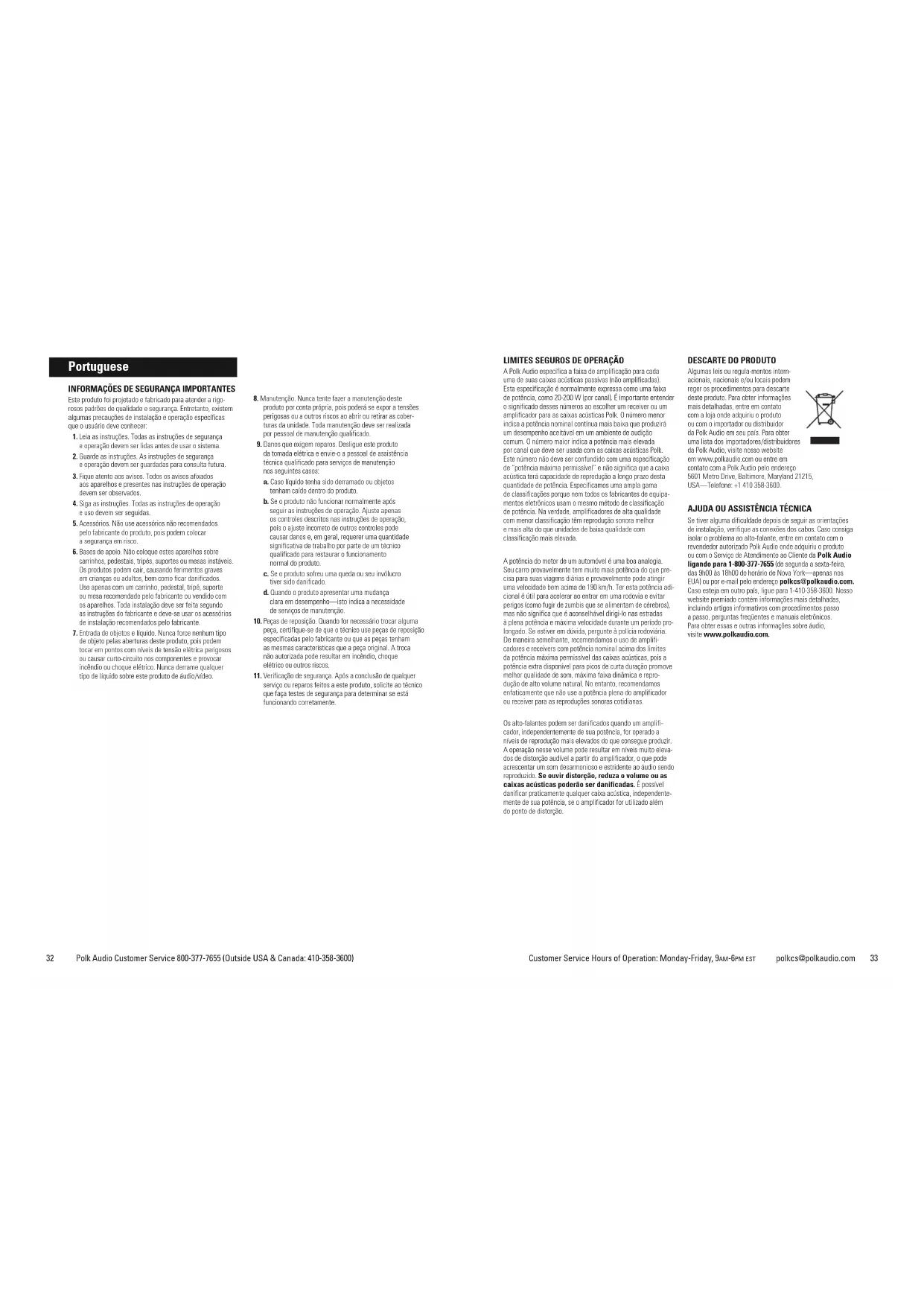 Algumas leis ou regula-mentos intern- acionais, nacionais e/ou locais podem reger os procedimentos para descarte deste produto. Para obter informações mais detalhadas, entre em contato com a loja onde adquiriu o produto ou com o importador ou distribuidor da Polk Audio em seu país. Para obter uma lista dos importadores/distribuidores da Polk Audio, visite nosso website em www.polkaudio.com ou entre em contato com a Polk Audio pelo endereço 5601 Metro Drive, Baltimore, Maryland 21215, USA—Telefone: +1 410 358-3600.