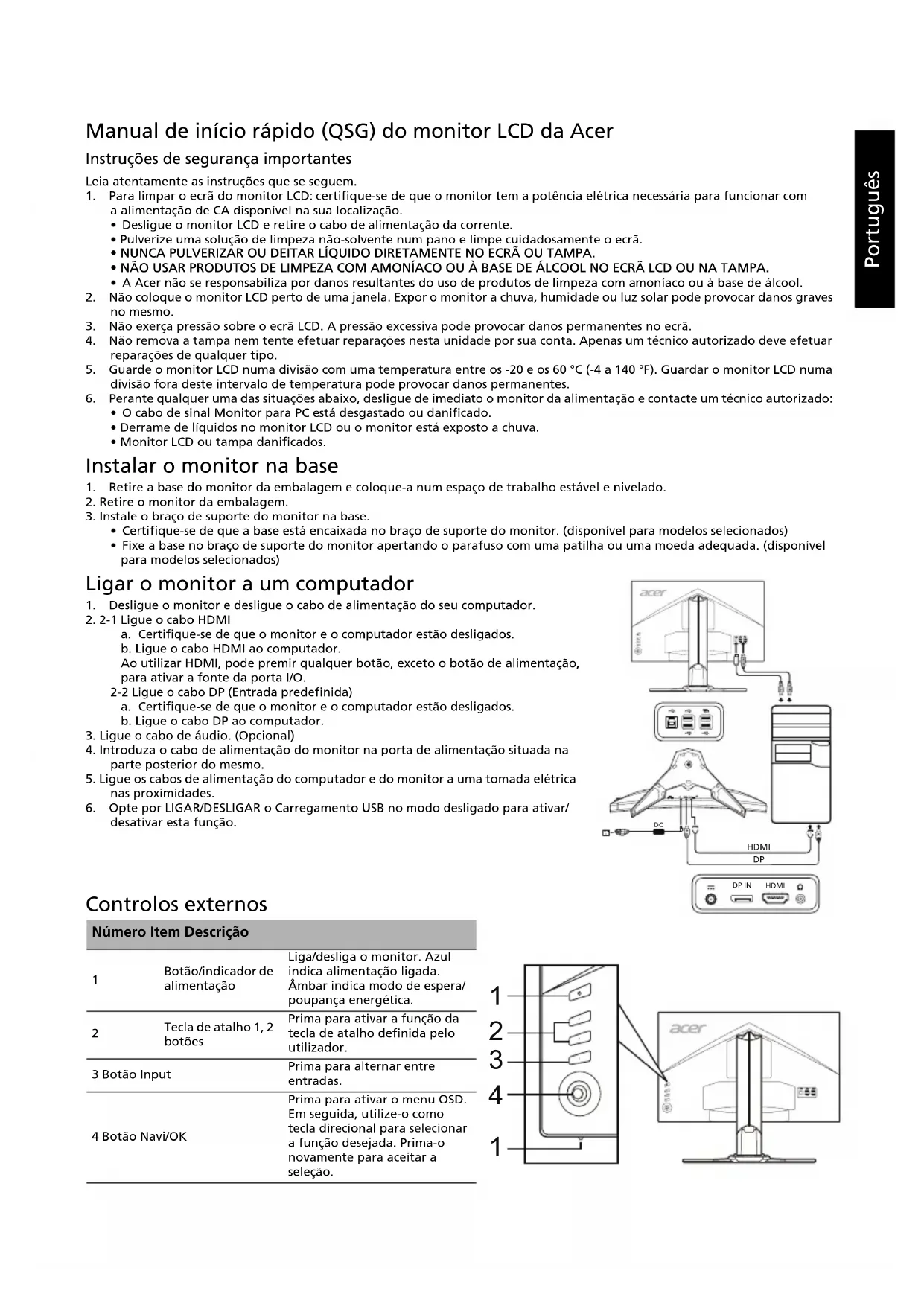 nVidia 3D Light Boost Przezroczystość Tryb szeroki Wejście Przypis. przyc. skrótu Tryb szyb. uruch Tryby Over Clock (wyłącznie DP) Wyświetlanie informacji Resetuj Zakończ Wszystkie dane techniczne mogą ulec zmianie bez powiadomienia.Português Manual de início rápido (QSG) do monitor LCD da Acer Instruções de segurança importantes Leia atentamente as instruções que se seguem. 1. Para limpar o ecrã do monitor LCD: certifique-se de que o monitor tem a potência elétrica necessária para funcionar com a alimentação de CA disponível na sua localização.