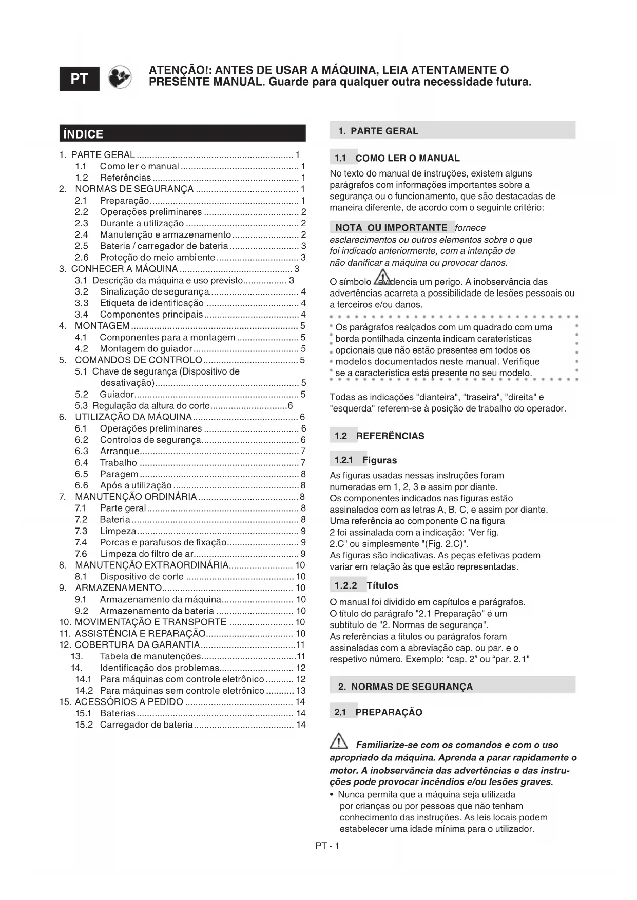 IMPORTANTE IMPORTANTE As seguintes normas de segurança integram as recomendações de segurança presentes no manual especíco da bateria e do carregador de bateria anexado à máquina.